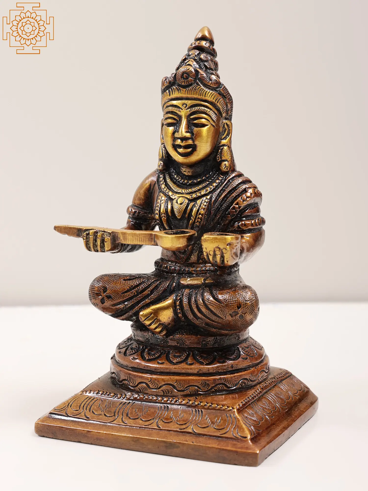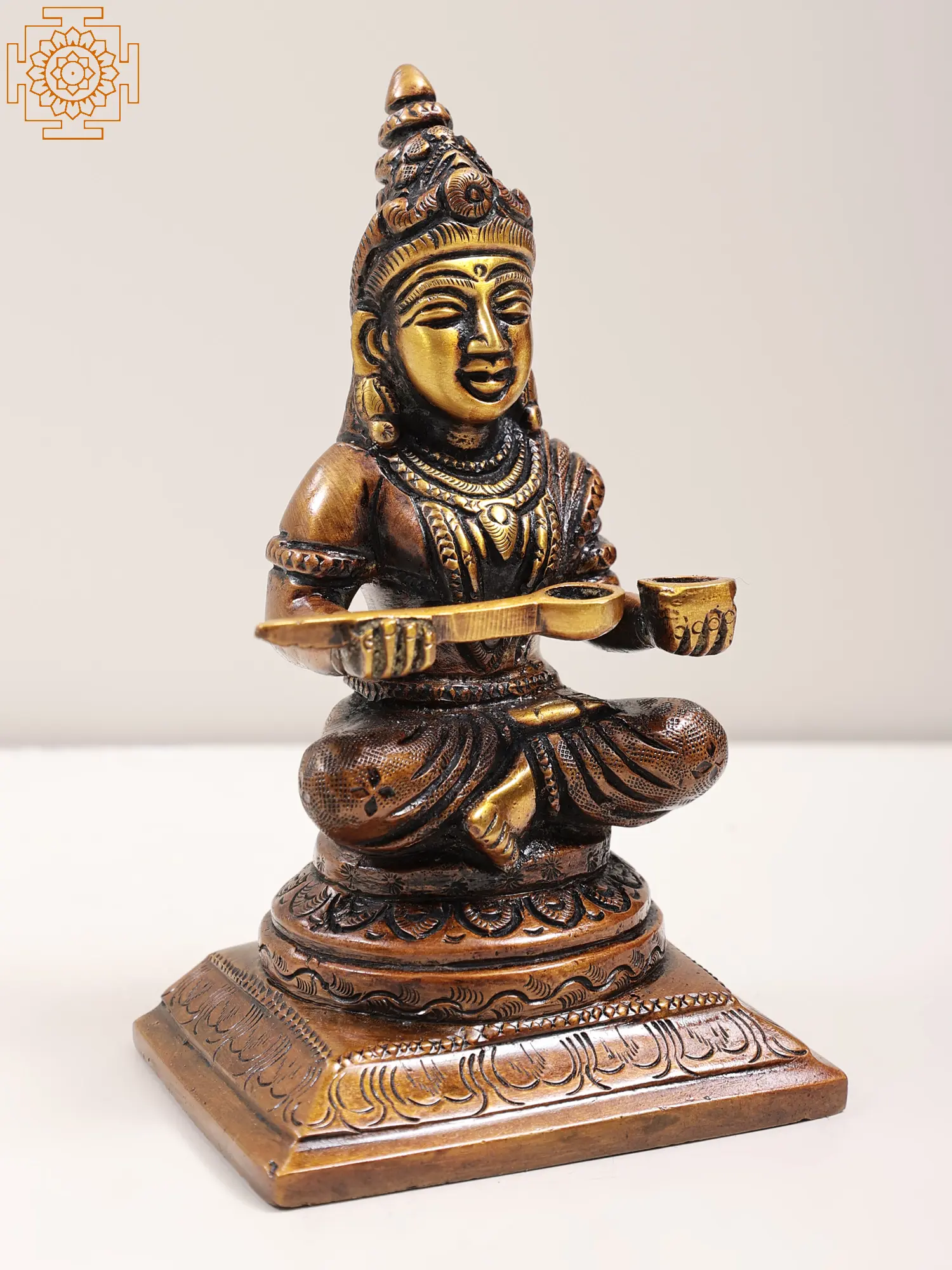 Annapurna- she who fulfills (purna) the human need for nourishment (through anna or foodgrain), is a divinely benevolent aspect of the supreme mother goddess. She is revered by her devotees to ensure her nurturing presence in life, which protects them from disease, hunger, and negative energies that weaken the body. In this brass statue, Maa Annapurna appears in her characteristic form, wrapped in a beautiful saree, wearing queenly ornaments and a crown, and seated on a lotus throne. In her hand is the bowl and the ladle with which she distributes her sweet Prasada, and on her countenance is a blissful smile, which invigorates the body as well as the mind of the Bhakta.