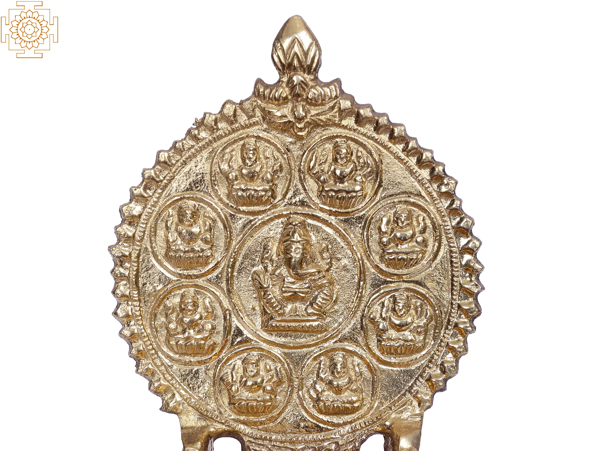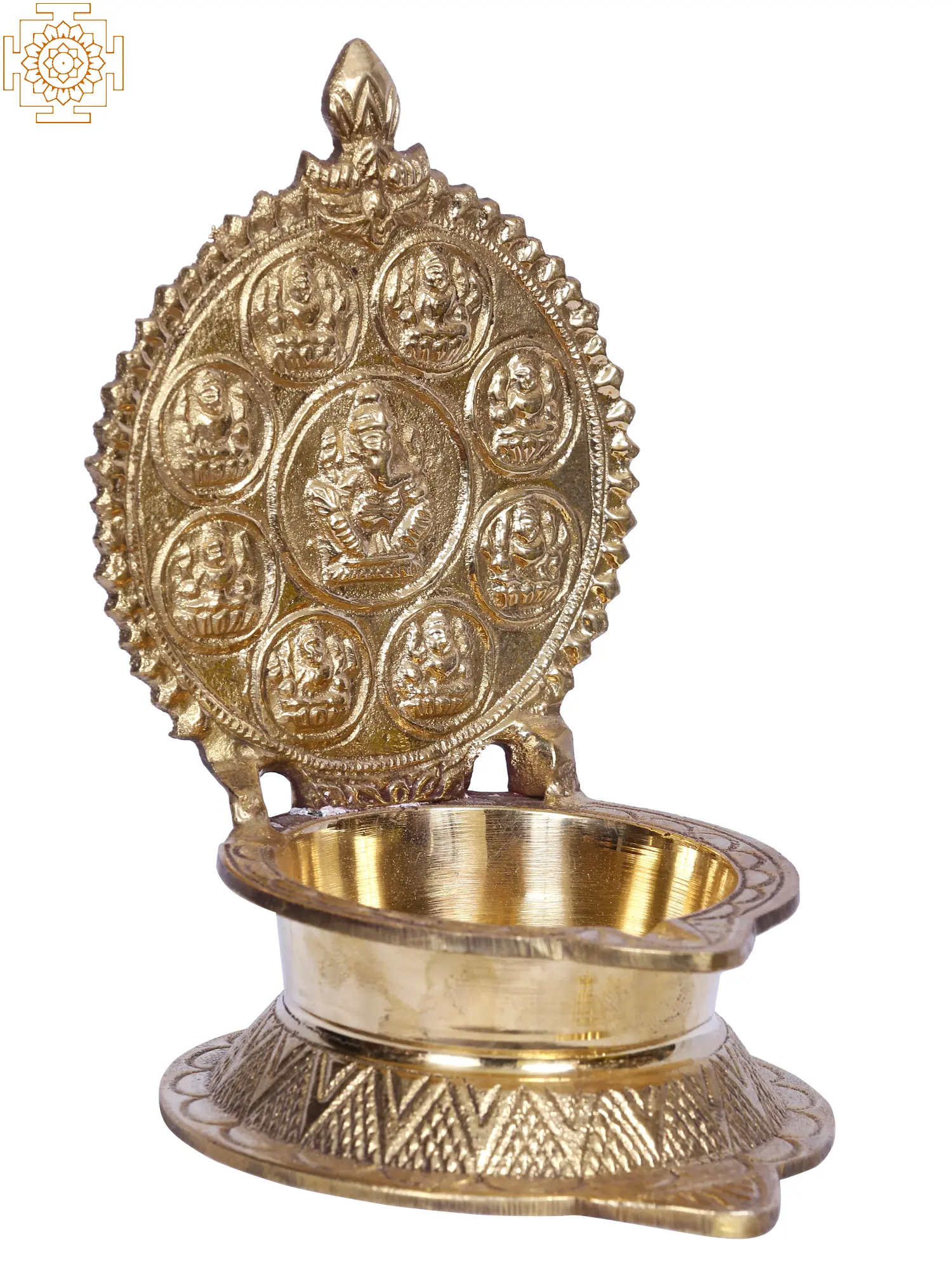 Goddess Lakshmi rules over eight different types of riches: "wealth" in the context of Ashta-Lakshmi refers to prosperity, good health, wisdom, strength, offspring, and power. The eight types of riches are represented in the lamp by eight forms of the Goddess, with a focal picture of the goddess surrounded by all other forms, the depiction follows the Agama Veda description of the goddess. The lamp is composed of brass and has a royal gleam to it. These are traditional lamps created using ancient casting techniques. It includes a deep oil pan and a single wick. It is said that lighting this lamp attracts all sorts of money and prosperity into a home.