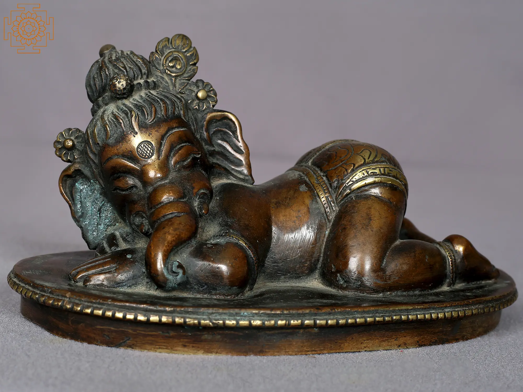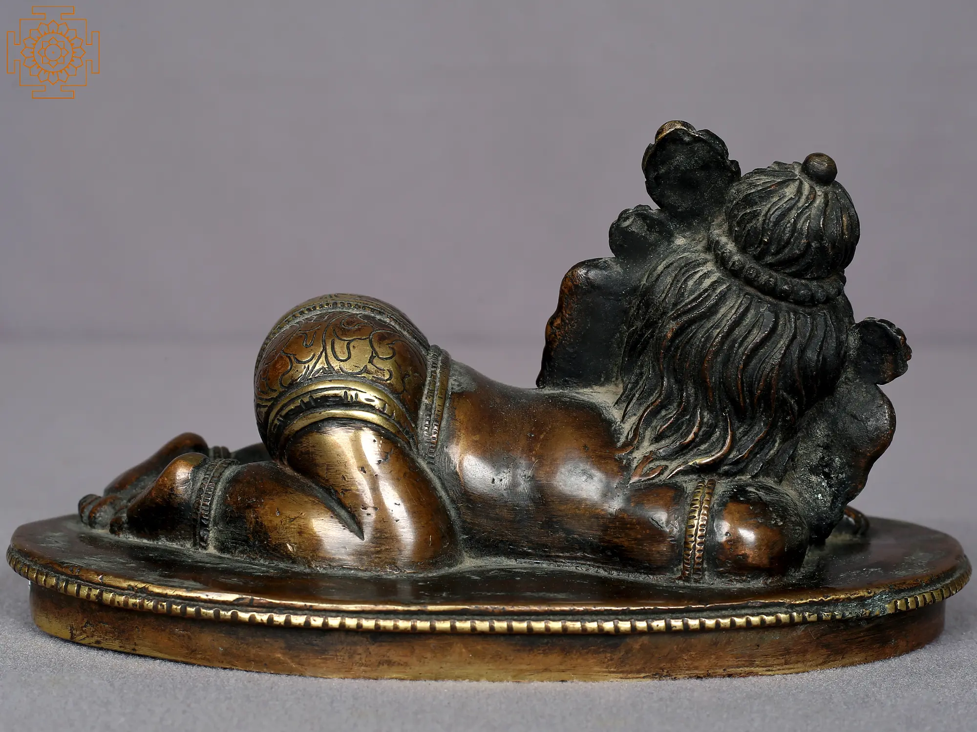 With his adorable face resting on his hands, Baal-Ganesha, or baby Ganesha, appears to be dozing off peacefully like a toddler. He is positioned on an ovular foundation. A lovely representation of the cultural interchange between Ganesha and Krishna as well as between India and Nepal, this brass statue is a piece of art worthy of adorning your space with its aesthetic richness.