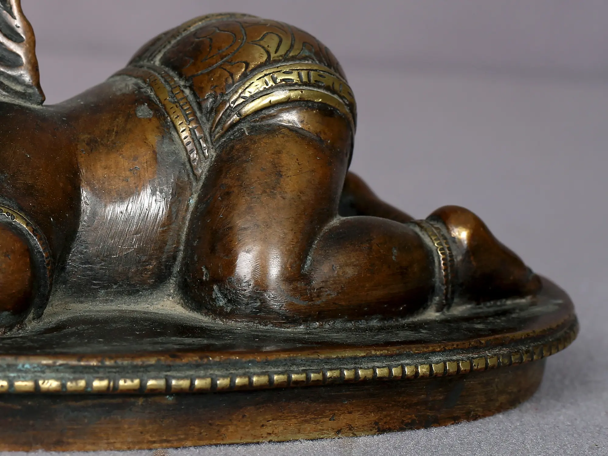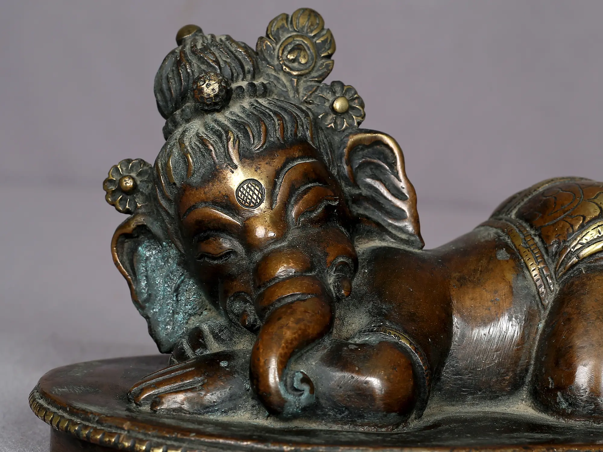 In Hindu cosmology, the younger and ever-benevolent son of Shiva and Parvati is an enduringly holy being. He takes on the role of a protector in the Newar (Nepal) culture, watching after the lives and possessions of the believers. But instead of the typical Baal-Krishna or baby Krishna statues with Mayura pankh mukuta (crown of peacock feather), juda (hairdo), langot (short dhoti), and paayal (anklet), this brass statue from Nepal depicts baby Ganesha with the attributes, a lovely exchange of features between the two adored child-gods of Hinduism.