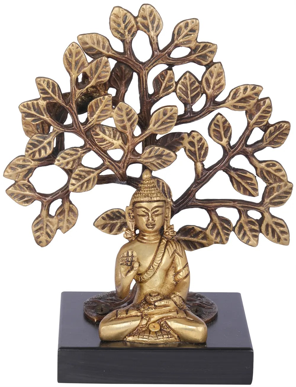 The Bodhi tree behind Him is the distinguishing aspect of this seated Buddha figurine. It towers above Him, having branched out in a way that forms a wide-set canopy. The same is defined by a multitude of large leaves with pronounced venation on each.