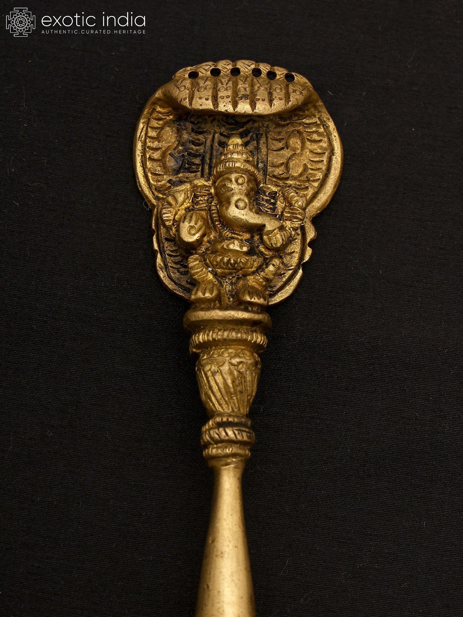 At the apex of this ritual spoon resides the beloved elephant-headed deity, Ganesha. In Hindu mythology, Ganesha is revered as the remover of obstacles, the patron of arts and sciences, and the deva of intellect and wisdom. Devotees often invoke his blessings at the start of new ventures, seeking his guidance to overcome challenges and achieve success. Ganesha is usually depicted with a large belly which represents generosity and acceptance, and a single tusk which symbolizes one-pointedness of mind and ability to overcome any obstacle. His presence on this piece imbues it with a potent energy of auspiciousness and protection.