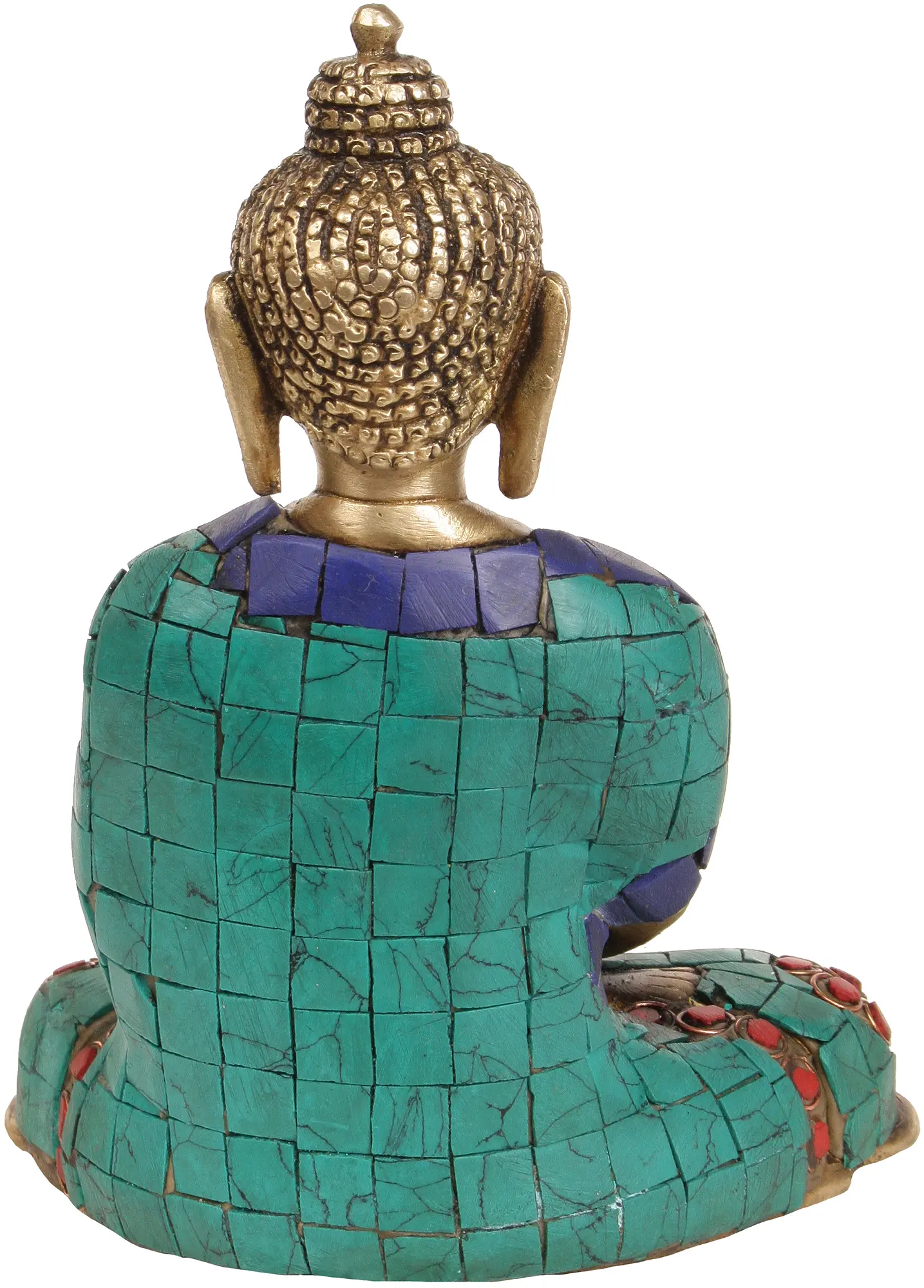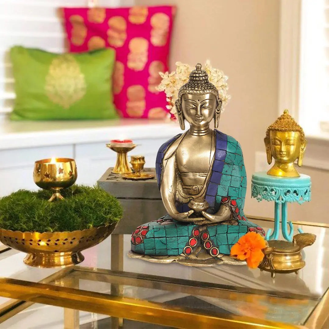 This brass sculpture showcases Lord Buddha in the meditative Dhyana Mudra, the gesture that signifies profound concentration and connection with one's inner self. Adorned with inlay work that seamlessly marries tradition with innovation - the glistening fragments of precious metals and stones are skillfully interwoven, forming intricate patterns that dance across the surface like whispers of devotion. With every glance, the play of light on these meticulously placed inlays creates a mesmerising tapestry that echoes the sublime aura of enlightenment.