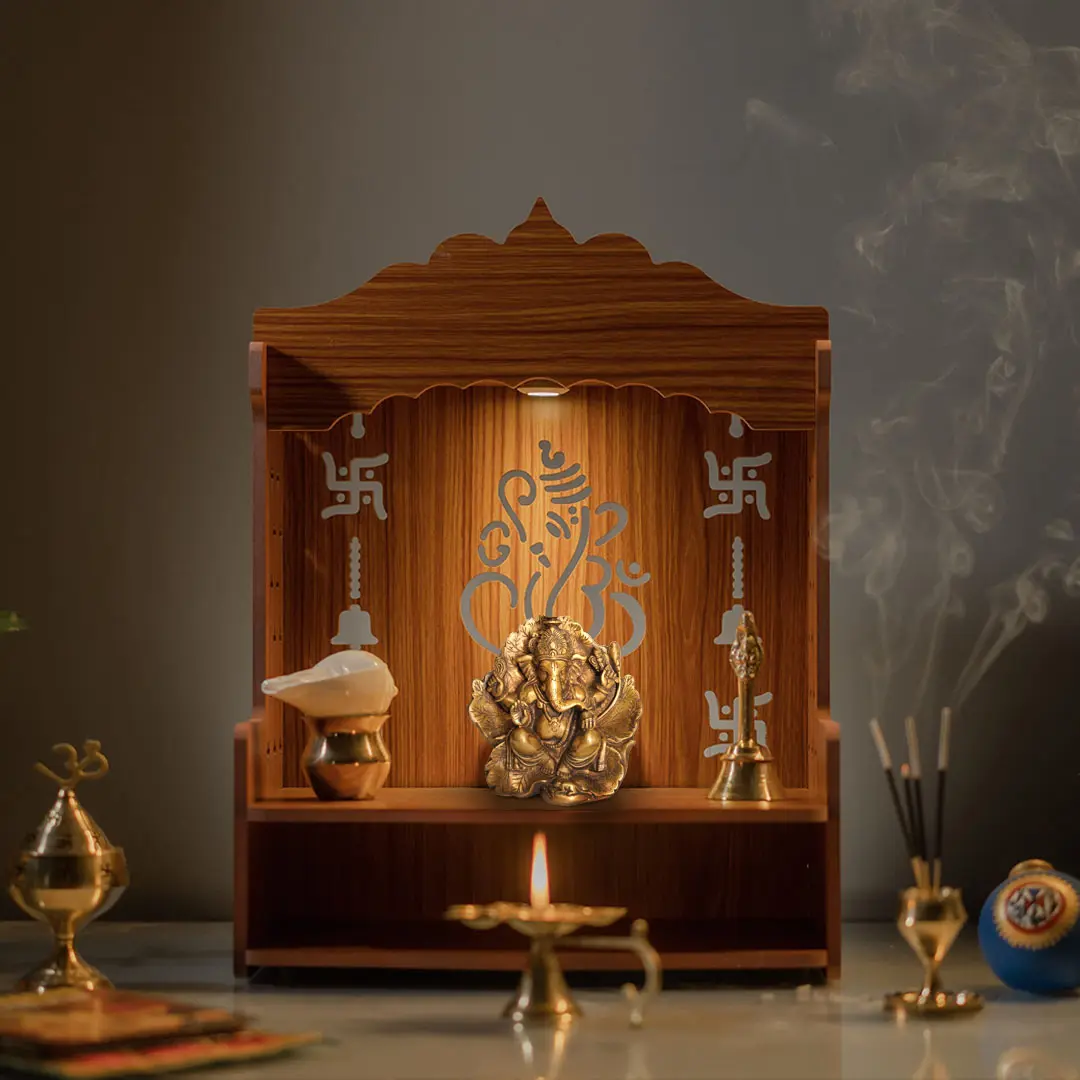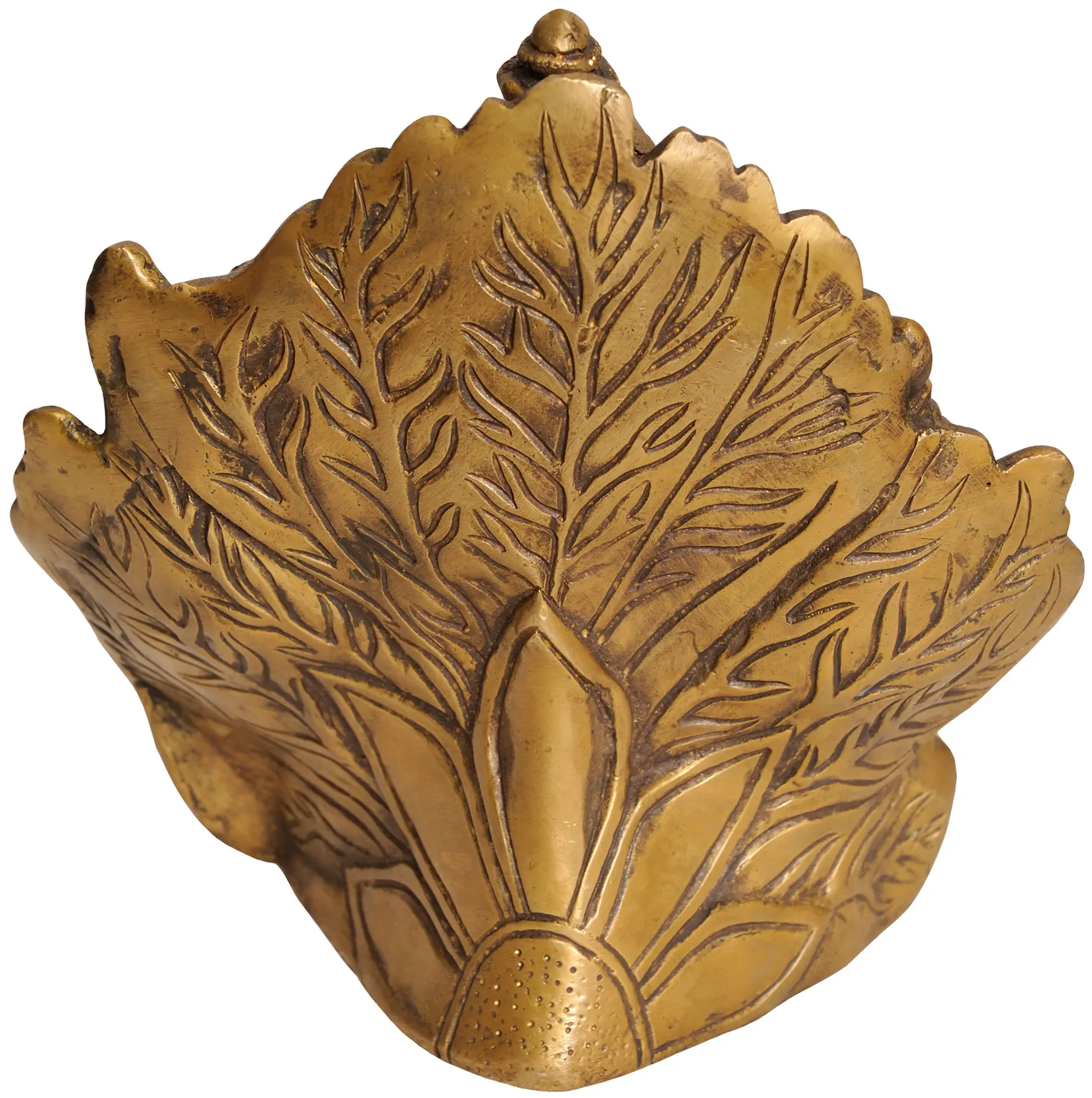 Lord Ganesha, seated on a leaf couch, symbolises his adaptability and his ability to find comfort in simple and natural settings. The portrayal becomes a beautiful blend of spirituality and nature's beauty, reflecting Ganesha's close connection to the world around him. As light dances upon its surface, the Brass Lord Ganesha seated on a leaf couch emanates a soft, golden glow, inviting you to meditate upon the teachings of adaptability and the joy that Ganesha brings.