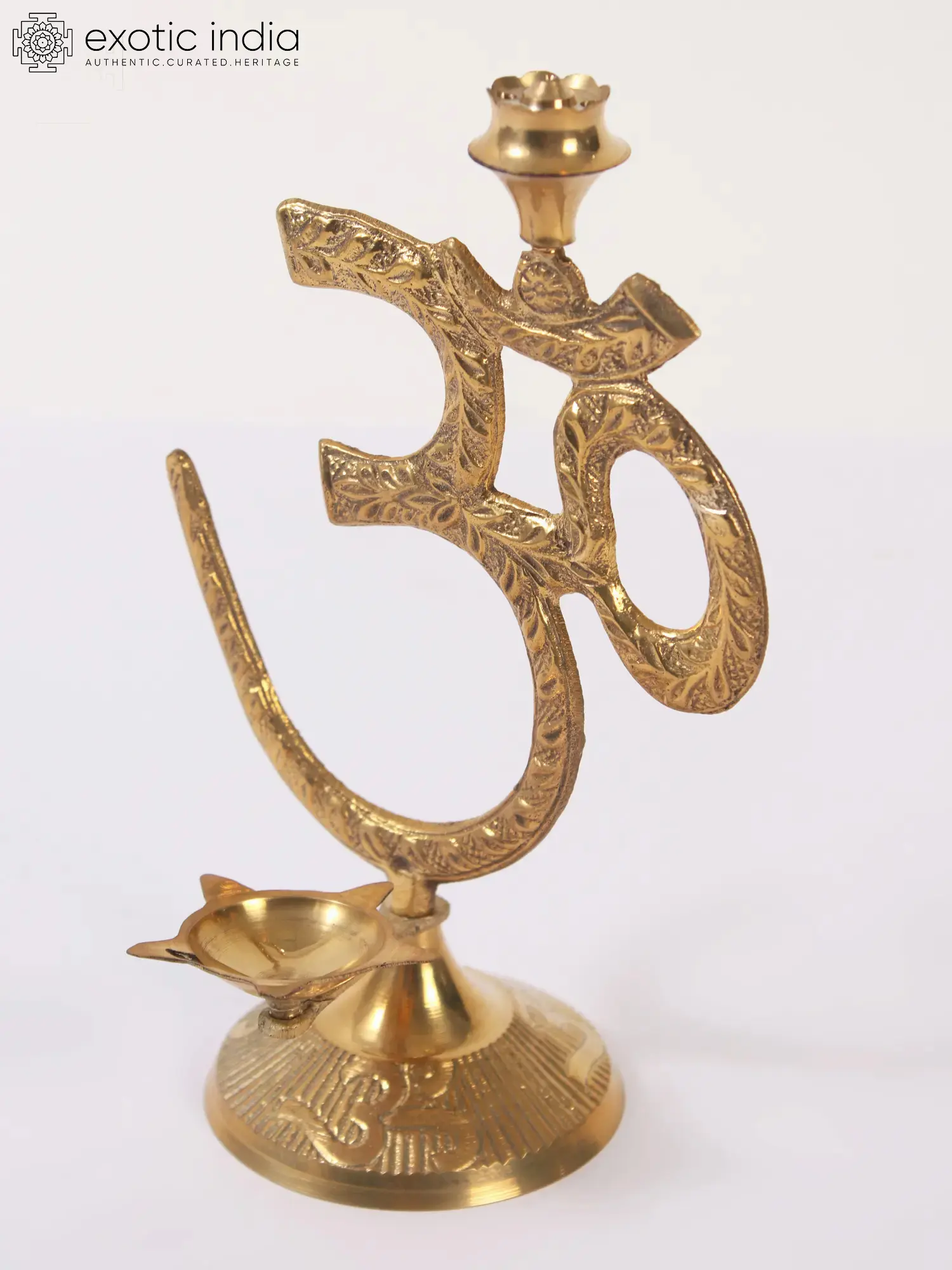 This metal lamp with an Om (Aum) symbol as the crown picture combines heavenly melody and divine warmth, both essential for spiritual awakening. The lamp is made of high-quality brass and features a five-wick oil basin attached to the bottom of the Om sign and an incense stand attached to the top of the symbol. It is a clever method of combining sound and light energy and employing it to erase a negative aura.