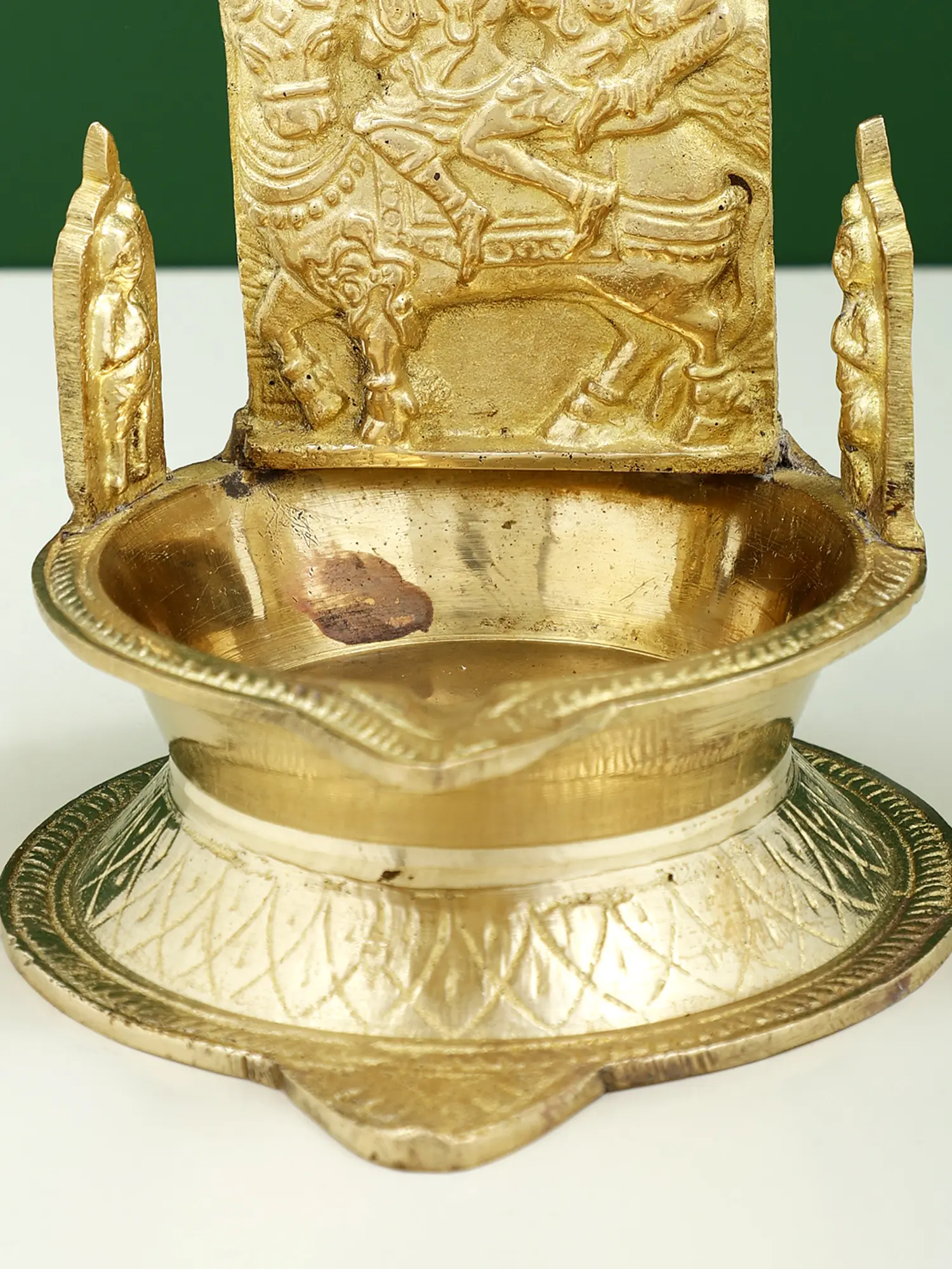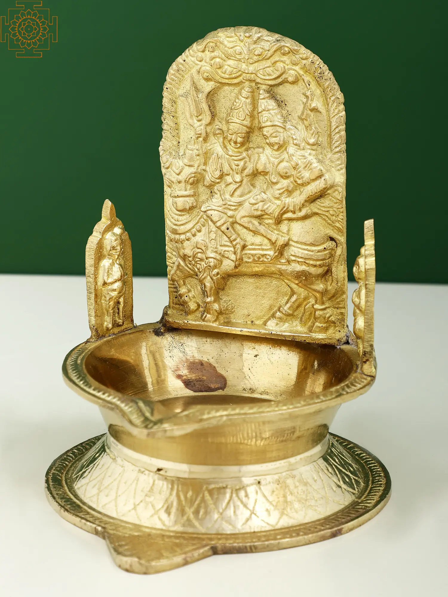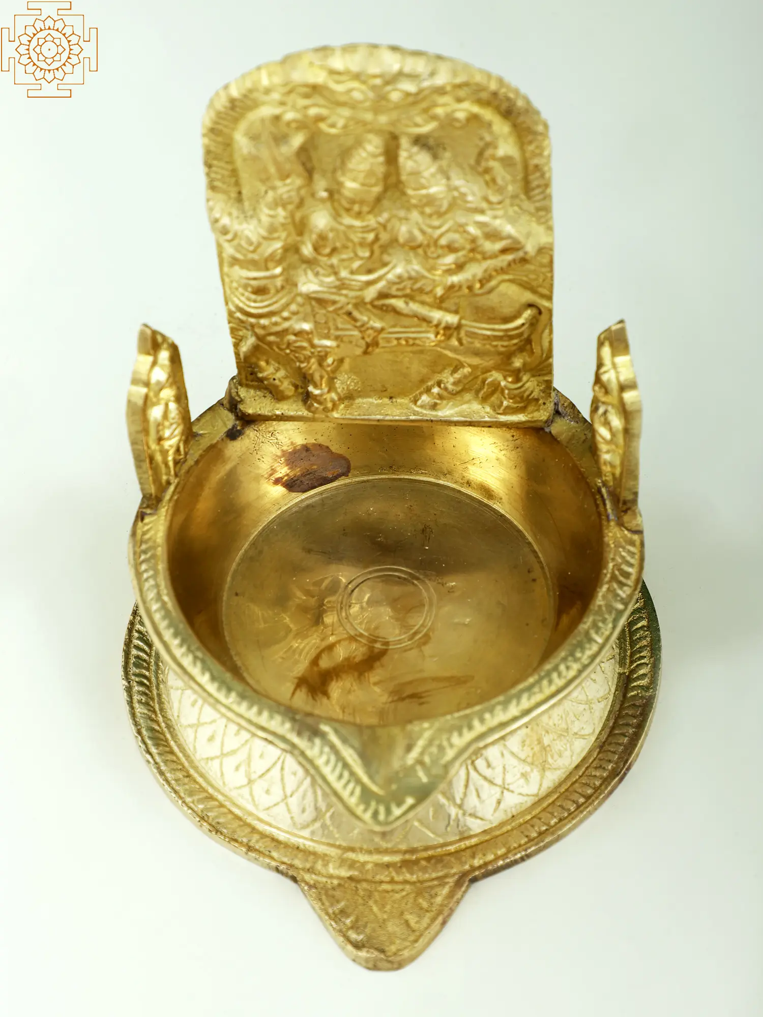 This brass Vilakku with a crown depicting Shiva and Parvati is a tribute to the cosmic marriage of Prakriti and Purush. By lighting this lamp, one can express gratitude to Lord Shiva and Goddess Shivaa (Uma), who provide quick comfort in trying times. Both wear the garland made of Vilwa leaves and Jasmine flowers and are pictured reclining close to each other lost in marital bliss. They are the ones that exude abundant tranquility. Lighting this lamp may offer peace and harmony to the couple and fill their house with joy.