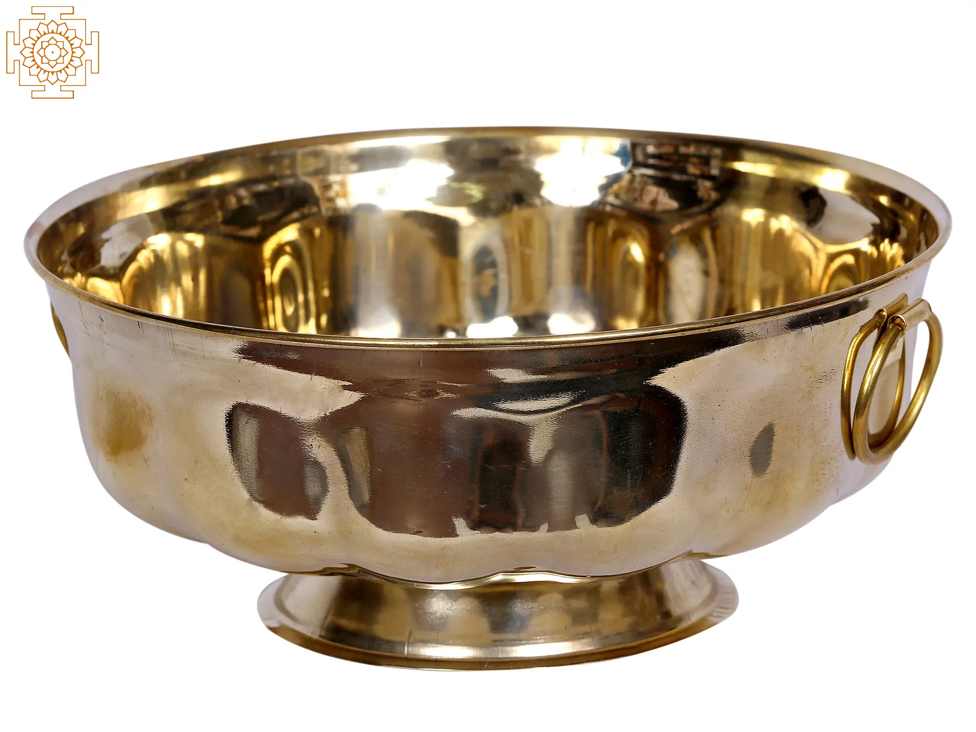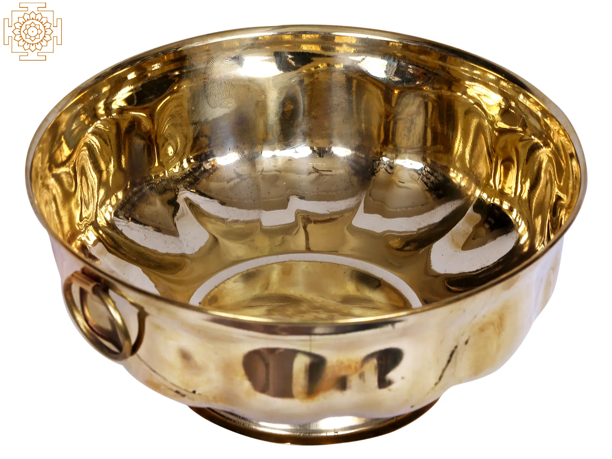 Skilled artisans heat and mold the brass into the desired shape using traditional hammering, casting, and engraving methods. This Urli is constructed of brass and has a royal golden surface with a bloated petal structure on the body. It has two handles on both sides that serve as a means of transporting the Urli as well as the item's only design element. This Urli is inspired by the oldest Urli patterns. This basic design object is intended to draw attention and add a feeling of grandeur to any place, whether in a home, gallery, or event venue.