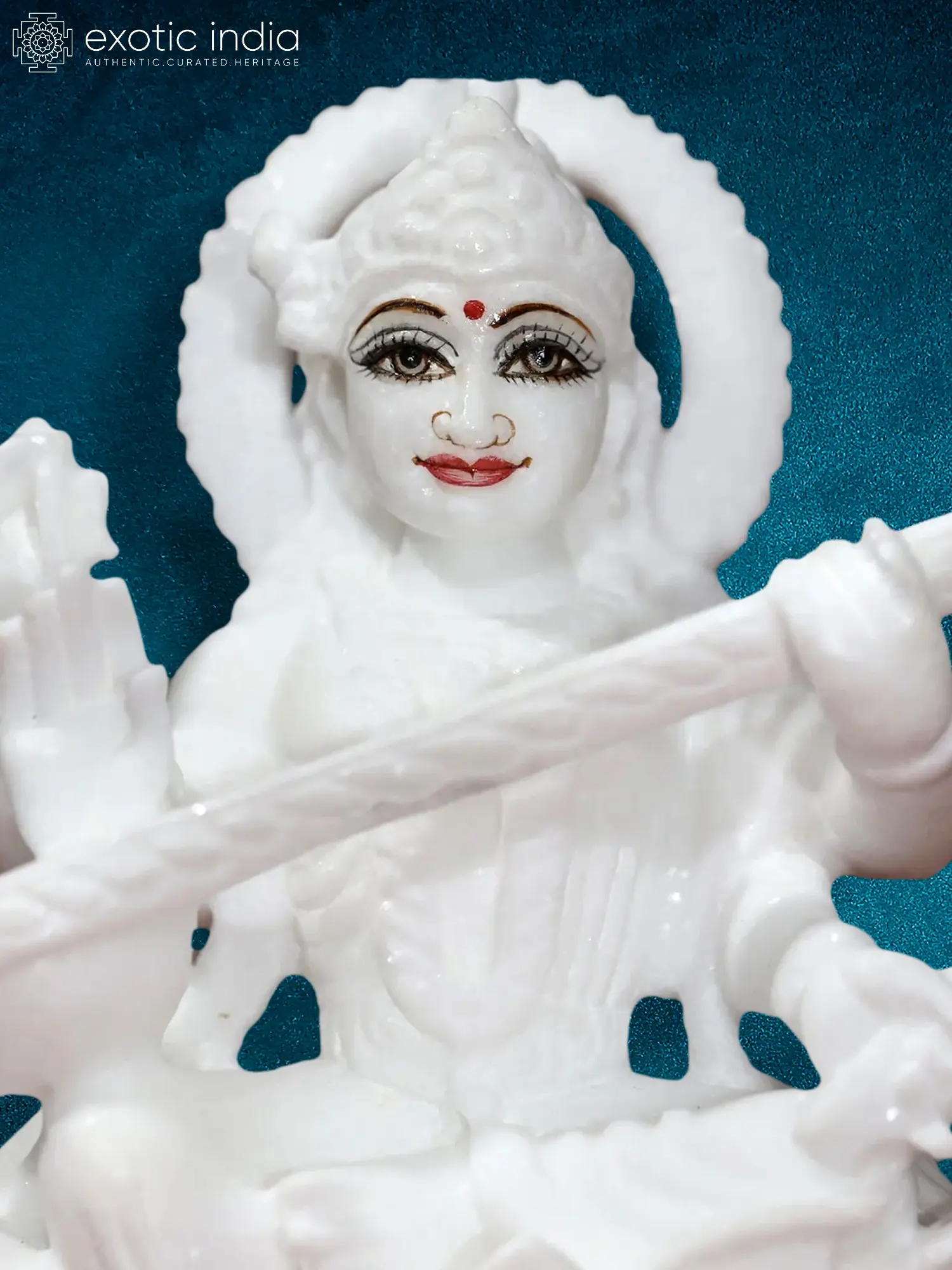 9" Goddess Saraswati Seated Posture On Kamalasana | Super White Makrana Marble Idol