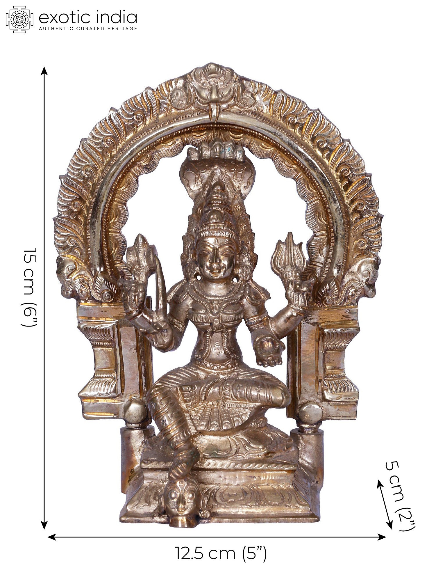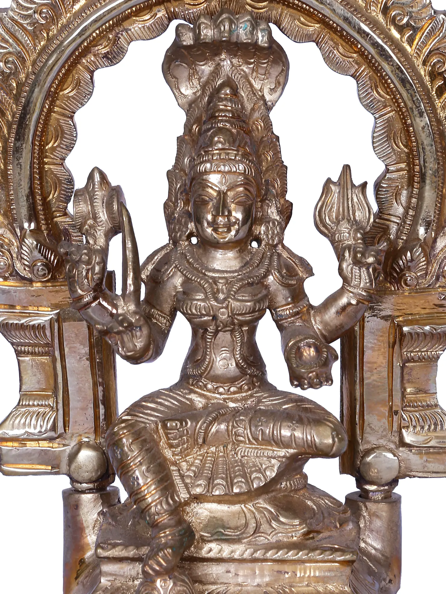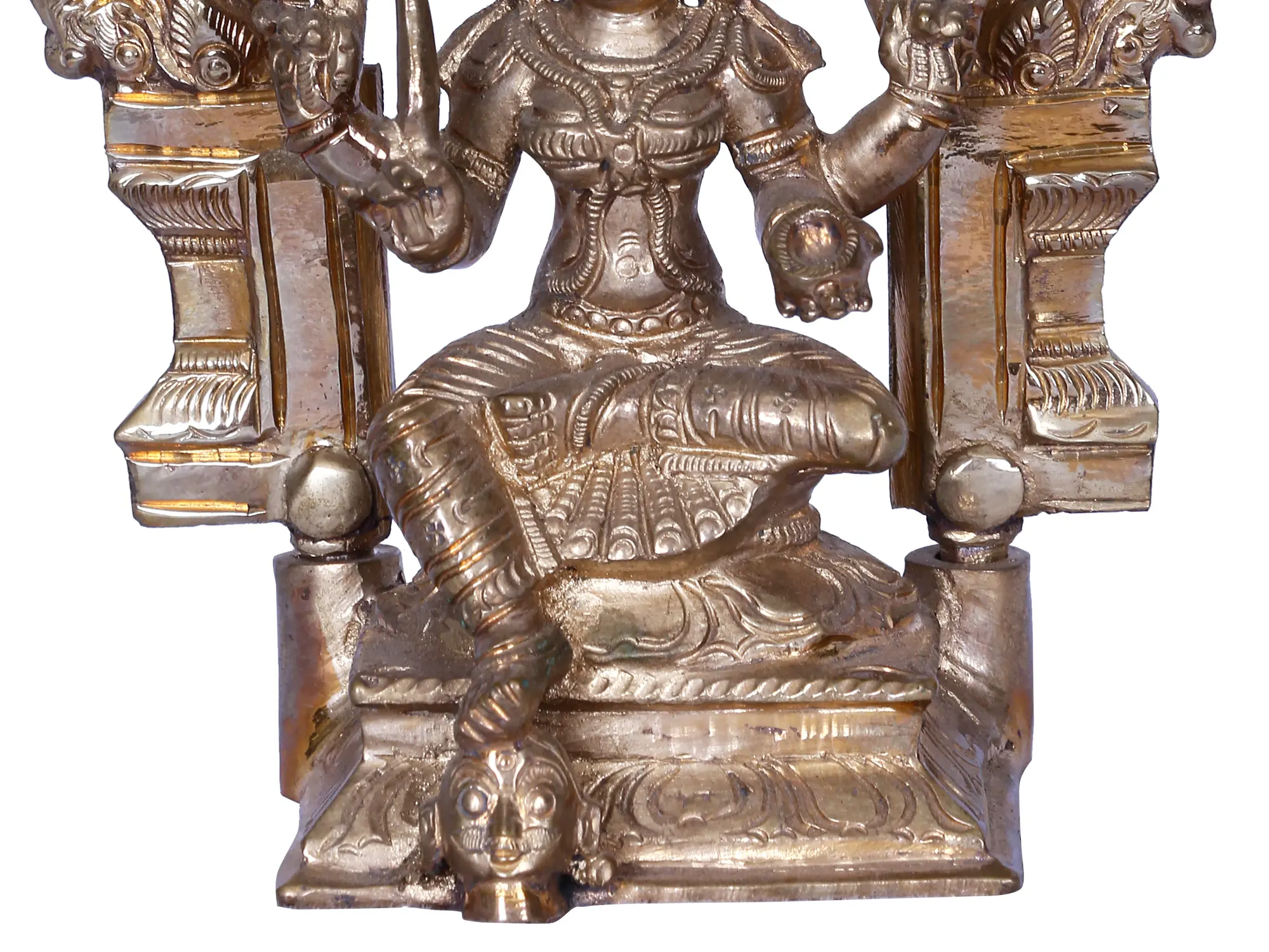 In this bronze rendition, Devi Mariamman, the goddess of rain and fertility, gracing the “Kirtimukha Throne” with transcendent majesty. Clad in regal splendour, She wields a “Damaru” encircled by a sinuous serpent, a symphony of cosmic rhythm. A sword and trident (Trishul) in her divine hands evoke power and balance, while a “Kapala” symbolises the cosmic cycles of creation and destruction. Above her head, a five-hooded serpent unfolds as a celestial umbrella, bestowing protection. Crafted in Panchaloha bronze from “Swamimalai” using the ancient “Madhuchista Vidhana (Lost-Wax) technique”, this piece of art encapsulates the cosmic dance, an ode to creation’s intricacies, destruction’s inevitability, and the cyclical nature of existence—a masterpiece revealing the interplay of divine forces and the eternal cosmic ballet.