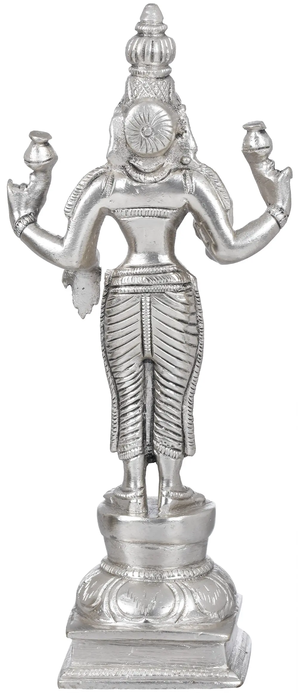 Devi Lakshmi breathes life into this brass statue by radiating the splendor of her celestial roopa and representing the pinnacle of feminine auspiciousness in her form. Goddess Lakshmi is depicted in this small statue as Chaturbhuja or four-armed, standing in a poised manner, and holding her hands in a gesture of bestowing blessings and allaying fear. She is positioned on a double-tiered lotus pedestal which is a symbol of purity, fortune, and fecundity- virtues that the goddess represents.