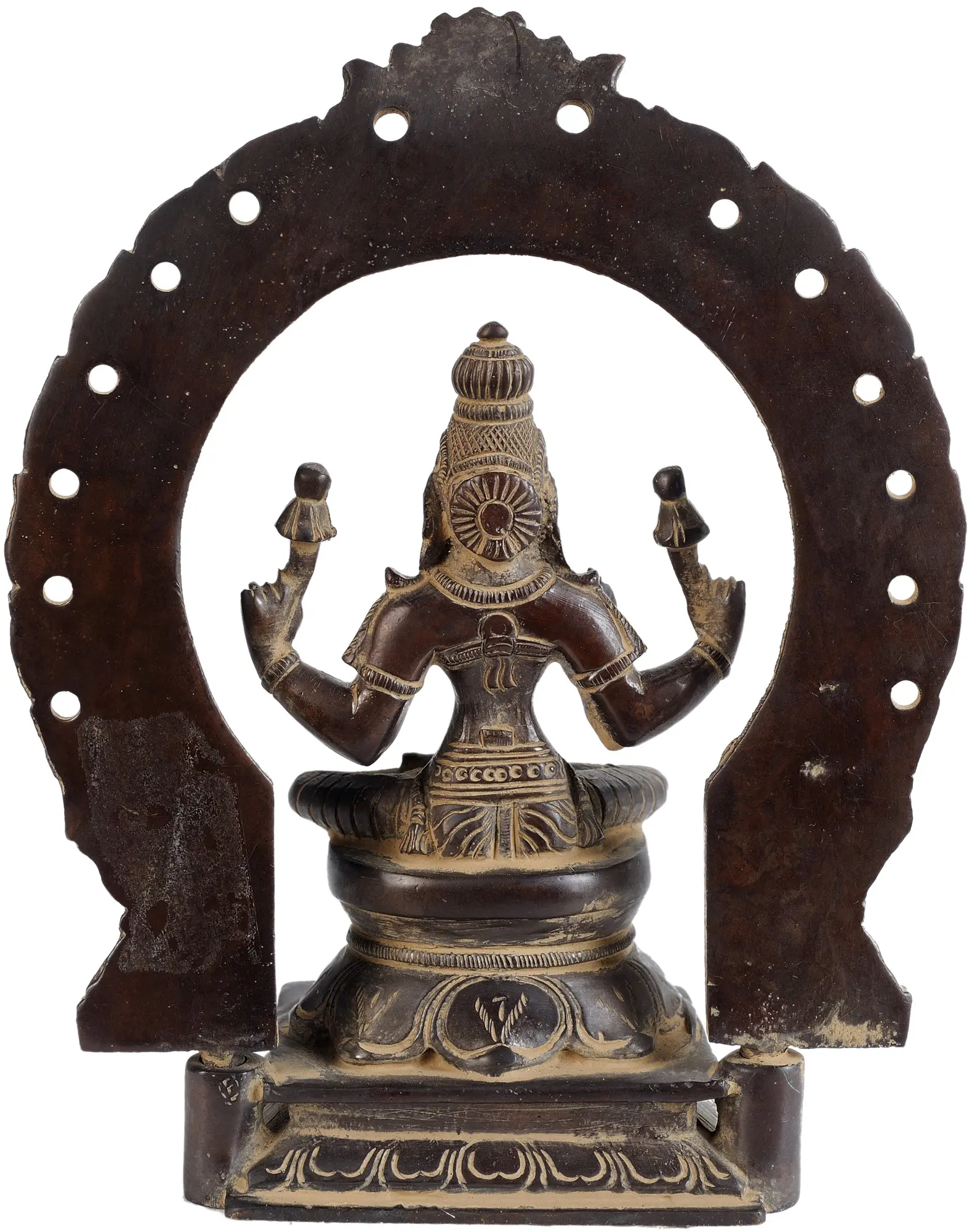 Maa Lakshmi, the bestower of eternal wealth and the Shakti of Narayana is enthroned on a majestic aasana, with an imposing aureole, in this exquisite brass statue, which is an ode to her status as the supreme queen mother of Brahma’s creation. Lakshmi sits on a Padmasana, a lotus seat, which signifies the origin of the universe and its bloom- celestial events which are enriched by goddess Lakshmi’s benevolence. Appearing as a lithesome heavenly maiden, Devi Lakshmi is adorned exquisitely and is in her ever-auspicious Chaturbhuja (four-armed) form, whose darshana and archana (seeing and revering) bring unending luxuriousness in the lives of her devotees.