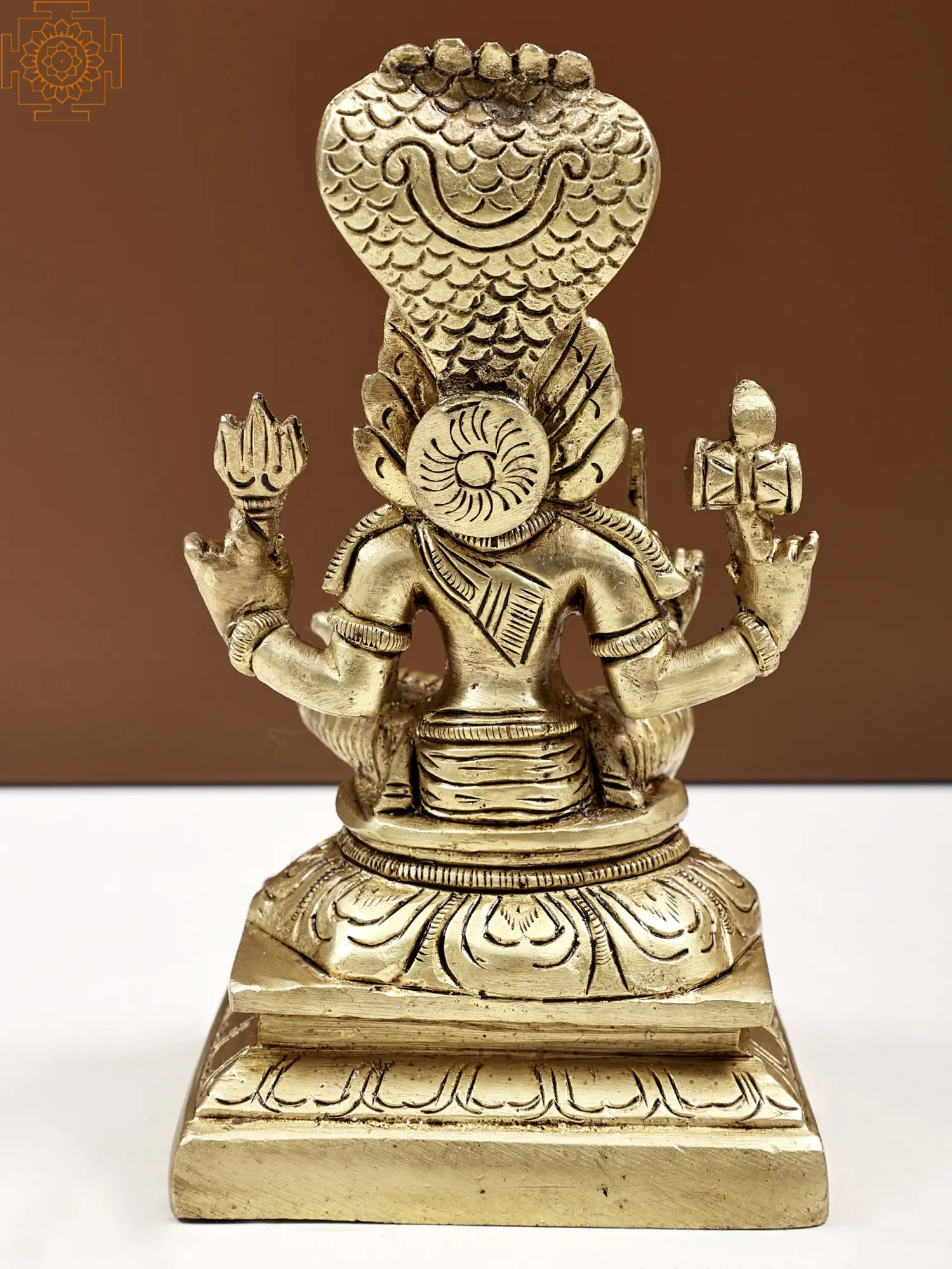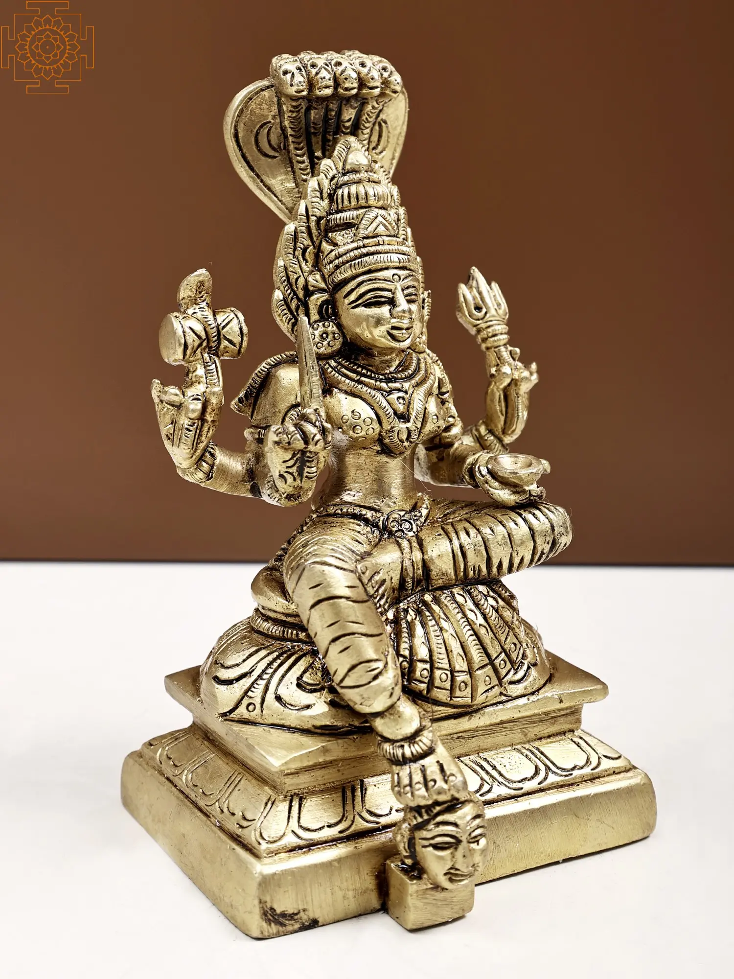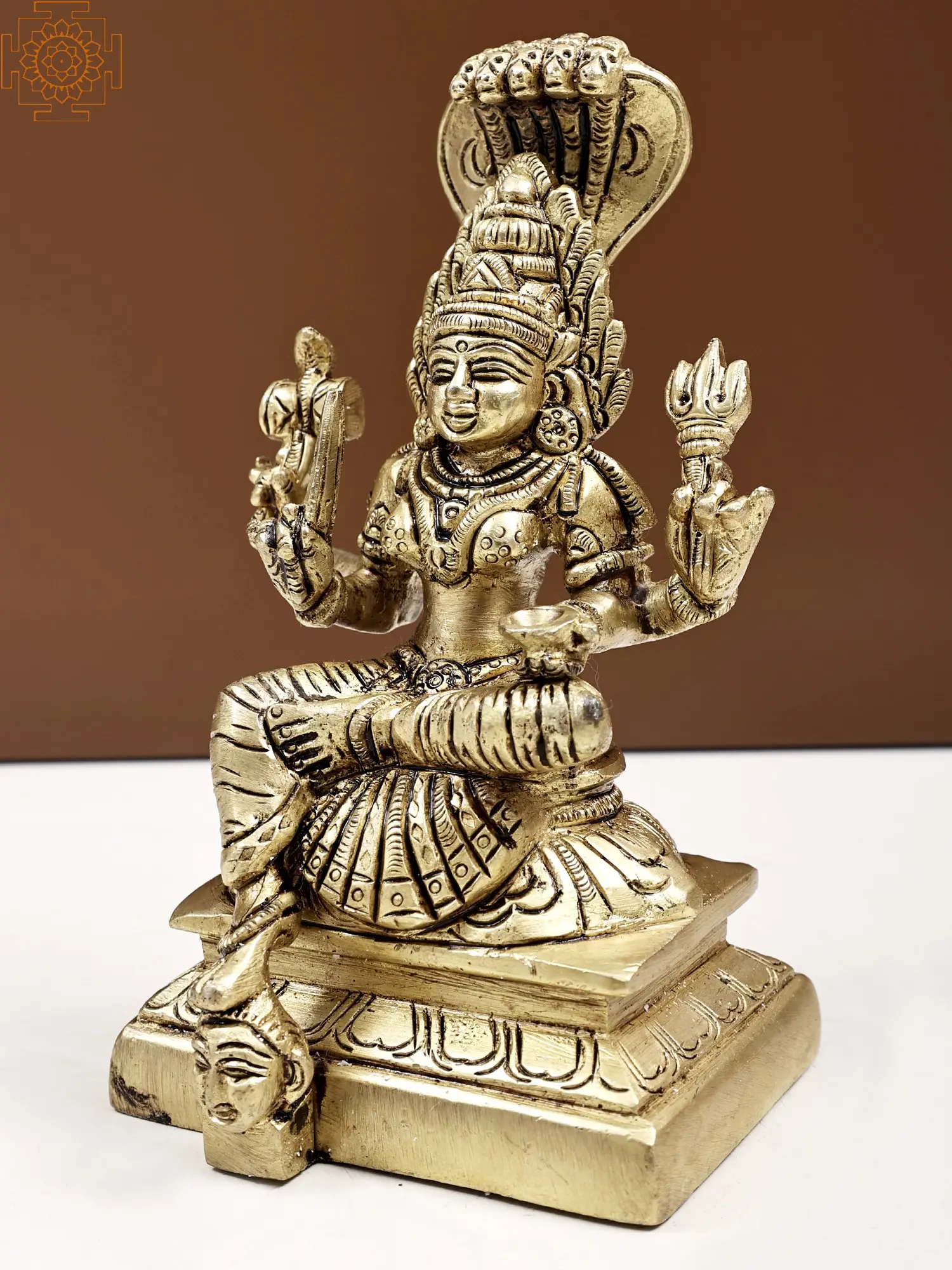 Mariamman, also called Karumariamman, is a powerful manifestation of the great goddess in South India who protects those who worship her from illness and bad fortune and bestows riches upon them. In this brass statue, the head of Devi Angala Paramaeshwari is placed beneath the foot of the goddess Mariamman, signifying the complete elimination of self or ego in order to attain the benevolence of Mariamman. Devi Mariamman is seated on a Padmasana or lotus throne, adorned in a regal tone with a serpent hood haloing her divine visage.