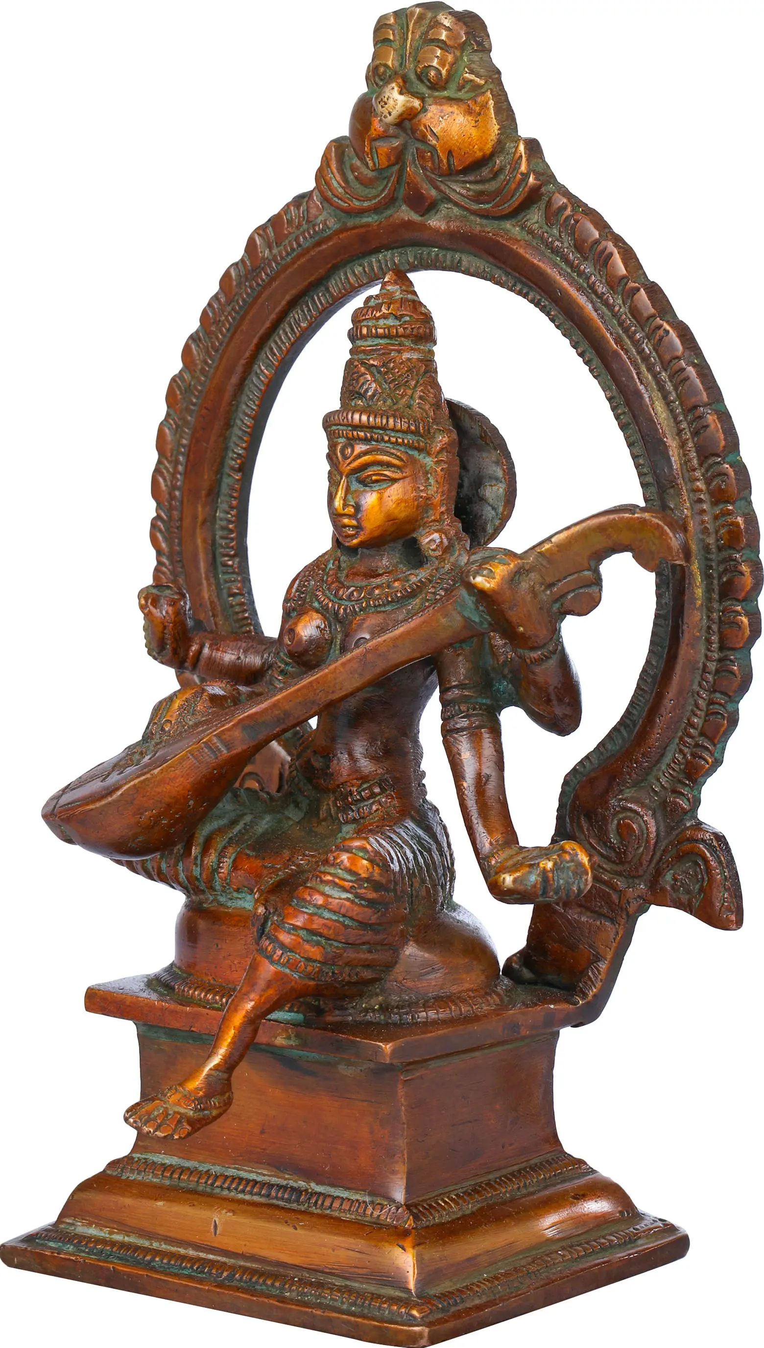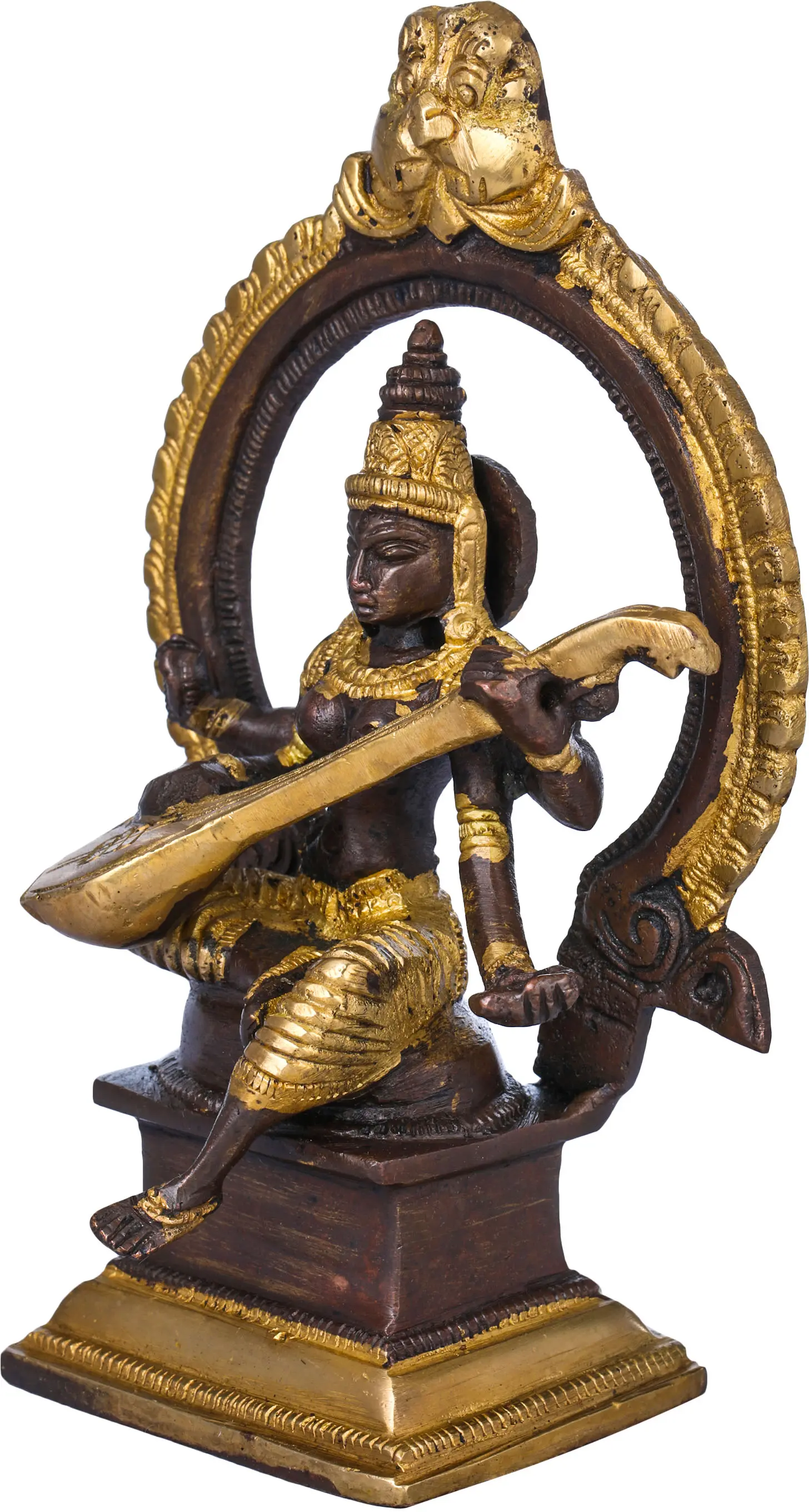 Gracing the icon in a heavenly form, exuding beauty, auspiciousness, and a celestial aura from her presence, Devi Saraswati in this small brass statue is the supreme mother goddess, from whom emanates the Srishti of Lord Brahma. Maa Saraswati has been depicted as Veenavadini, strumming her Veena with her two hands, while the other two hold the book and rosary. Sculpted beautifully, this handmade goddess Saraswati statue is ideal for devotees of the mother goddess.
