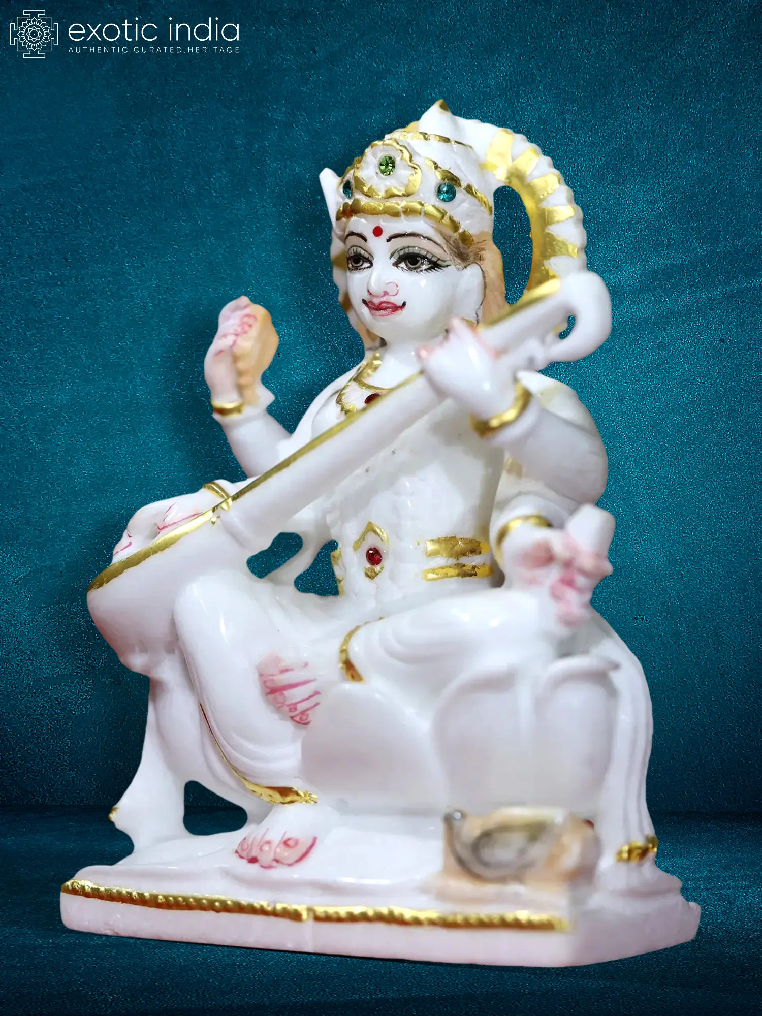 This exquisite statue captures the divine presence of Goddess Saraswati, the revered Hindu deity of knowledge, music, art, wisdom, and learning. Crafted from the purest Super White Makrana marble, renowned for its pristine quality and luminous sheen, this artwork is a testament to timeless artistic tradition. The goddess is depicted in a serene posture, gracefully playing the sitar, a classical Indian string instrument. Her form is rendered with delicate precision, showcasing the subtle curves of her posture and the intricate details of her divine adornments. The use of Makrana marble imbues the statue with an ethereal glow, reflecting the purity and sanctity associated with Saraswati. The gold accents highlight the divine aura and add a touch of opulence, further enhancing the visual appeal of the piece.