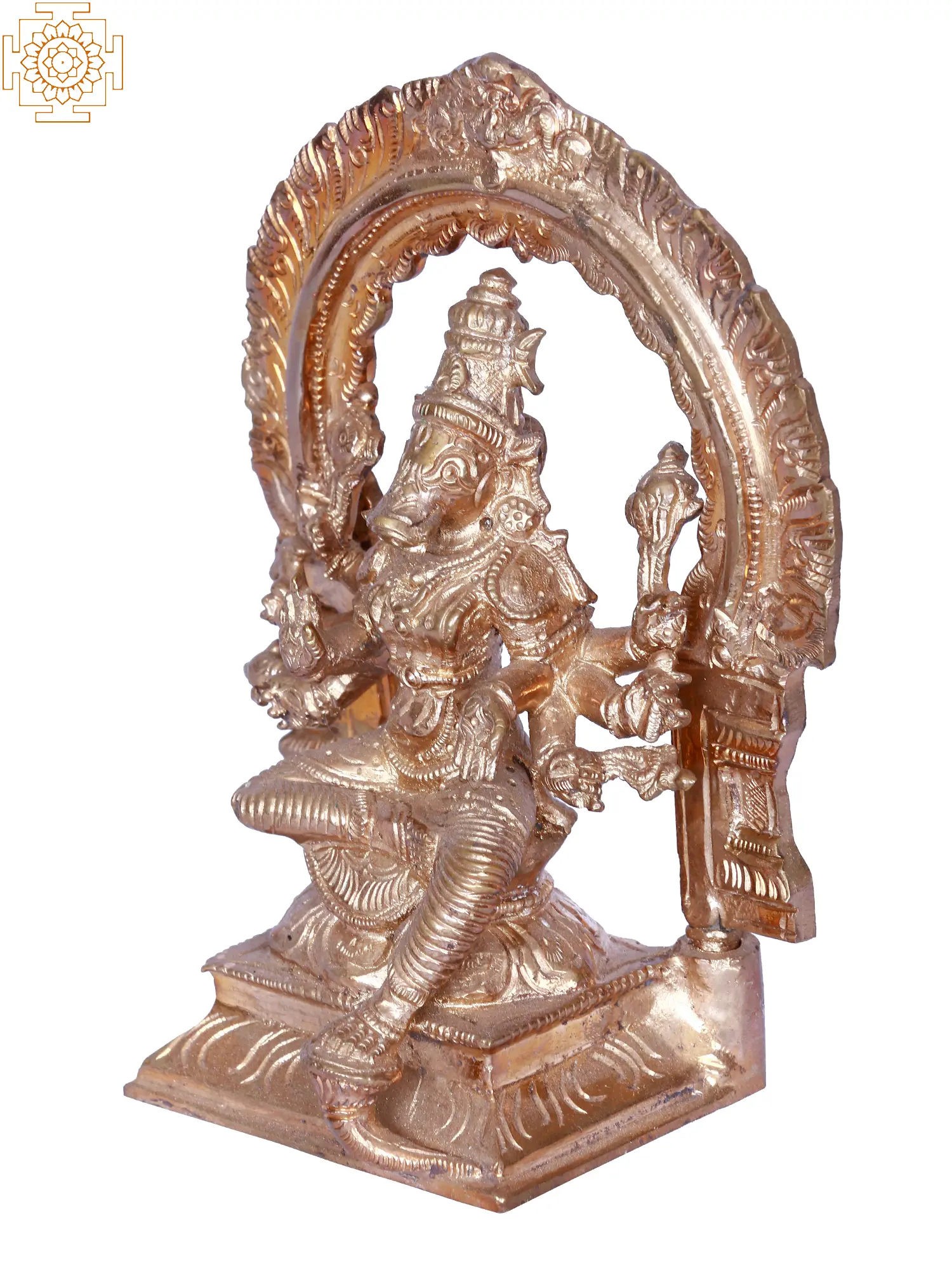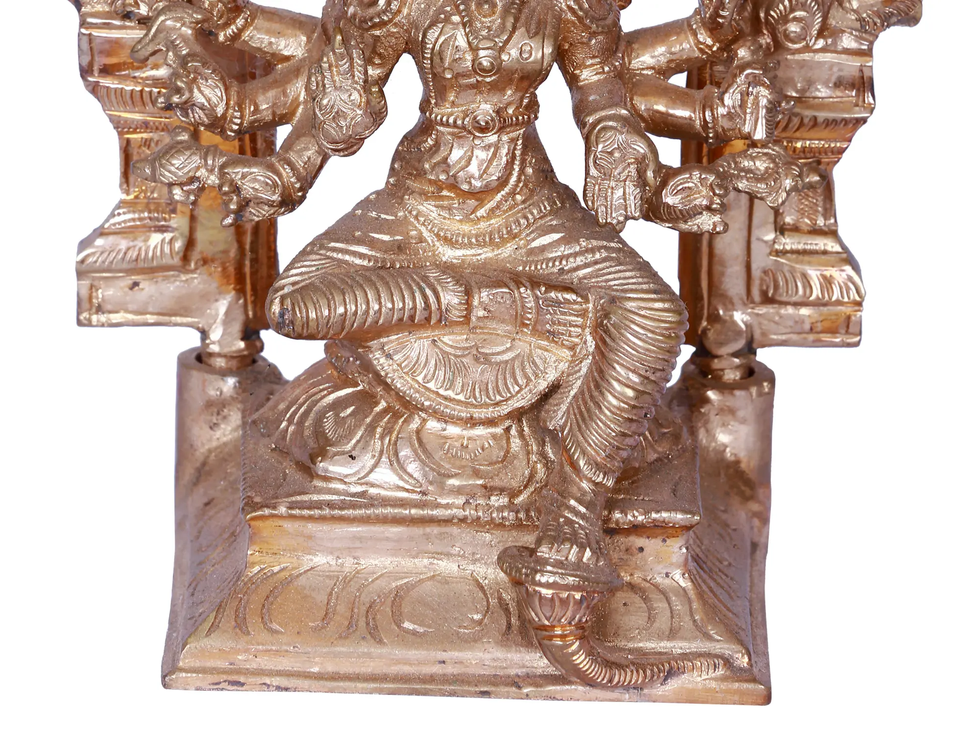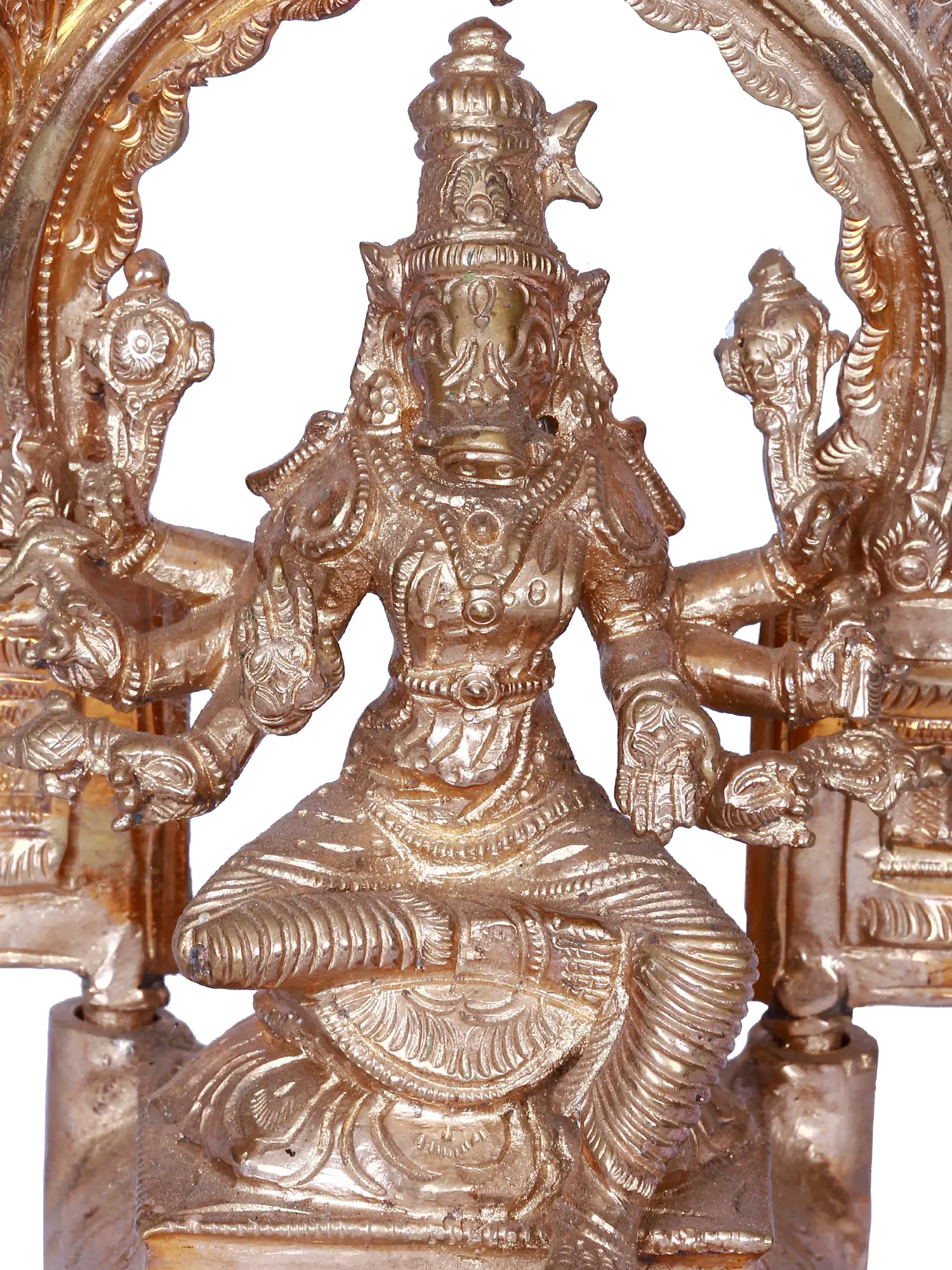 In the ethereal realm of divinity, Goddess Varahi graces the cosmos, enthroned upon the majestic “Kirtimukha (the Face of Glory)”, in a sublime “Lalitasana”. As a radiant presence among the Matrikas, Goddess Varahi, “also known as Dhumavati (the Goddess of Darkness)”, bears the head of a “Sow”, symbolic of her divine connection to “Lord Varaha”, Vishnu’s boar avatar. Clad in regal attire, Goddess Varahi wields an array of divine instruments and weapons—a discus, conch shell, Danda, Khetaka, Khadga, Pasha, and goad, symbolising her cosmic authority. With a front right hand in “Abhaya Mudra”, She extends assurance, while her left, in “Varada Mudra”, bestows boundless blessings upon devotees. Crafted in bronze, this masterpiece whispers tales of cosmic balance and the omnipotent embrace of the divine feminine.