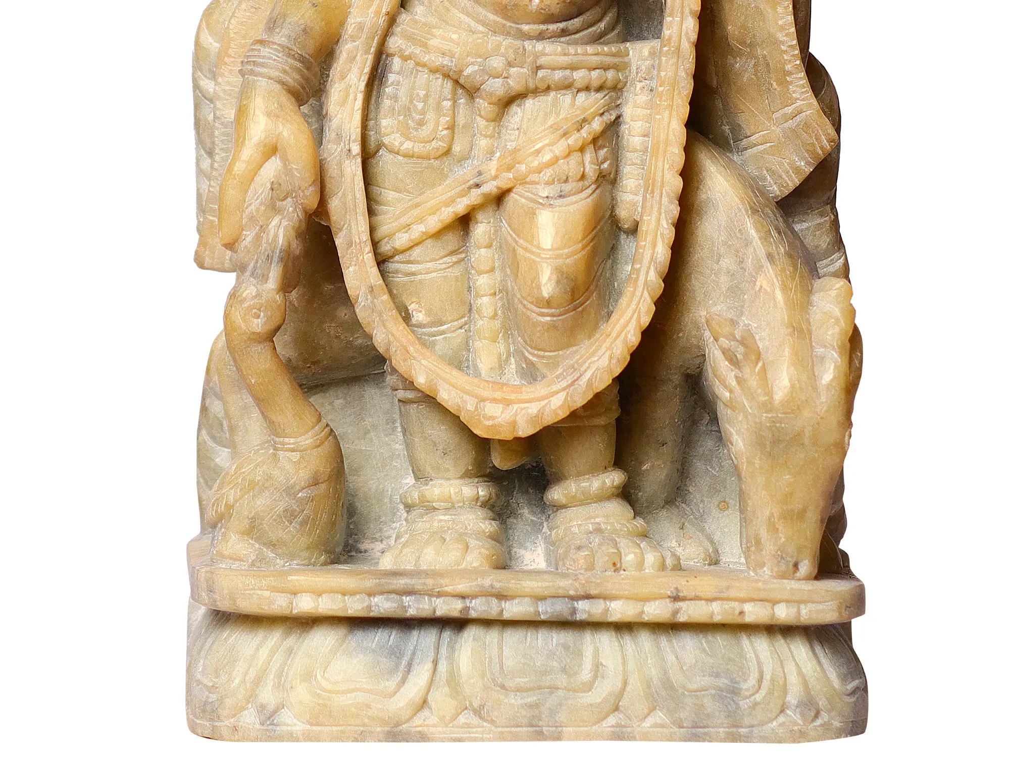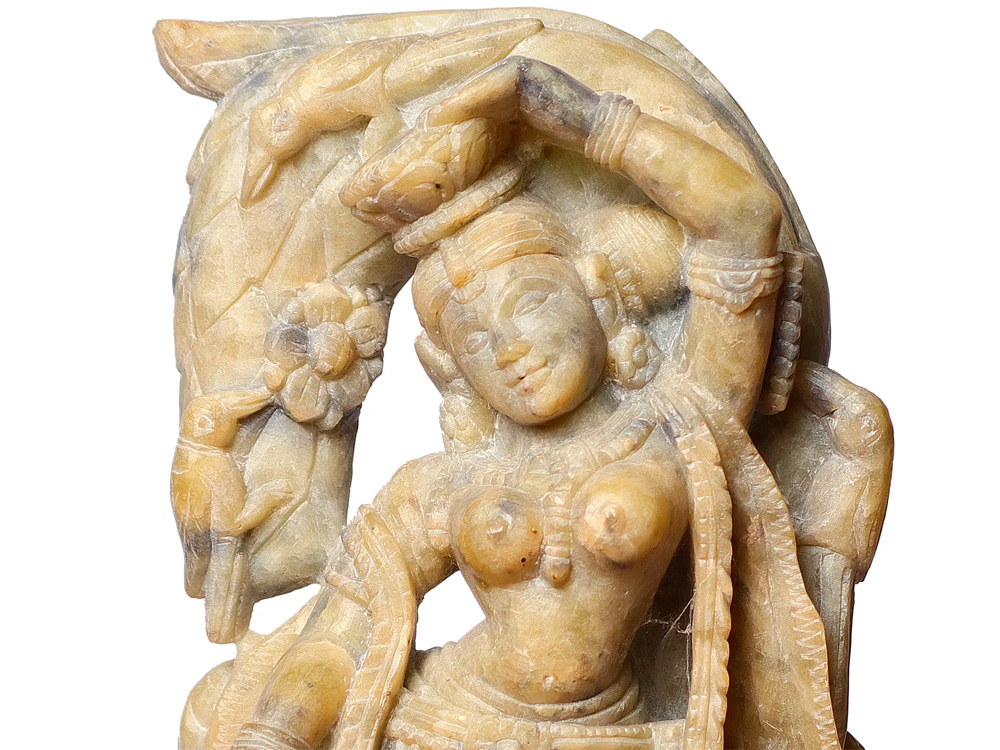 In the tribhanga pose, Gopika's body gently sways with three bends, embodying the divine dance of the cosmos. Her posture represents the harmony and balance between all elements of creation, offering a glimpse into the cosmic rhythm that governs the universe. As she carries a pot gracefully on her head, the Gopika symbolizes the epitome of grace and responsibility. The Gopika's act of feeding the birds epitomizes her nurturing spirit, fostering a sense of harmony and interconnectedness with all living beings. A gentle cow stands nearby, quietly acknowledging her benevolence. The cow's presence signifies abundance, motherly love, and the divine connection with nature.