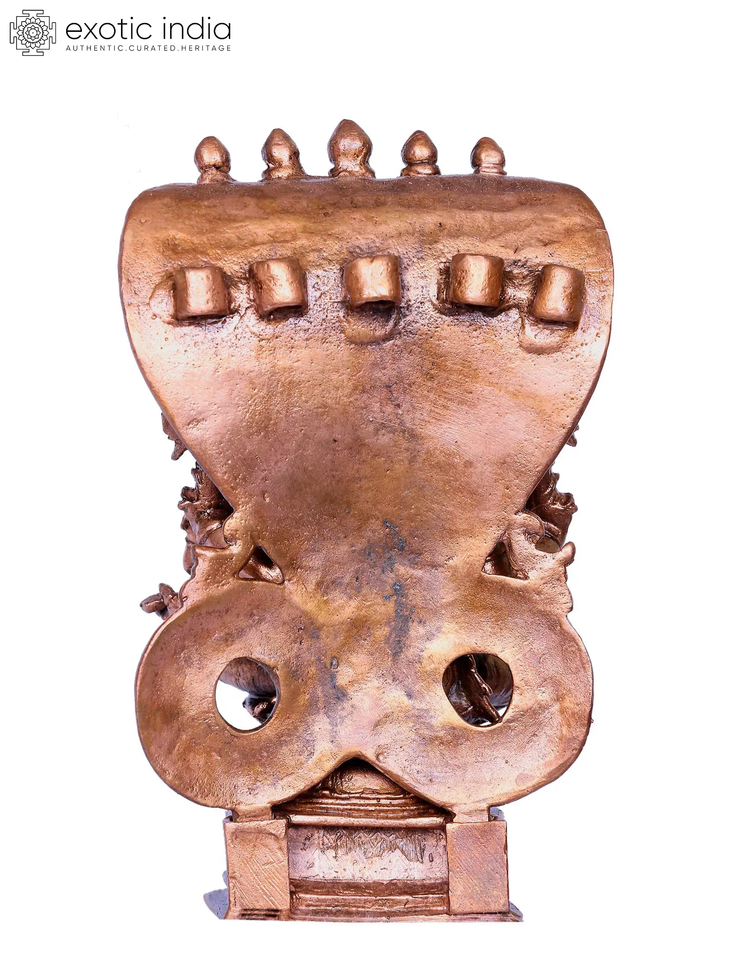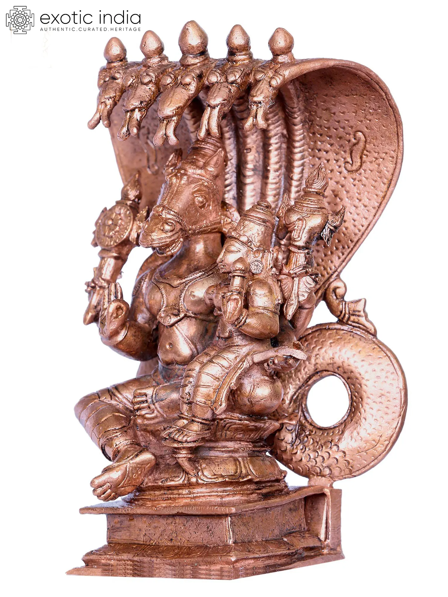 In this mesmerising bronze rendition, Lord Hayagriva, “the horse-headed incarnation of Vishnu”, graces the Sheshnag throne. Adorned with divine radiance, Lord Hayagriva, “the bestower of Knowledge”, wields the “Sudarshan Chakra (The Discus)” and “Shankh (Conch Shell)”, embodying cosmic order. His right hand is in “Abhaya Mudra”, instilling fearlessness, a beacon of courage. Beside Him, Goddess Lakshmi, also known as Padmasundari, exuding purity, rests on Lord Hayagriva’s lap. Her delicate hand cradles a lotus, symbolising prosperity and good fortune. This representation of Hayagriva, Lakshmi, and Sheshnag intertwines their essence—a sacred trinity embodying wisdom, abundance, and the eternal cosmic serpent. Together, they weave the tapestry of cosmic harmony, a mesmerising symphony of divinity.