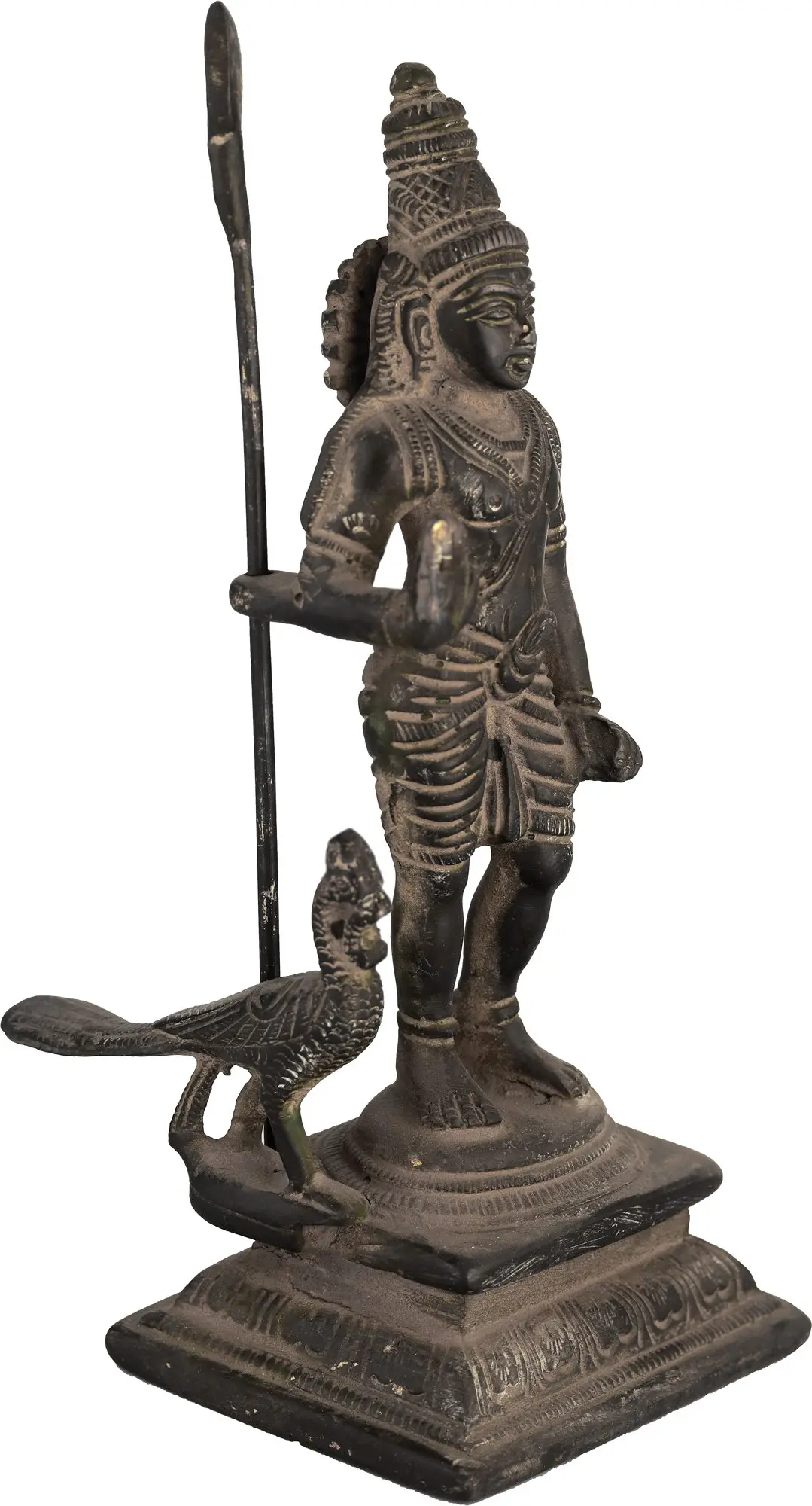This exquisite brass statue captures the formidable presence of Karttikeya, the Hindu god of war and the commander of the celestial armies. Crafted with meticulous attention to detail by skilled artisans in India, this piece embodies the divine power and martial prowess associated with Lord Murugan, as Karttikeya is also known. The patina on the brass lends an air of timeless antiquity, hinting at the ancient tales and enduring devotion that surround this beloved deity. Standing at a commanding yet manageable size, this depiction showcases Karttikeya in his iconic form. He is often revered as the son of Shiva and Parvati, born to protect the cosmos from demonic forces. Legends tell of his swift victories against powerful adversaries, highlighting his role as a protector and a symbol of courage. His mount, the peacock, which is depicted here, symbolizes his supremacy over ego and vanity, further enriching the symbolic meaning of the sculpture. The spear, a potent weapon representing his authority and the eradication of evil, is held with a resolute grip, ready to defend righteousness.