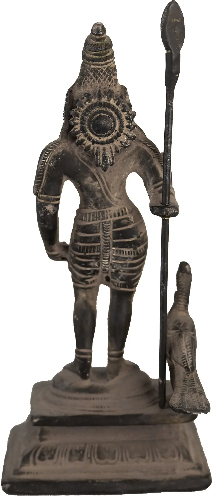 Lord Murugan, also known as Lord Kartikeya, is the first child of Lord Shiva and Goddess Parvati. He is a significant deity who is largely revered in India's southern states. This brass monument is a fitting tribute to Lord Murugan's majestic and regal appearance. Lord Murugan is depicted standing and adorned with magnificent jewellery patterns. The black colour of the statue gives it an old appearance. He is depicted blessing his worshippers while wielding his powerful spear. His mighty peacock may also be seen sitting close to his gorgeous monument. The exquisite carving of fine elements of the statue adds to the sculpture's richness and artistic appeal.
