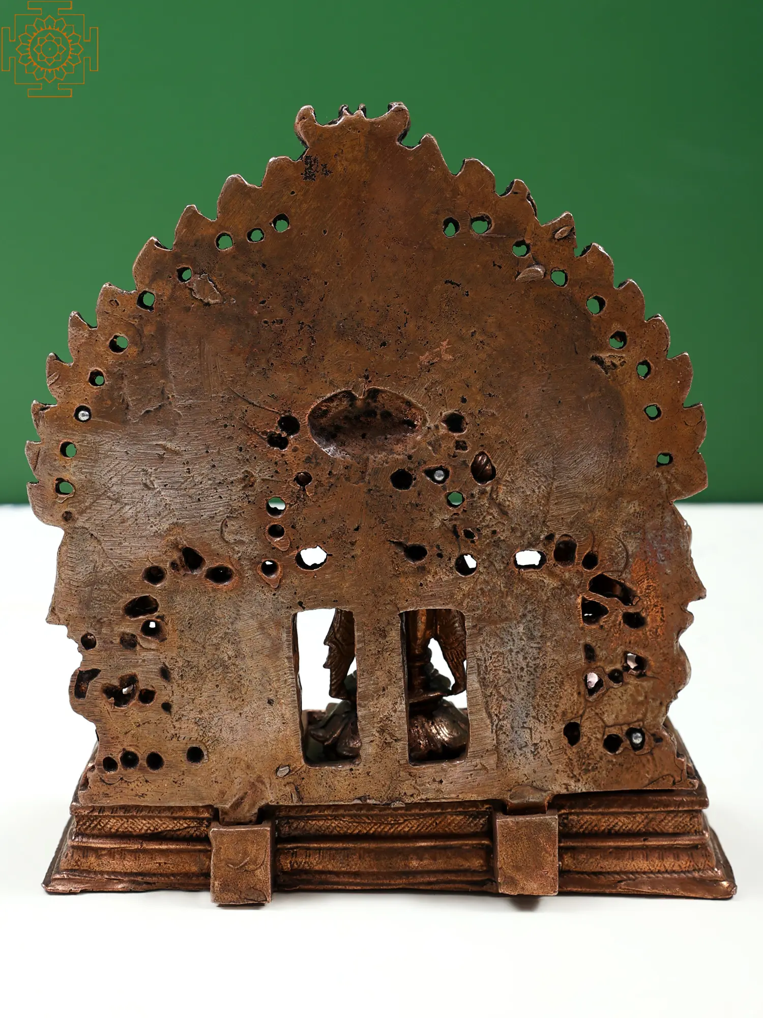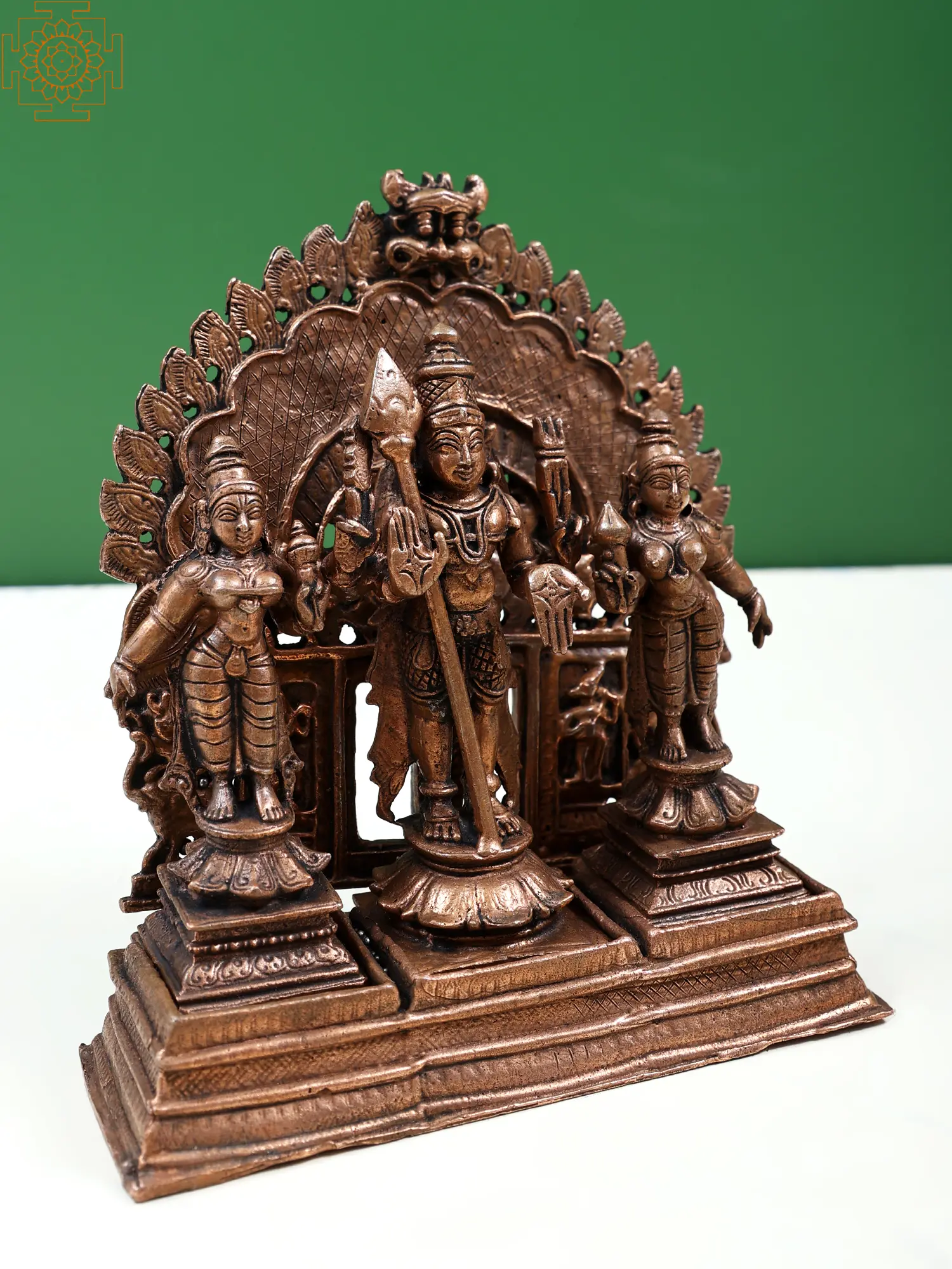 Sculpted with devoted perfection, this copper statue of Murugan with Devasena and Valli is a complete sacred shrine to be installed in one's home to experience the aura of the divine trio. The image of Karttikeya with Devasena and Valli is a powerful vision, of the coming together of Murugan's supreme wisdom with his Iccha (willpower) and Kriya (active energy), together with whom he protects and guides his devotees toward an ideal life. The three divinities are adorned regally on individual pedestals, against an imposing Kirtimukha aureole which adds majesty to this miniature composition.
