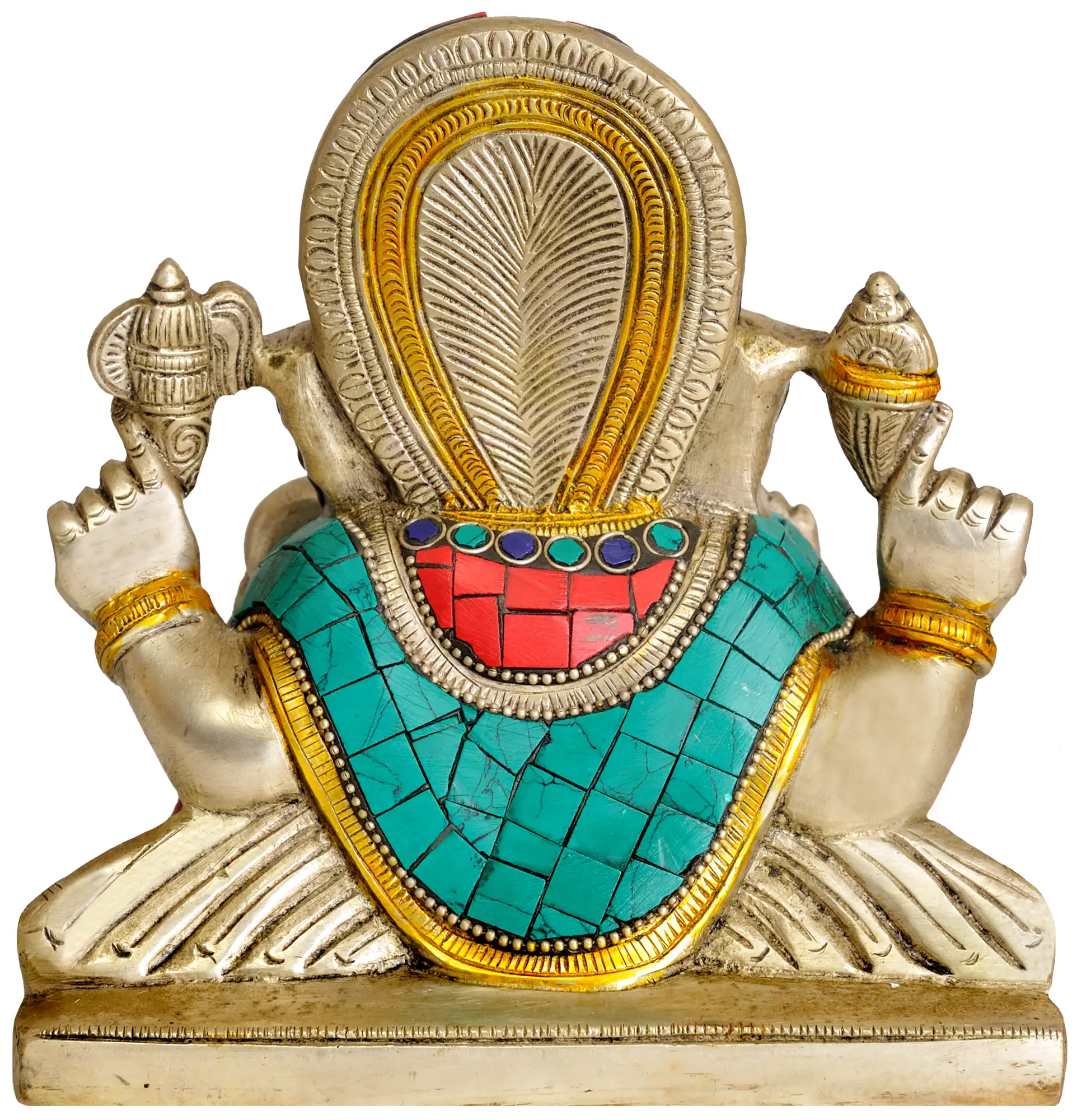 Lambodara Ganesha, “the bestower of boons”, sits majestically in the “Utkutakasana posture”. His form radiates divine grace, and his iconic attributes reveal the essence of his symbolism. With a gentle demeanour, Ganesha carries a “Goad” and a “Noose”, symbolising his control over human desires and ignorance. His right hand extends in the “Abhaya Mudra”, offering solace to his devotees. In his left hand, He cradles a “sweet Modak”, the symbol of spiritual wisdom and bliss. A serpent elegantly coils around his prodigious belly, epitomising his mastery over the primordial energy, Kundalini. This artwork, crafted in brass and embellished with inlay work, grants wisdom, removal of obstacles, and inner harmony, making it a cherished beacon of hope and blessings.