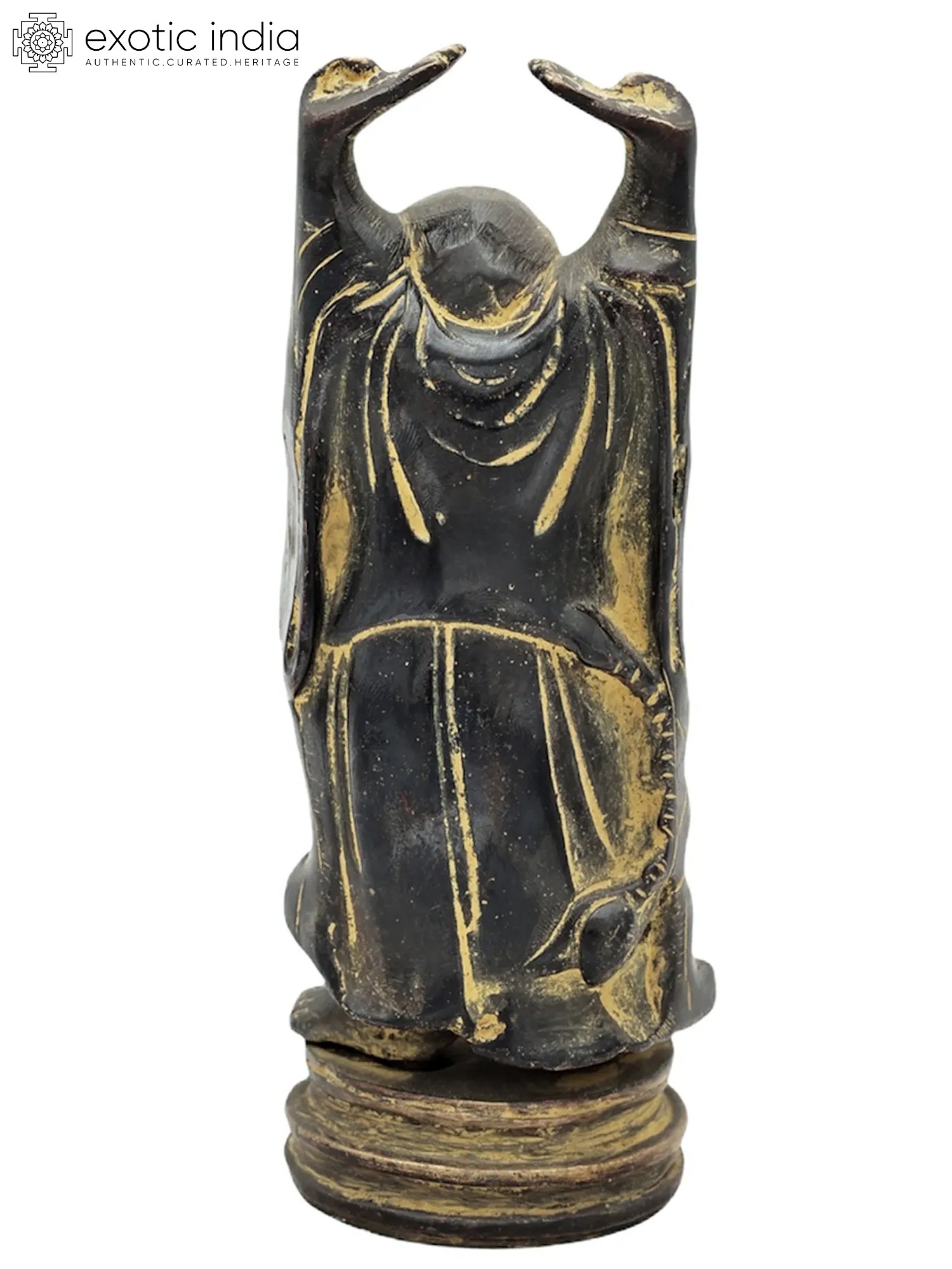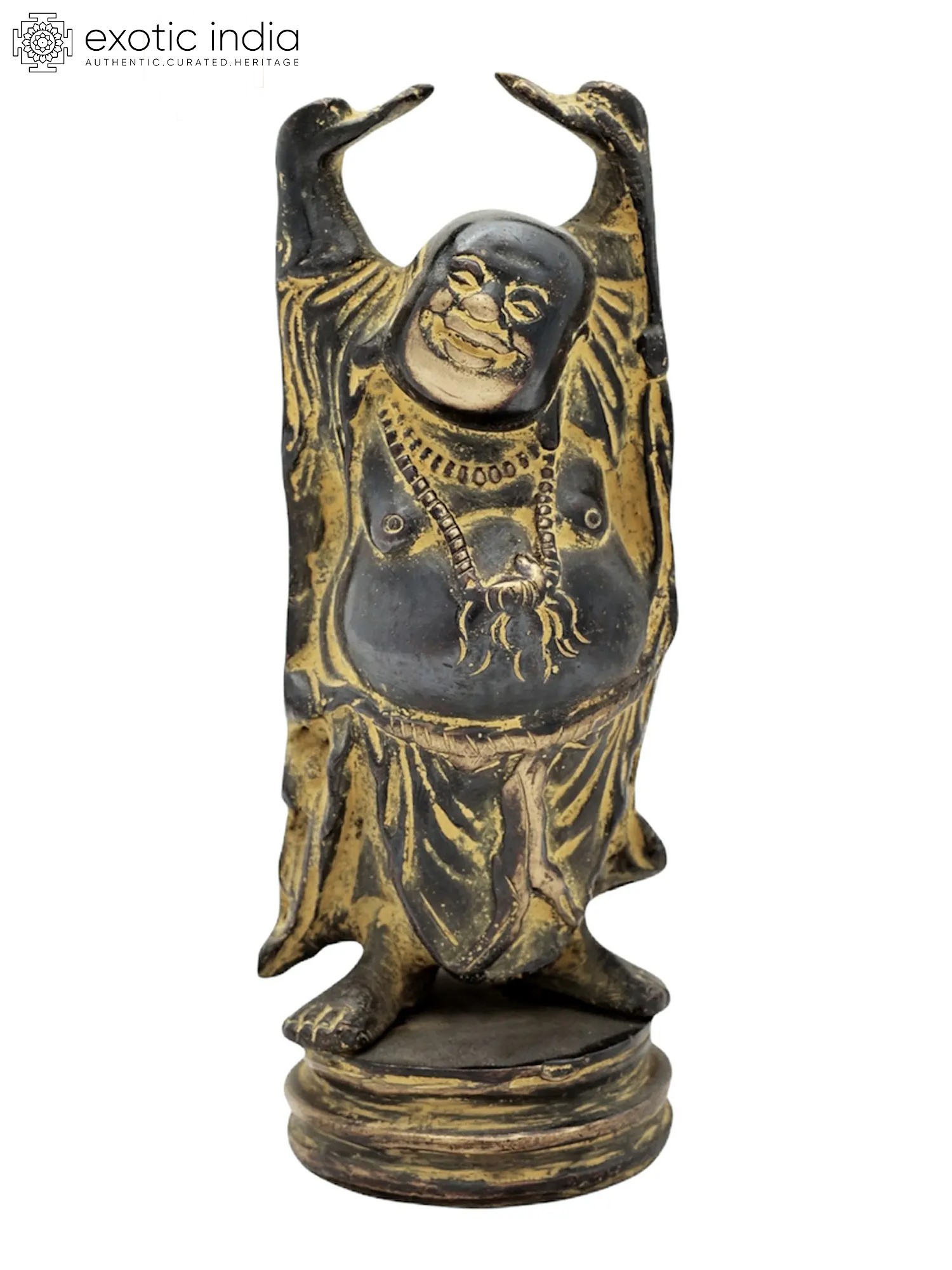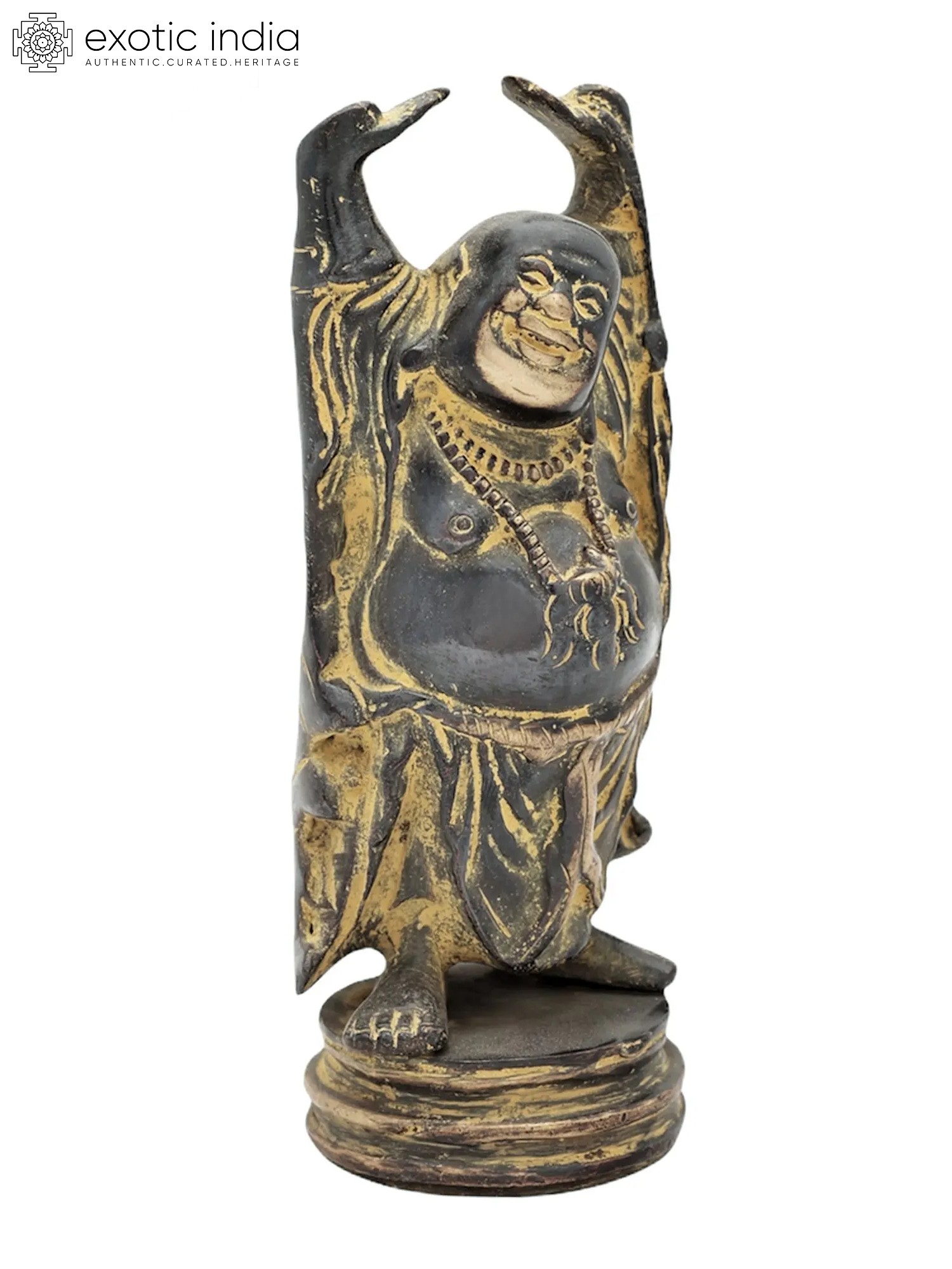 In this sculpture, Laughing Buddha, also known as the “Budai” or “Hotei” is standing with a jovial and beaming smile. His hands are raised up, a symbol of his abundance and prosperity. Laughing Buddha is often depicted with a rotund belly, signifying contentment and joy. Laughing Buddha’s countenance is filled with warmth and compassion, reflecting his role as a bringer of good fortune and blessings. His attire exudes a sense of ease and comfort, symbolizing his carefree and blissful demeanor. Crafted with intricate artistry and devotion, the brass sculpture emanates an eternal charm. Decorate your space with this magnificent artwork, embracing the essence of happiness and wealth that Laughing Buddha bestows.