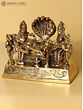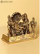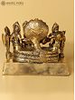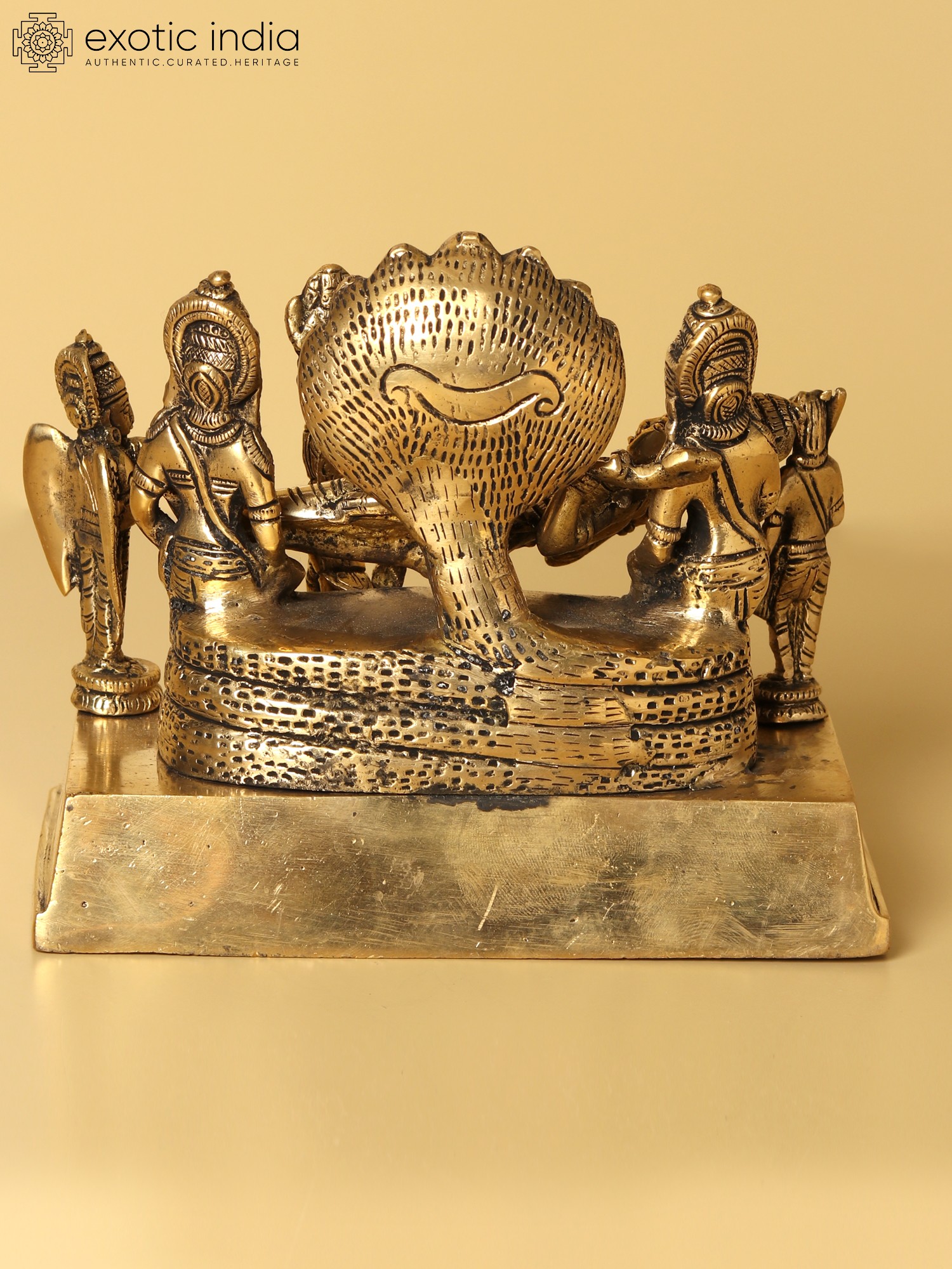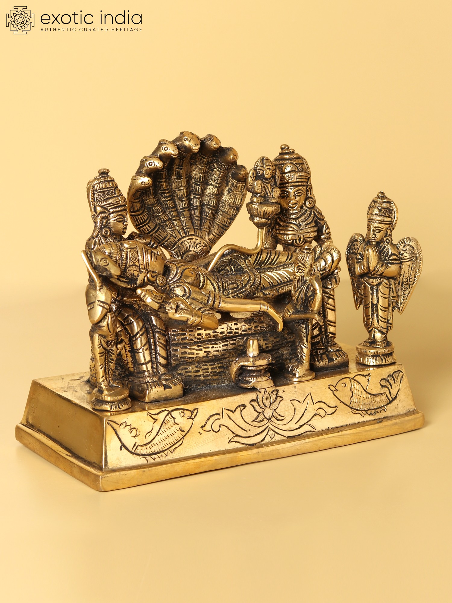 This handcrafted brass statue presents a powerful and profound moment from Hindu cosmology. Here, we see Lord Vishnu, the preserver, resting in his eternal slumber upon the coils of the serpent Shesha, the king of Nagas. This imagery depicts the time before creation, a state of serene potentiality where the universe exists as a mere thought within Vishnu's divine consciousness. The multi-headed Shesha Naga, or Ananta Shesha, provides not only a comfortable bed but also protection, his many heads symbolizing the infinite nature of time and space. The serpent's hood rises protectively over Vishnu, a visual representation of the cyclical nature of the cosmos, constantly being created, preserved, and ultimately dissolved.