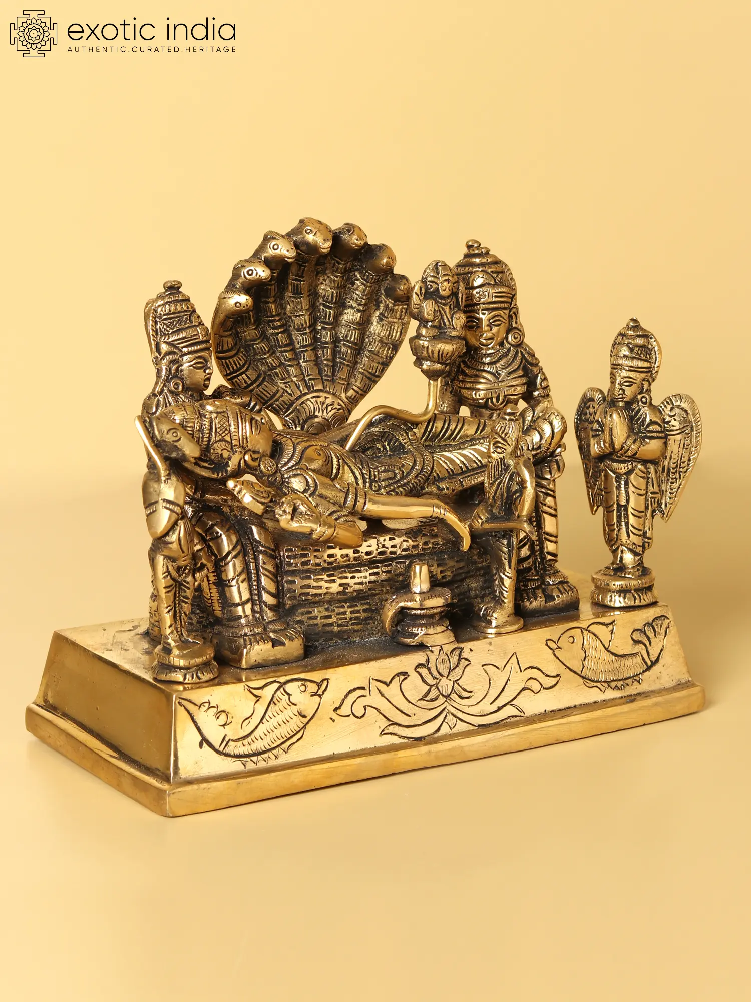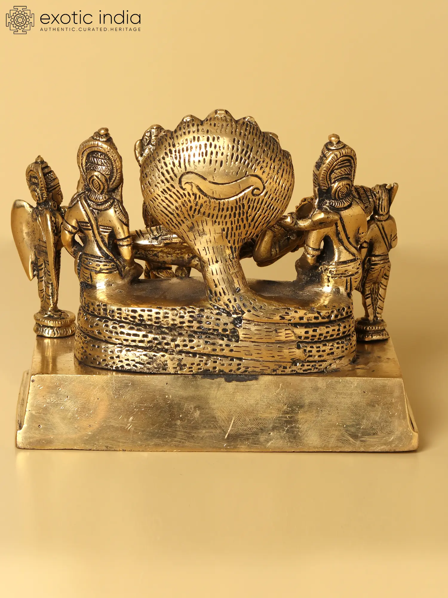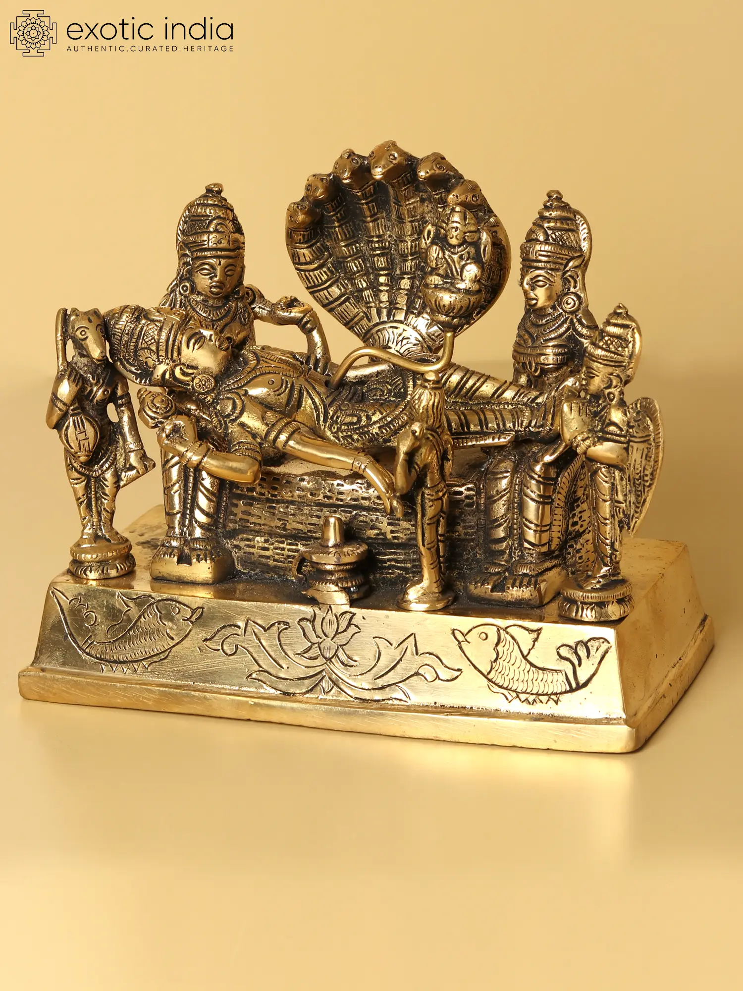 In the quietude of eternity, where the threads of cosmos intertwine, emerges a masterpiece that beckons us to contemplate the intricate dance of creation. This sculpture transcends mere craftsmanship, elevating itself to a symphony of spiritual symbolism and profound contemplation. As the molten brass flowed like rivers of time, skilled hands sculpted every detail with a reverence reserved for the divine. Lord Brahma, the creator of all existence, rises ethereally, his four heads aglow with the wisdom of the ages. The very act of his emergence from the navel of Lord Vishnu embodies the eternal cycle of creation, preservation, and dissolution, echoing the heartbeat of the universe.