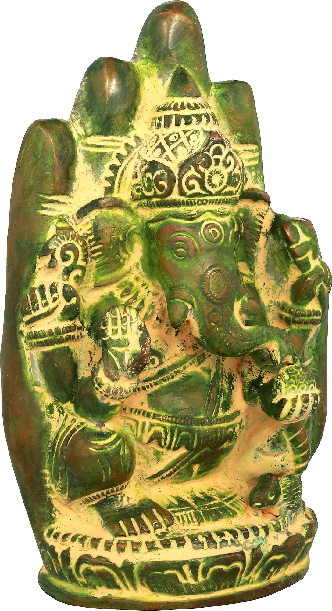 The Abhaya Mudra, represented by the open palm facing outward, signifies protection, fearlessness, and dispelling of all fears. When Lord Ganesha is depicted in the Abhaya Mudra, it assures his devotees of his loving presence, protecting them from harm - his portrayal in the Abhaya Mudra signifies his role as a compassionate and benevolent protector, guiding his devotees on the righteous path with unwavering support; brought to you in premium quality brass.