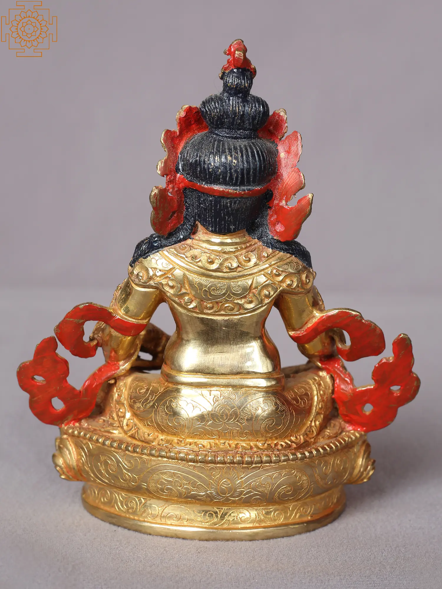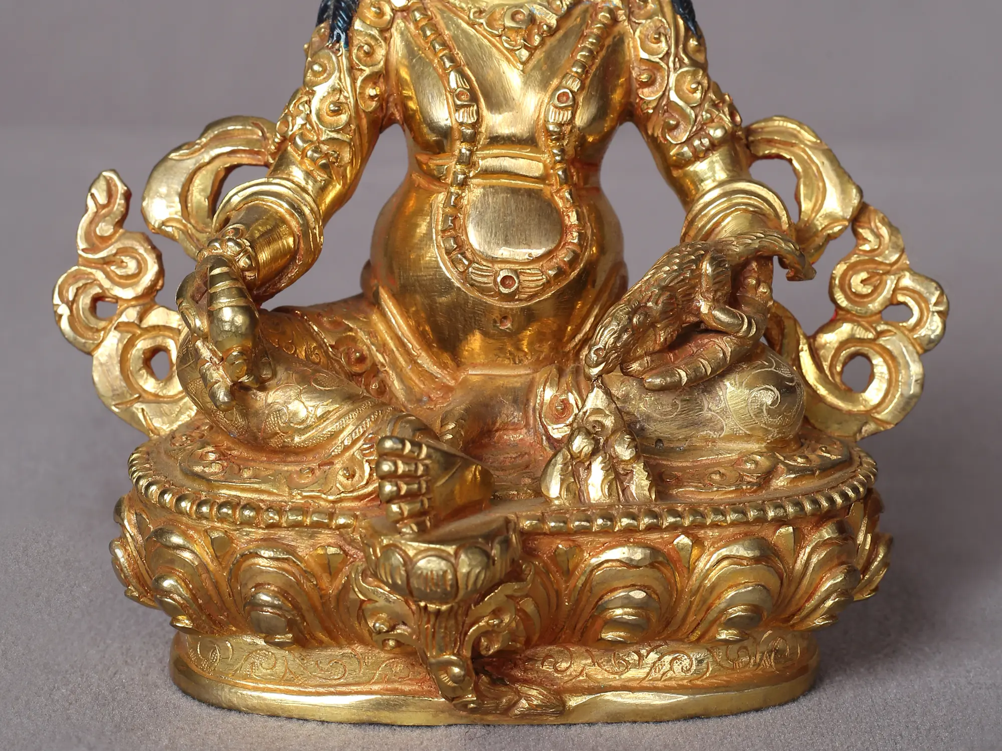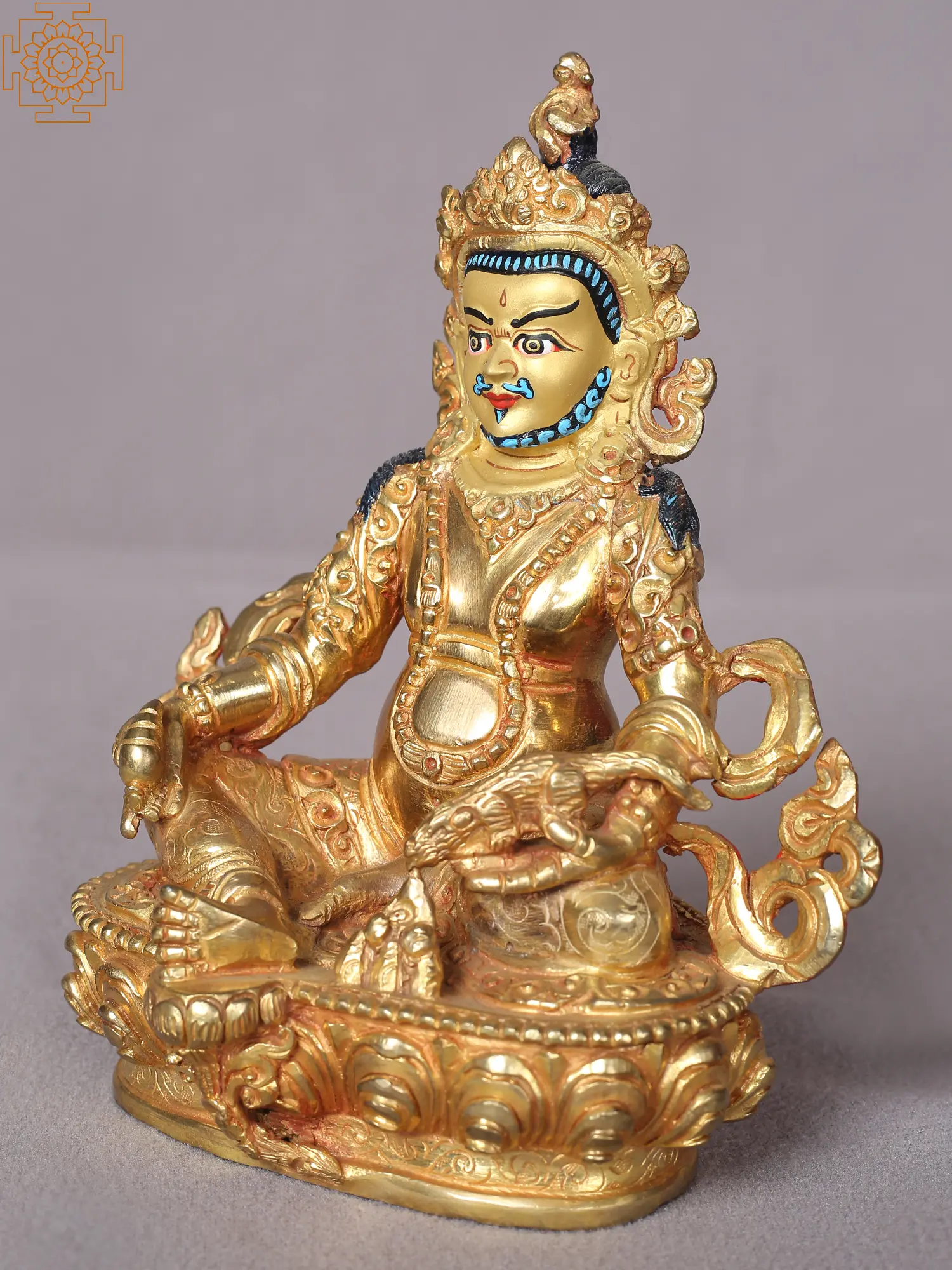 With his scowling brows, bulging eyes, scrunched-up nose, and softly smiling lips, Lord Kubera in this Nepalese statue strikes the perfect balance between ferociousness and goodness. His head is adorned with jewelry, necklaces, and a thinly carved scarf in addition to a magnificent five-pronged Nepalese crown with miniature skulls. The lotus throne's splendor can best be appreciated in the layers of petals and fine lines which lend it a fragrant realism. The thinly carved scarf wraps around his form beautifully. A heap of gems on the lotus throne symbolizes the eternal wealth that Kubera showers on his devotees.