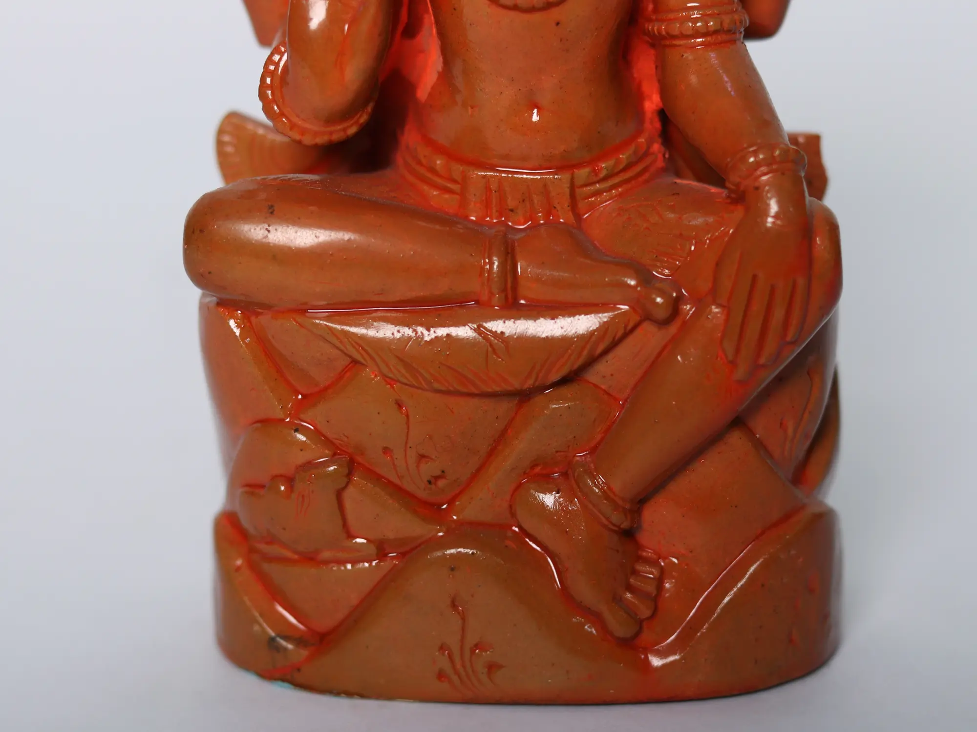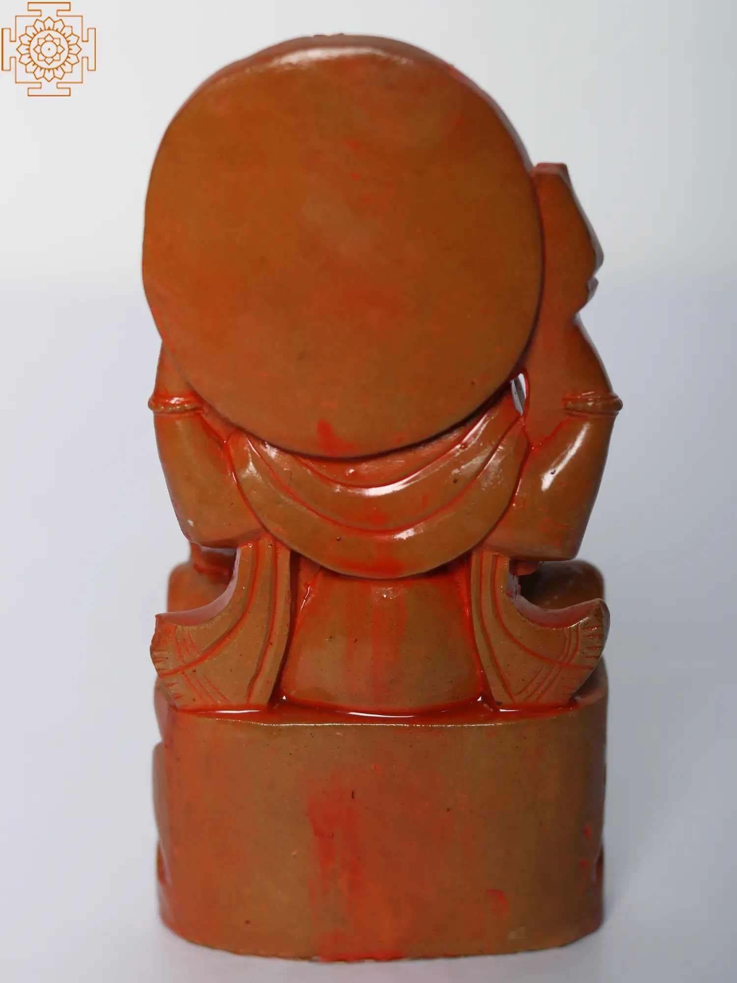 Painted in vibrant orange hues, the statue exudes warmth and vitality, invoking the fervor of devotion. A resplendent lotus halo adorns his head, symbolizing purity and enlightenment. This masterpiece serves as a tangible conduit for spiritual connection and divine grace.