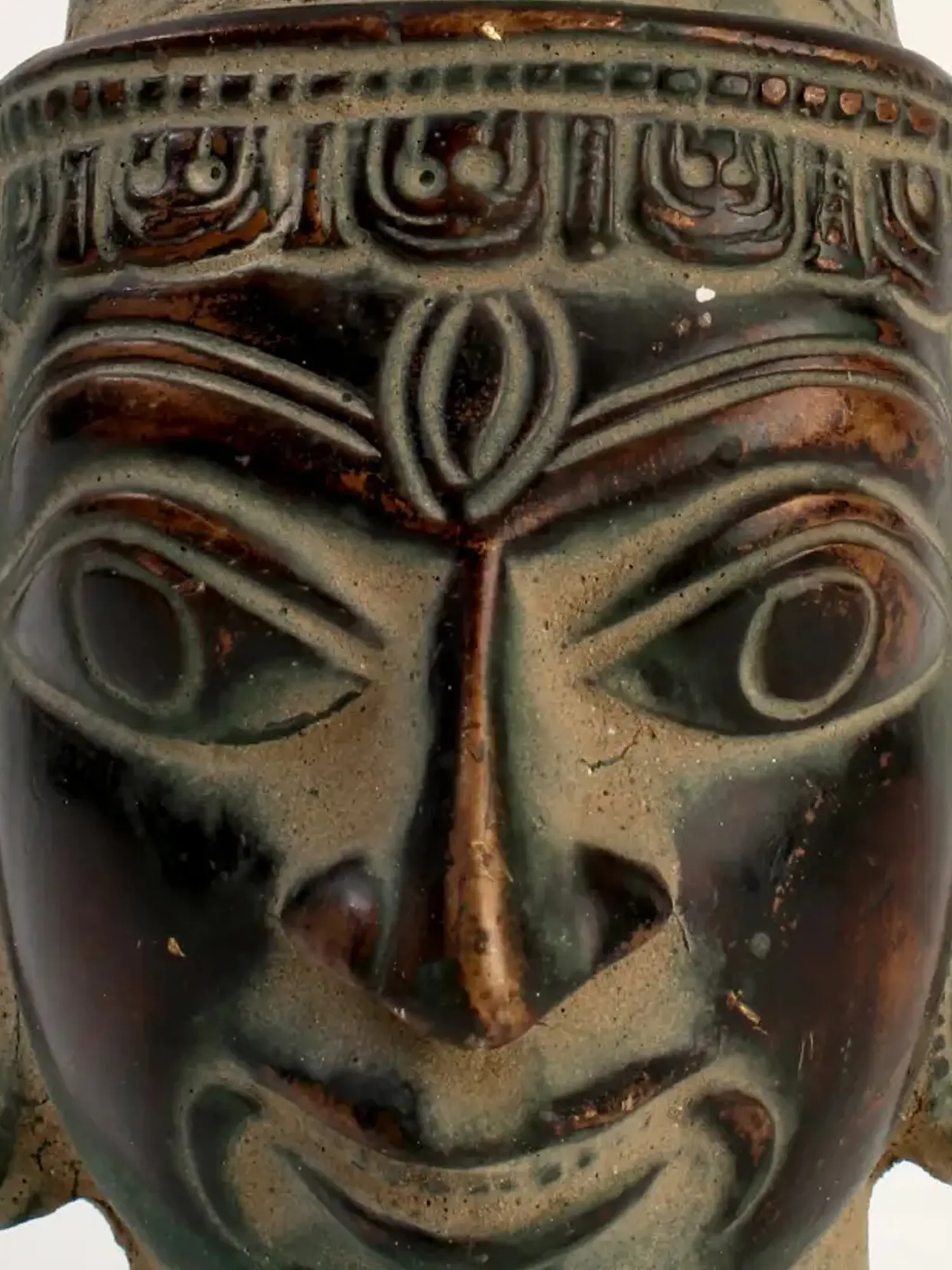 This exquisite brass head, rendered in a timeless artistic style, captures the very essence of Lord Shiva, the supreme deity in Hinduism. With a serene yet powerful expression, it invites contemplation and reverence. The detailed craftsmanship, evident in every line and curve, speaks to a rich tradition of artistic creation, passed down through generations. The patinated brass, bearing the marks of time and devotion, lends an aura of antiquity and spiritual depth to this remarkable piece. It’s more than just a statue; it’s a conduit to the divine, a tangible representation of a deity who embodies creation, preservation, and destruction, the cyclical nature of existence itself.