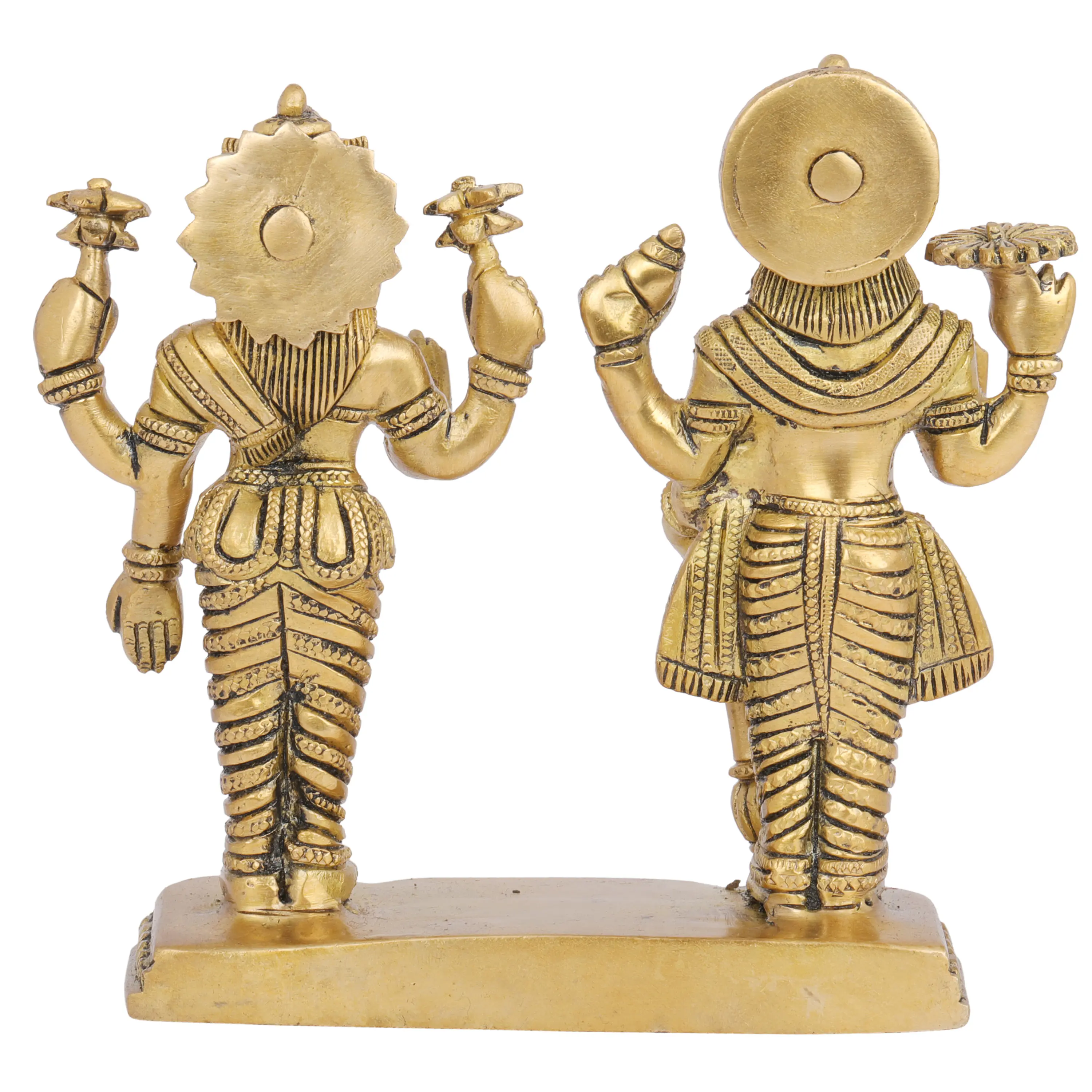 This divine pair is cast in brass, a metal revered in many traditions for its purity and auspicious properties. Brass has been used for centuries in the creation of sacred objects and idols, believed to possess qualities that amplify spiritual energy and attract positive vibrations. The handmade nature of this sculpture ensures that each piece is unique, imbued with the soul of the artisan who brought it to life. The intricate detailing, from the divine headdresses to the elaborate garments and the symbolic objects held in their hands, speaks volumes about the skill and dedication of the craftspeople. The patina of the brass lends a timeless quality, suggesting an artifact passed down through generations. The base on which they stand is also adorned with intricate carvings, further enhancing the aesthetic appeal and signifying the sacred platform upon which these deities preside. Placing this figurine in your puja room, living space, or office can serve as a constant reminder of the divine principles they represent, fostering an environment of peace, prosperity, and spiritual growth. It makes for a thoughtful and meaningful gift for loved ones, especially during festivals and auspicious occasions, conveying wishes for well-being and abundance.