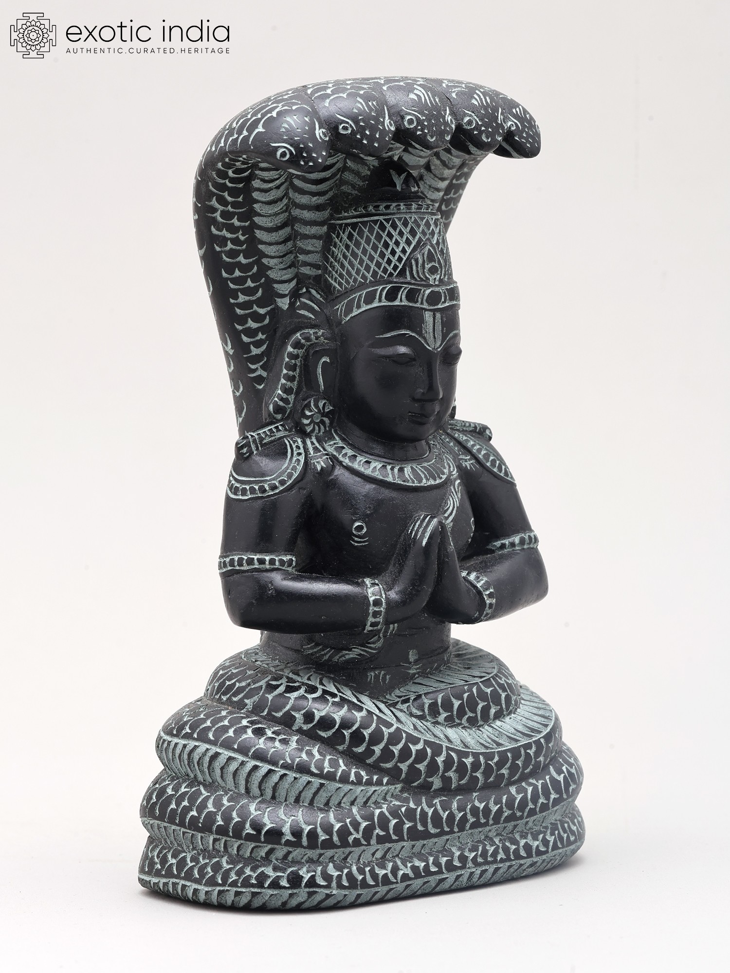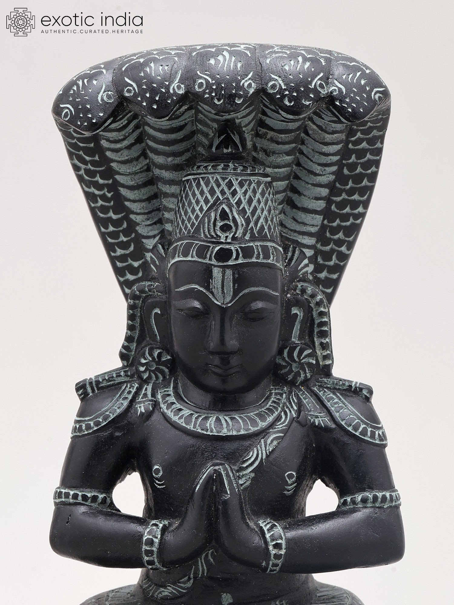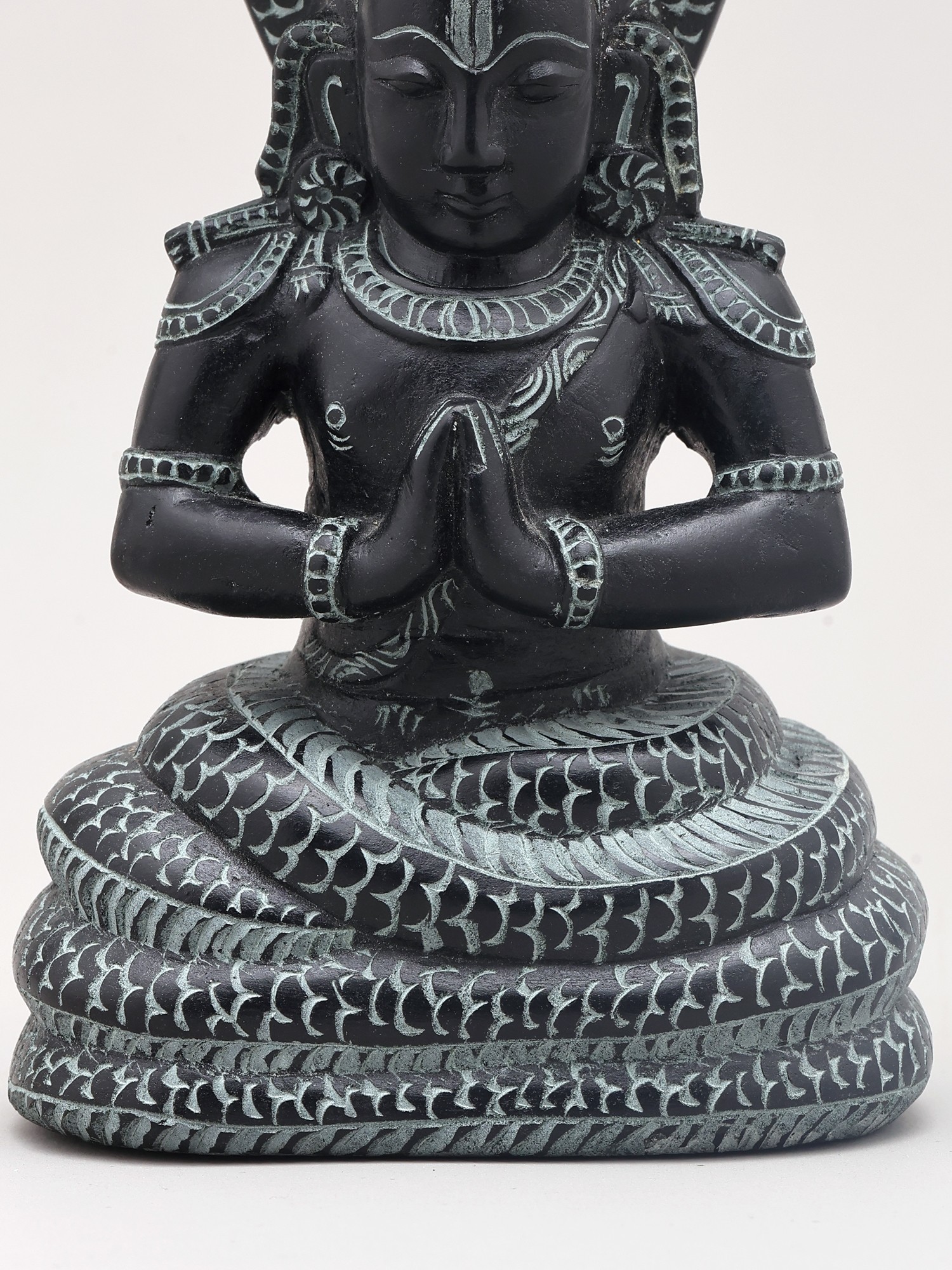 Maharshi Patanjali is most famously known for codifying the ancient practice of Yoga into the Yoga Sutras. These seminal texts provide a philosophical and practical framework for achieving inner peace and self-realization. His teachings delve into the eight limbs of yoga (Ashtanga Yoga), guiding practitioners toward physical, mental, and spiritual discipline. The posture of the statue, with hands clasped in Namaste, signifies reverence, respect, and the harmonious union of the individual with the divine. The intricate carvings on the figure, from the textured scales of the serpent to the symbolic adornments on Patanjali's attire, speak to the rich cultural heritage and the devotional spirit embedded in Indian craftsmanship. ––––––––––––––––––––