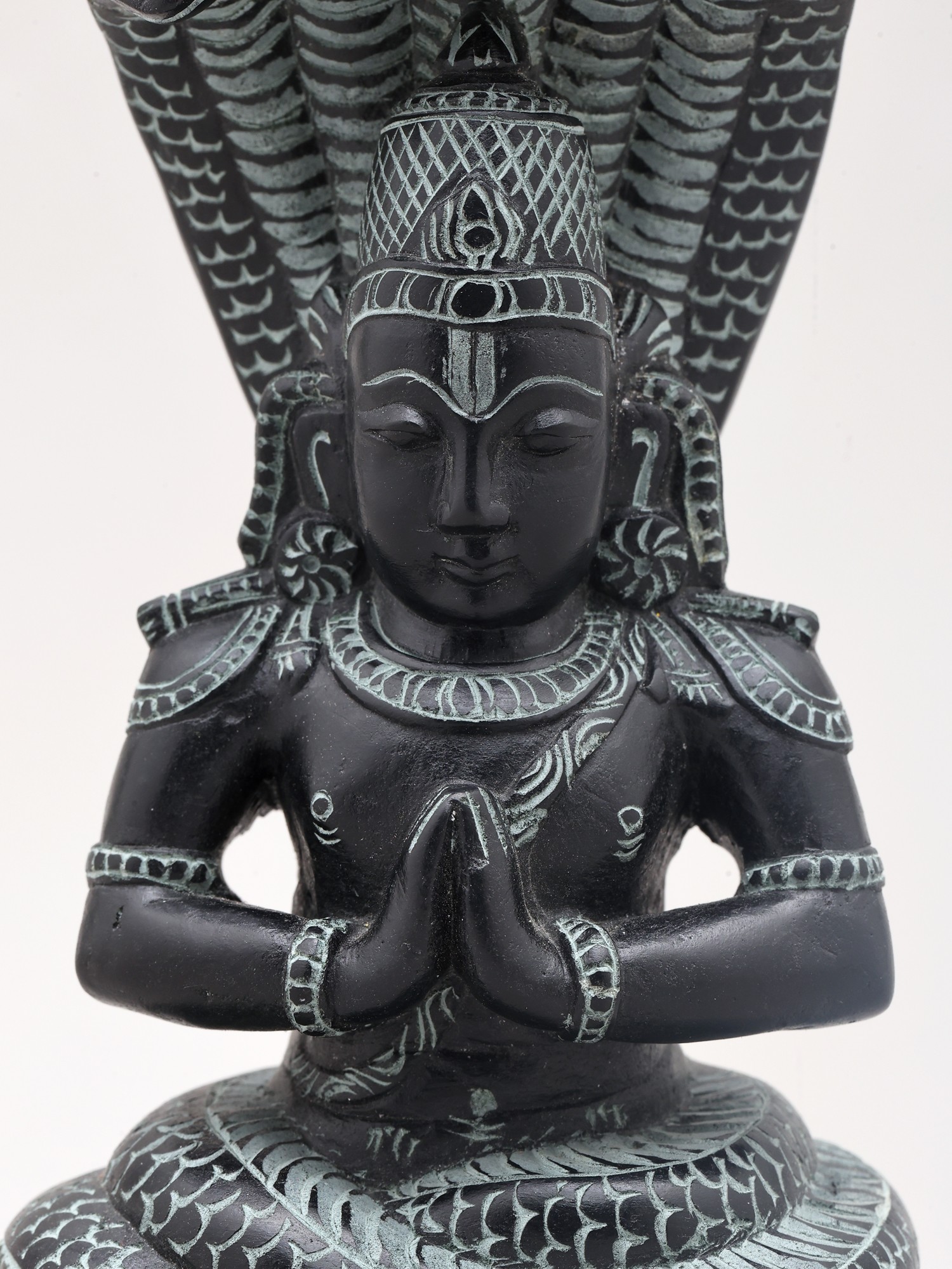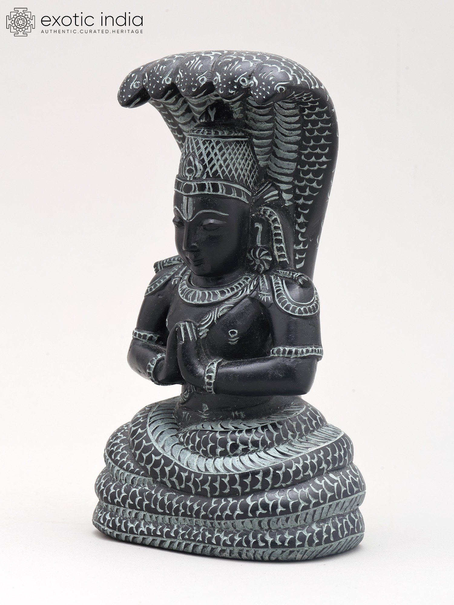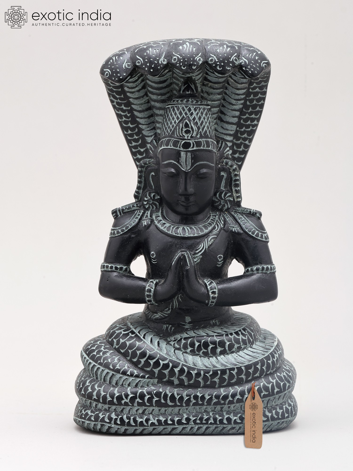Maharshi Patanjali is most famously known for codifying the ancient practice of Yoga into the Yoga Sutras. These seminal texts provide a philosophical and practical framework for achieving inner peace and self-realization. His teachings delve into the eight limbs of yoga (Ashtanga Yoga), guiding practitioners toward physical, mental, and spiritual discipline. The posture of the statue, with hands clasped in Namaste, signifies reverence, respect, and the harmonious union of the individual with the divine. The intricate carvings on the figure, from the textured scales of the serpent to the symbolic adornments on Patanjali's attire, speak to the rich cultural heritage and the devotional spirit embedded in Indian craftsmanship. ––––––––––––––––––––