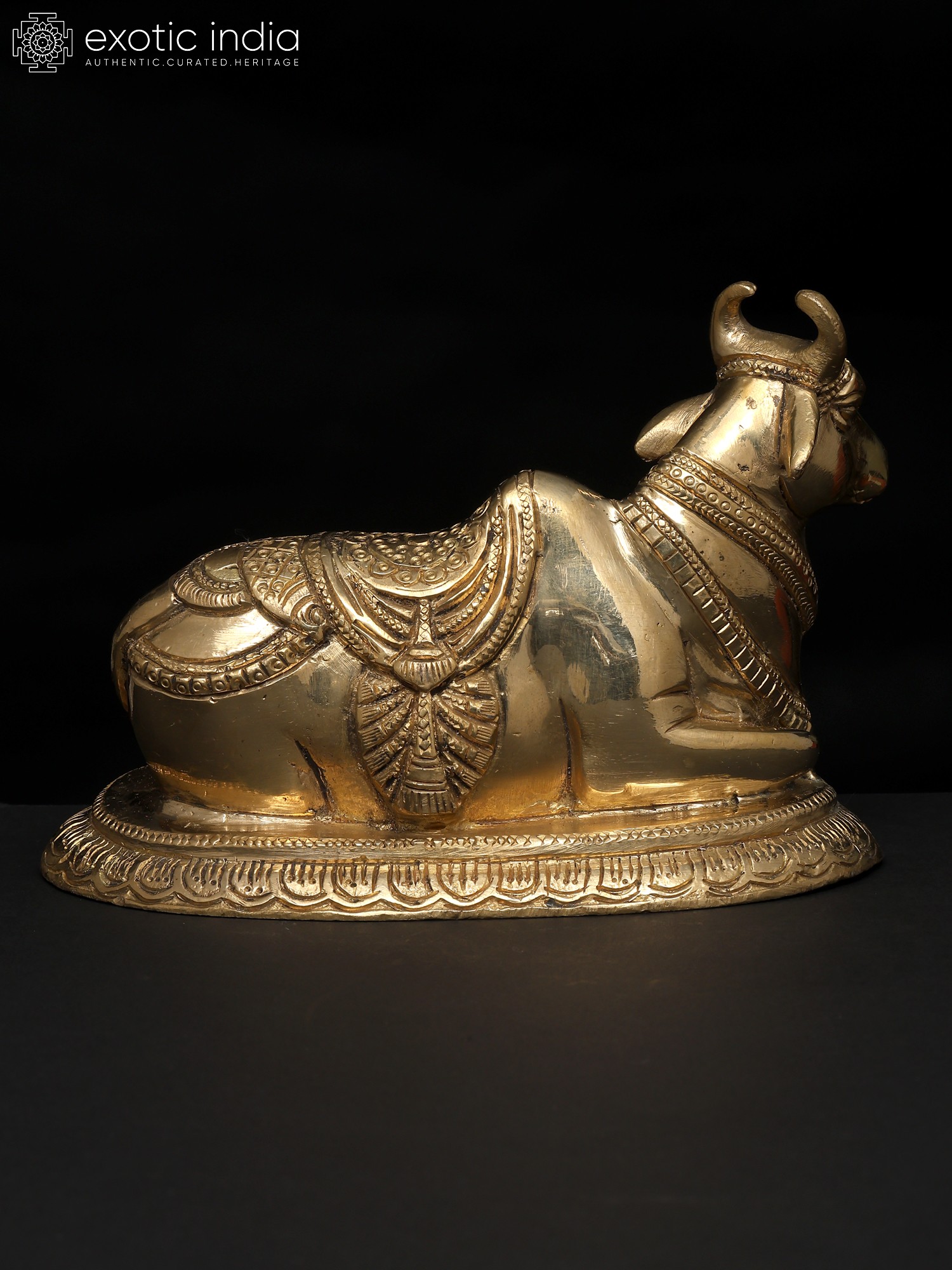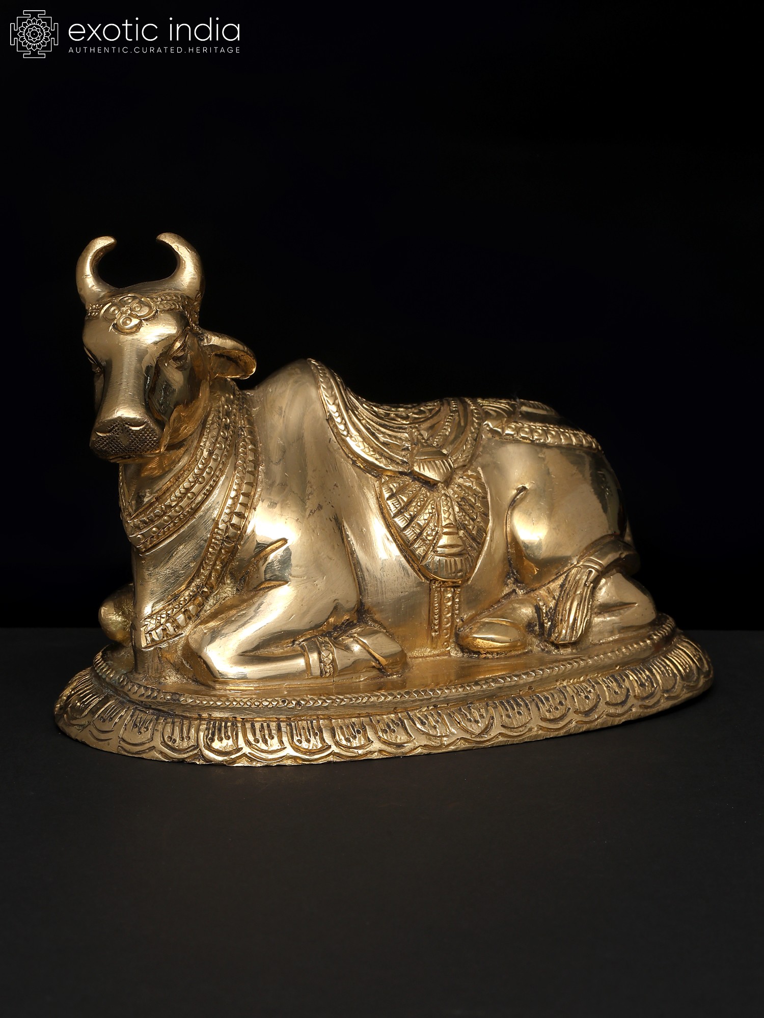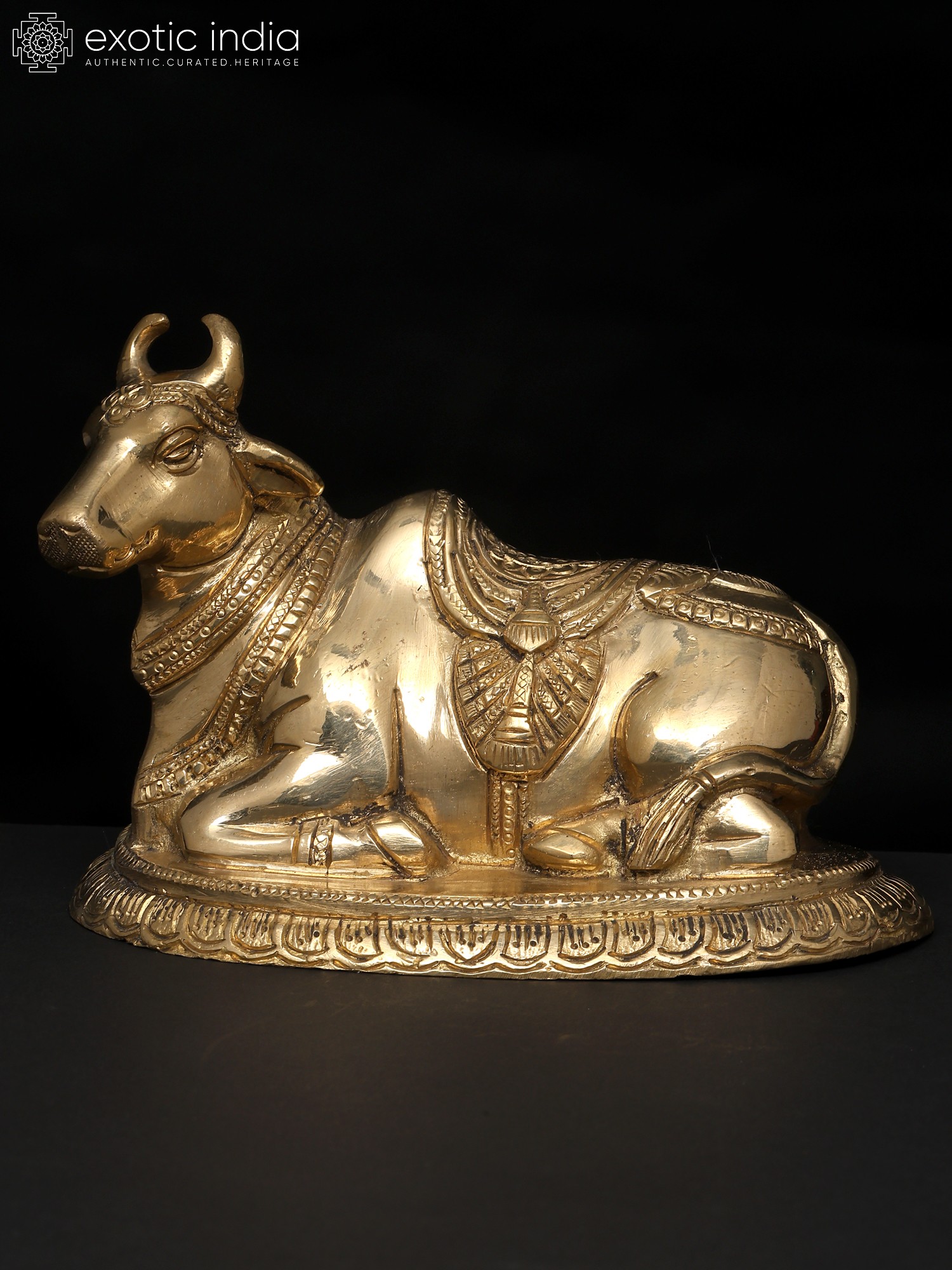 Nandi, also known as “Nandikeshvara” or “Nandideva”, is the Vahana (Mount) of “Lord Shiva” (the Supreme Being). Nandi is considered to be the guardian deity of “Kailasha” which is the abode of Mahadev. Manifested in the form of a majestic bull, Nandi is a symbol of strength, purity, and unwavering devotion. Seated regally, adorned with celestial robes, he embodies grace and reverence. Crafted in brass with precision, this artwork is believed to usher in positive energies, tranquillity, and a sense of protection, dispelling negativity.