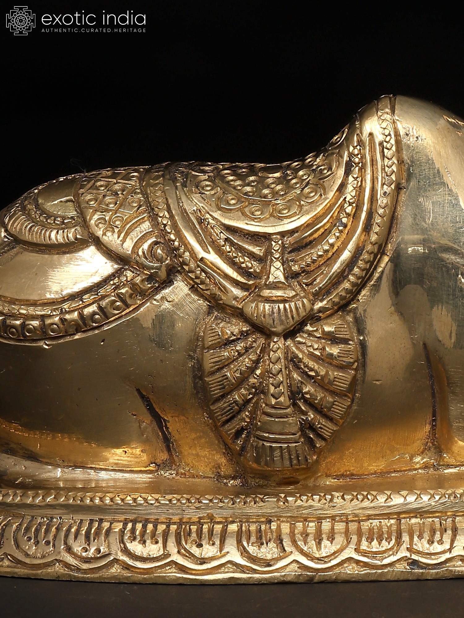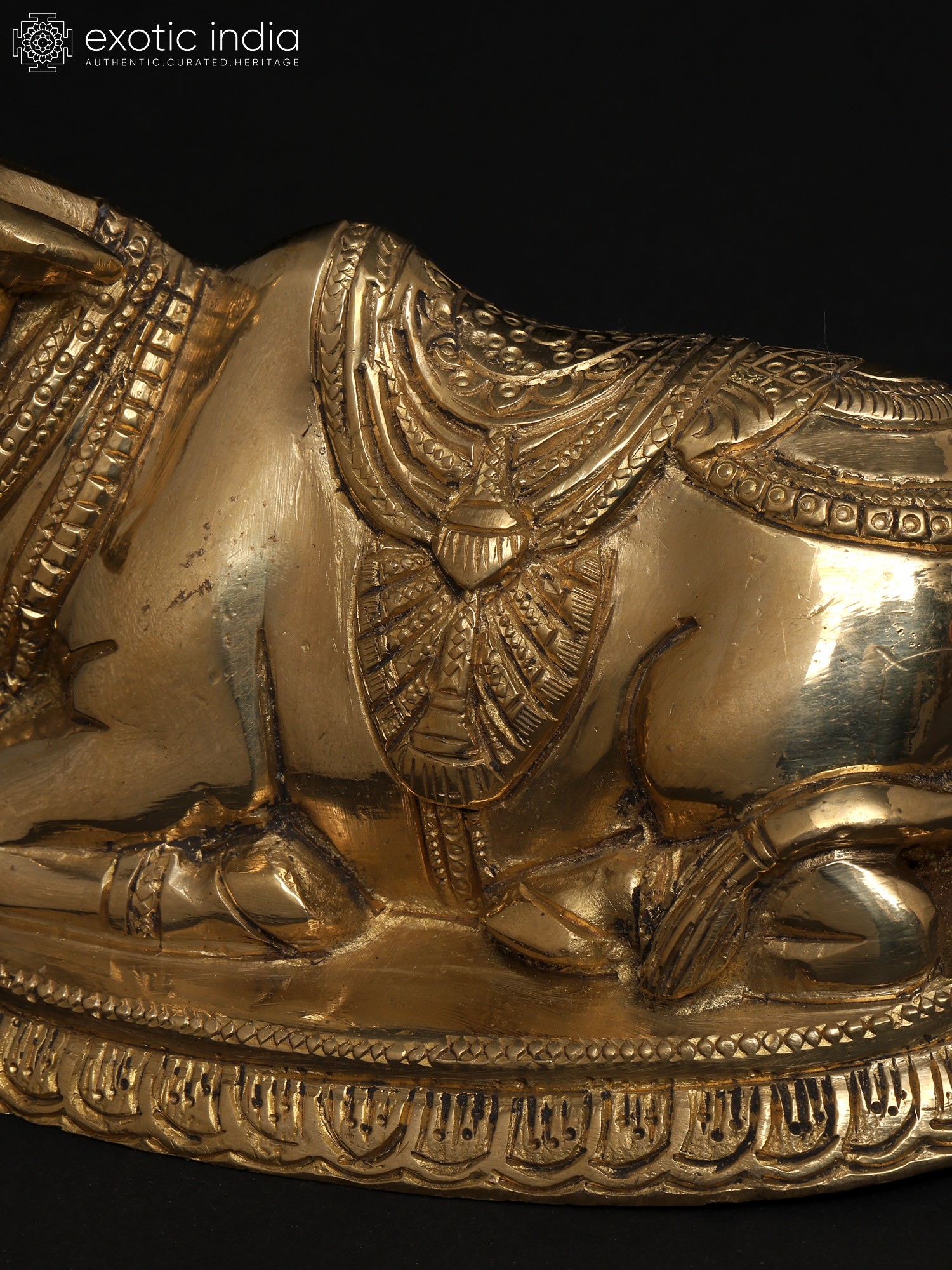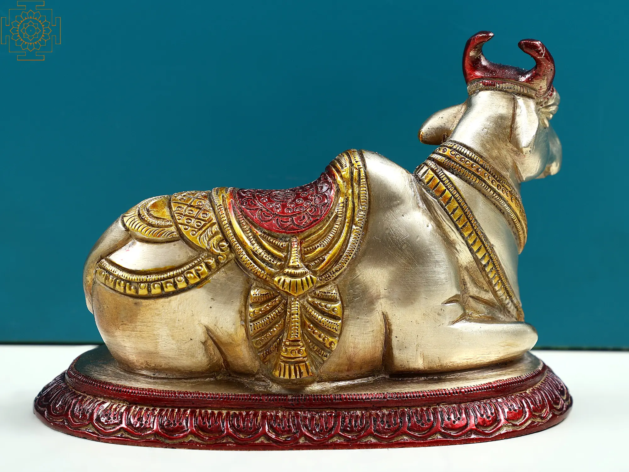 Nandi, also known as “Nandikeshvara” or “Nandideva”, is the Vahana (Mount) of “Lord Shiva” (the Supreme Being). Nandi is considered to be the guardian deity of “Kailasha” which is the abode of Mahadev. Manifested in the form of a majestic bull, Nandi is a symbol of strength, purity, and unwavering devotion. Seated regally, adorned with celestial robes, he embodies grace and reverence. Crafted in brass with precision, this artwork is believed to usher in positive energies, tranquillity, and a sense of protection, dispelling negativity.