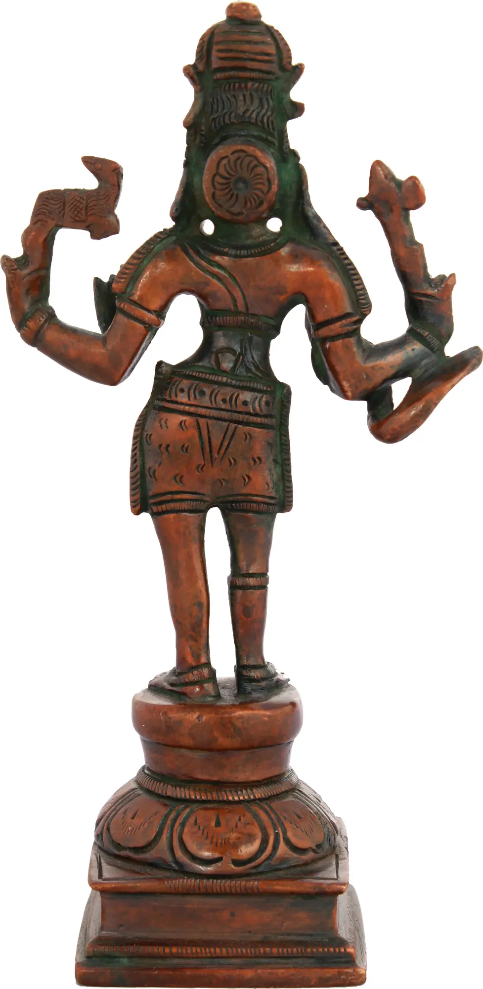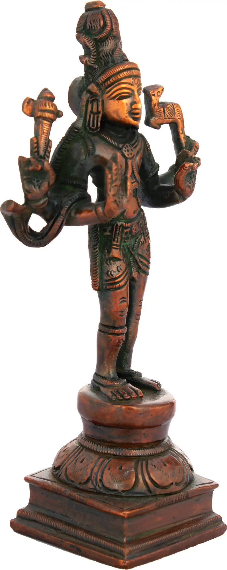 According to legends, Pashupatinath is an incarnation of Lord Shiva. He is also known as the “Lord of animals”. In this sculpture, Lord Pashupati has been depicted in Abhaya Mudra (gesture of fearlessness), signifying his role as the protector and provider of divine assurance. In his right hand, he is carrying a goad (Ankusha) symbolising his power to guide and control his devotees on the path of righteousness. In his left hand, Pashupati carries a deer, representing his compassionate and caring nature towards animals. Lord Pashupati is adorned with celestial ornaments, symbolising his status as the cosmic ruler and the lord of all creatures. Meticulously crafted in brass, this masterpiece is a perfect fit for altars and sacred spaces, radiating spiritual energy and blessings.