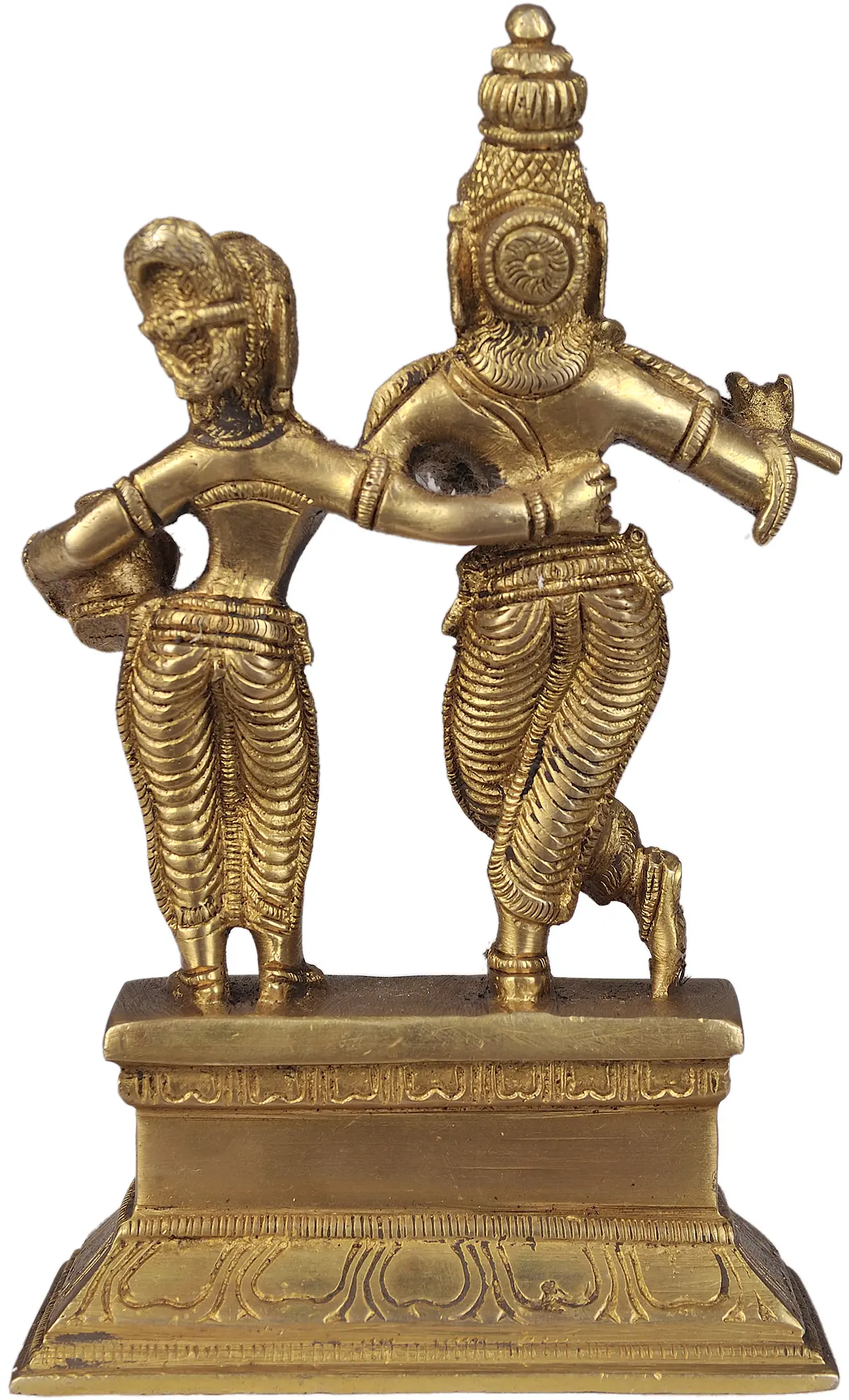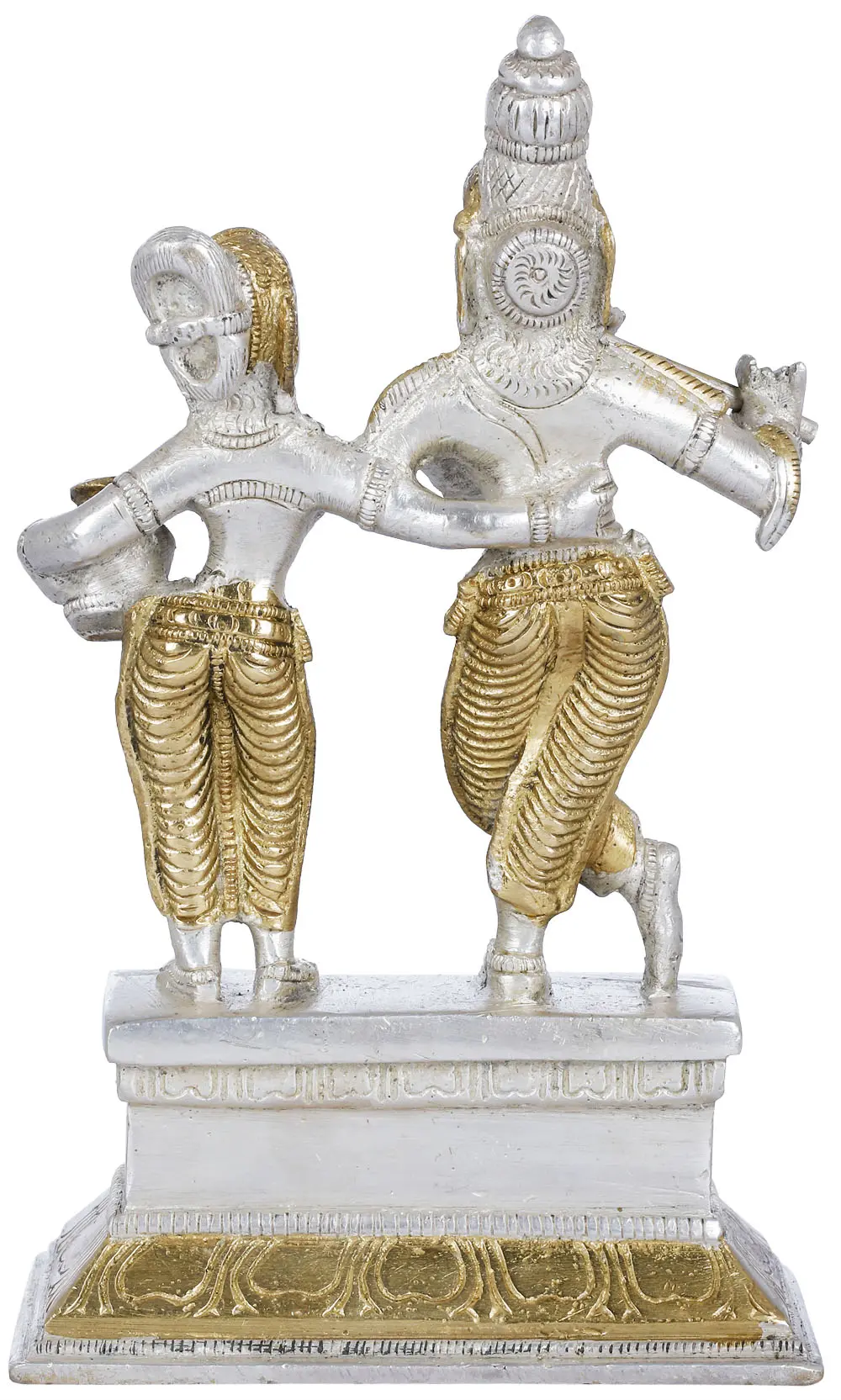 Handmade with devotion, the brass Radha Krishna sculpture captures the divine love between Radha and Krishna. Radha, adorned with intricate jewelry, symbolizes devotion and human emotion. Krishna's flute resonates with melodies that allure the soul. His peacock feather crown signifies his divine playfulness. Their intertwined hands reflect divine union. As Krishna's beloved, Radha embodies pure devotion. This artwork encapsulates the depth of their love, an enduring testament to the intimate bond between the soul and the divine.