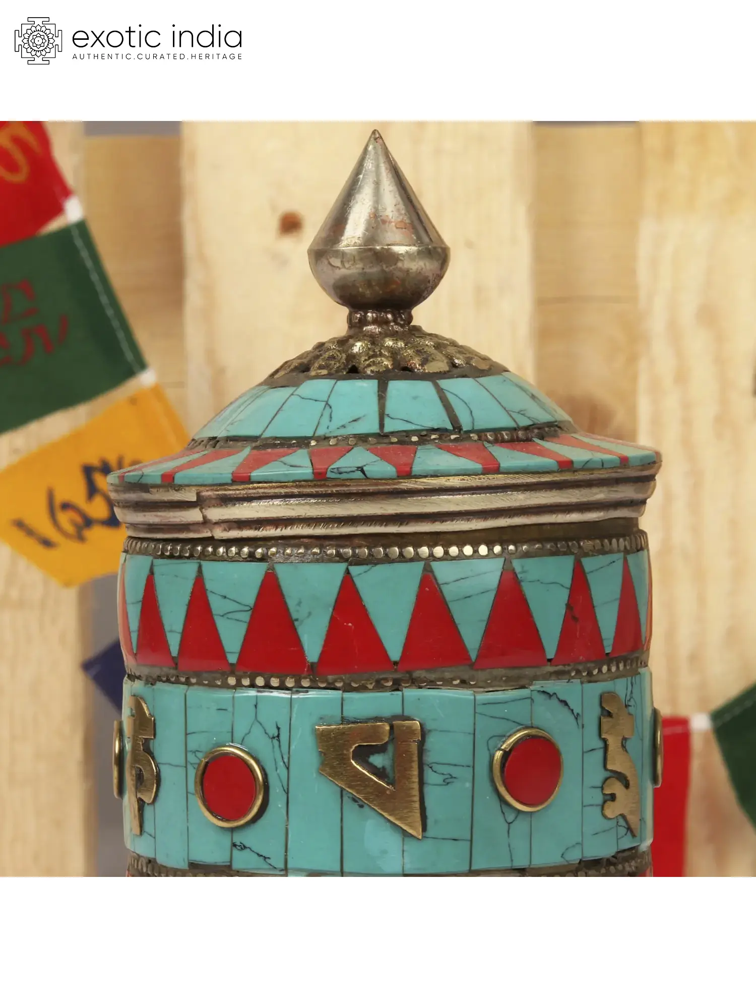 The prayer wheels are sacred objects used in the meditation process. It is believed that each turn of the cylinder generates much merit as the reading of the sutras. This Rotating Prayer Wheel on Base with Inlay Work, a masterpiece from Nepal, is a fusion of art and spirituality and allows the devotees to meditate without hindrance. Crafted meticulously from brass with exquisite inlay work, it sits elegantly on a base. As the wheel turns, it's believed to unleash blessings and positive energies. This creation encapsulates devotion and culture, offering a visual and spiritual journey through the ancient traditions of Nepal.
