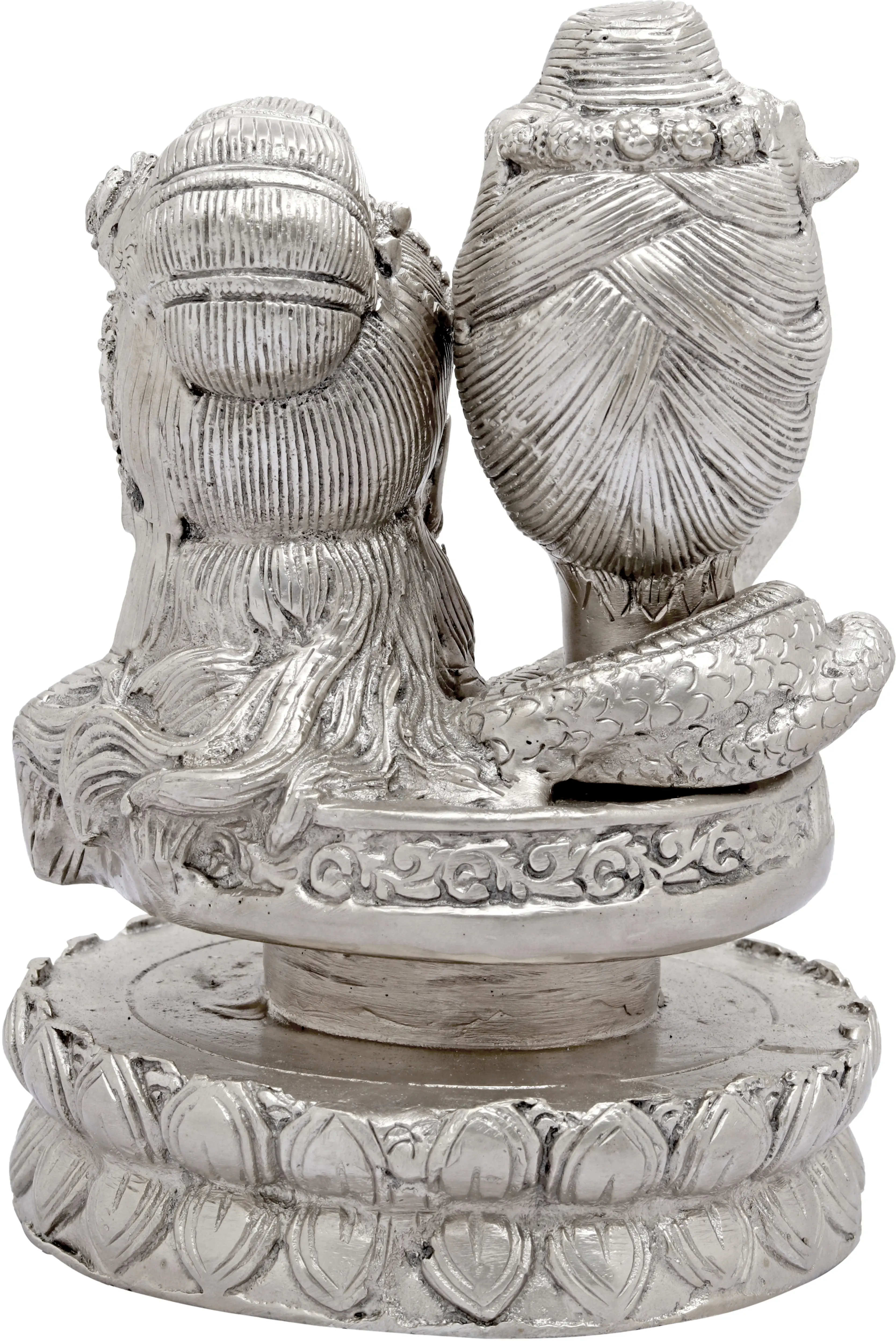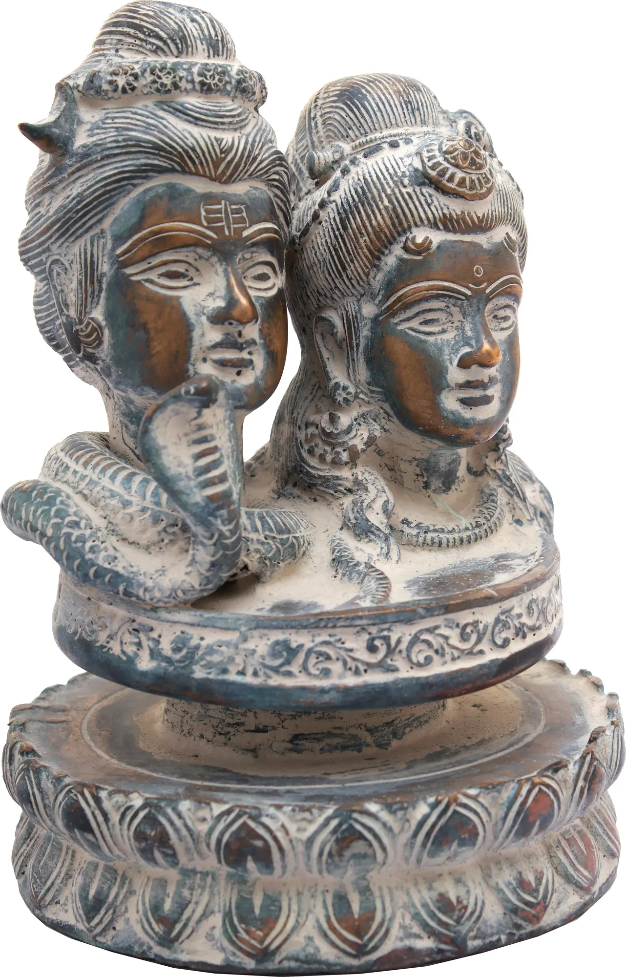 This brass sculpture portrays the divine union of Shiva and Parvati in the form of a Shiva Linga. Shiva, the destroyer and creator, holds a trident, symbolizing his mastery over the three gunas (qualities) of nature. Parvati, the nurturing mother goddess, holds a lotus, signifying purity and enlightenment. The Shiva Linga represents the cosmic pillar, the source of all creation. As you contemplate this sculpture, it becomes a reminder of the balance between the masculine and feminine energies, the dance of creation and destruction, and the union of opposites that underlies all existence.
