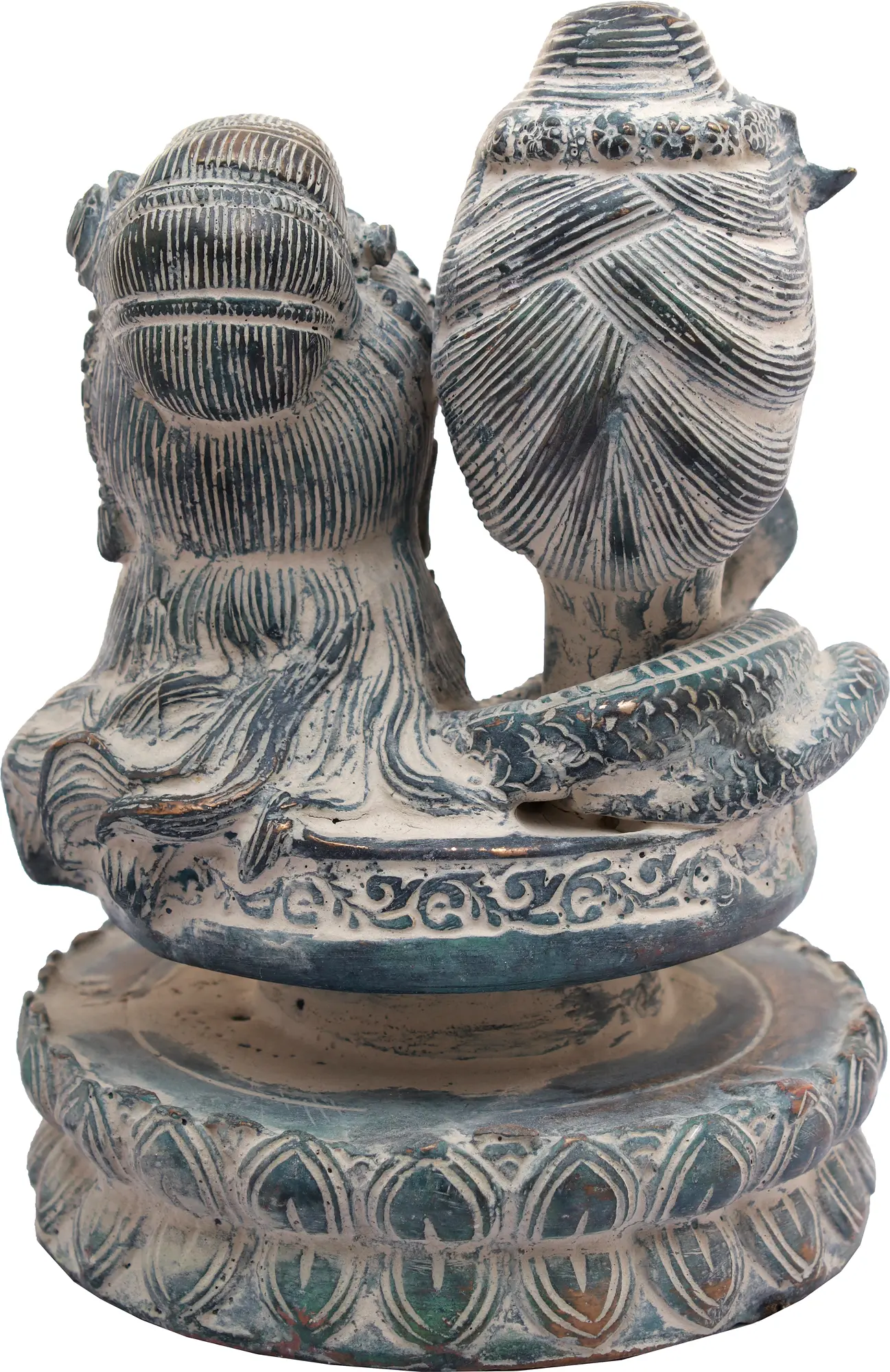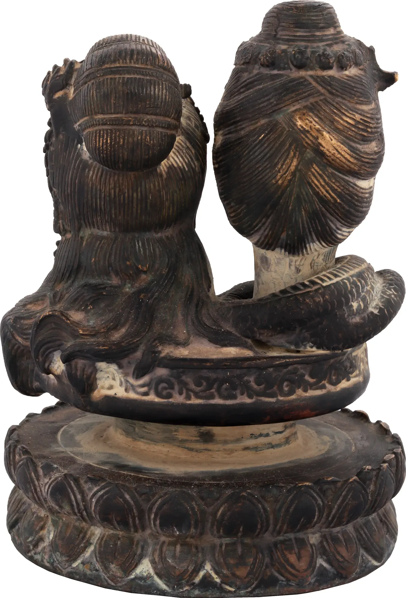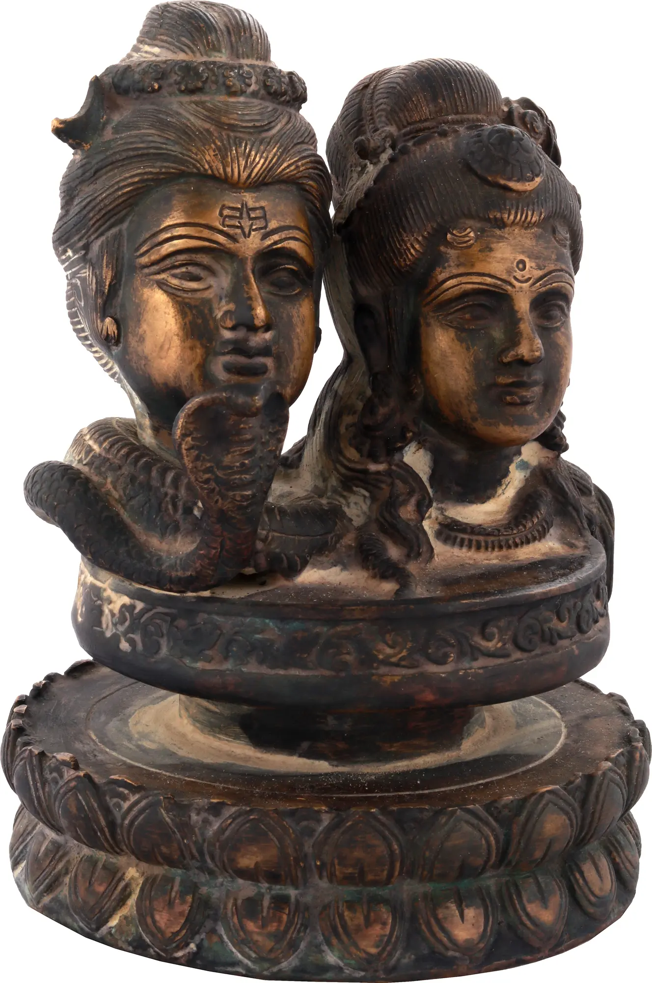 This brass sculpture portrays the divine union of Shiva and Parvati in the form of a Shiva Linga. Shiva, the destroyer and creator, holds a trident, symbolizing his mastery over the three gunas (qualities) of nature. Parvati, the nurturing mother goddess, holds a lotus, signifying purity and enlightenment. The Shiva Linga represents the cosmic pillar, the source of all creation. As you contemplate this sculpture, it becomes a reminder of the balance between the masculine and feminine energies, the dance of creation and destruction, and the union of opposites that underlies all existence.