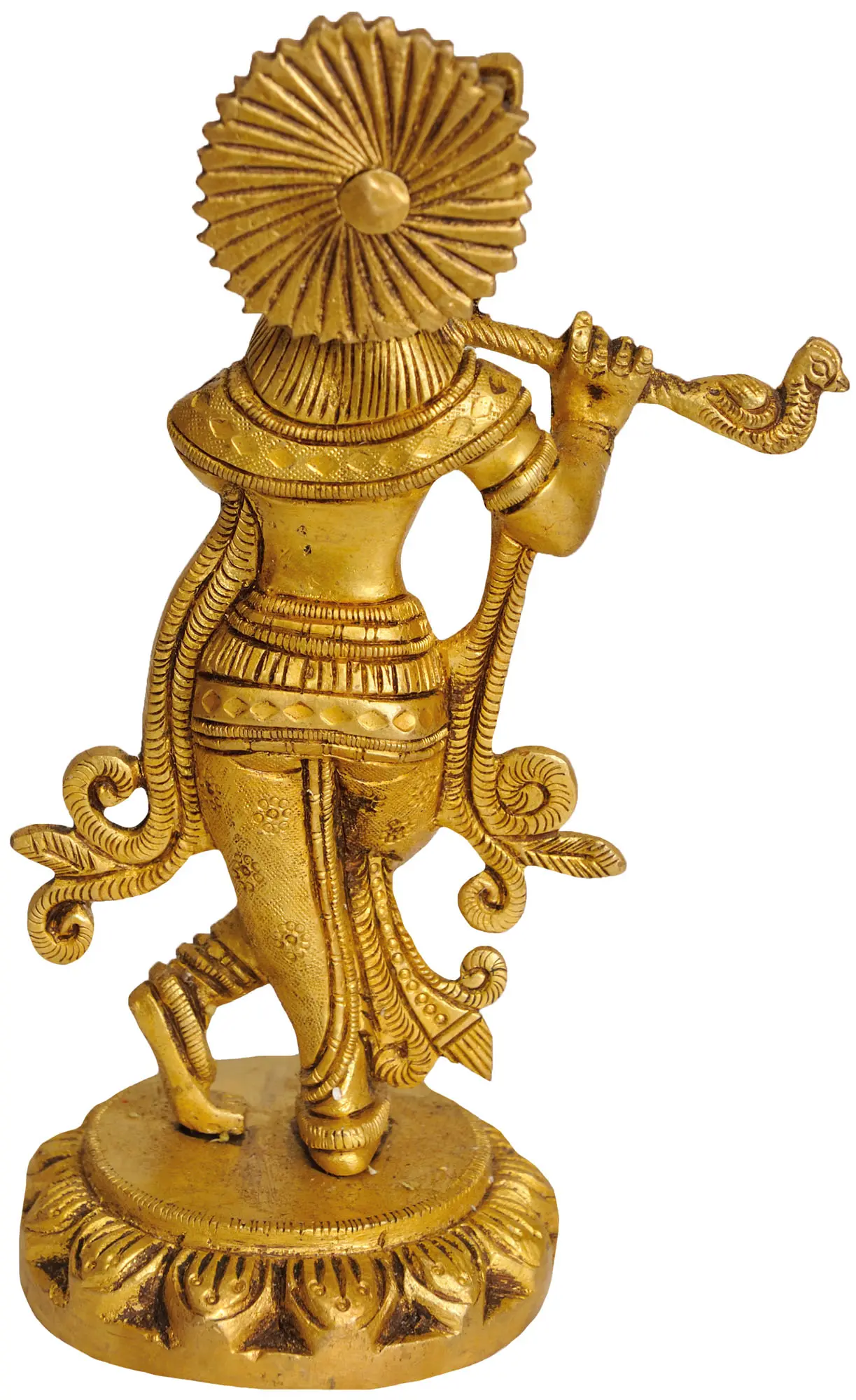 Shri Krishna, adorned in regal attire, has been depicted playing his divine flute. With grace transcendent, Shri Krishna weaves melodies that enchant all creation. His radiant form, adorned in royal attire, resonates with celestial elegance, captivating both mortal and divine beings. The ‘mellifluous notes’ that flow from his flute resonate with the heartbeat of the universe, invoking a profound sense of serenity and devotion. As Krishna plays the flute, the world pauses to revel in his celestial music, signifying the ethereal beauty of his presence. Crafted from lustrous brass, this artwork radiates spirituality and cultural richness, making it a perfect addition to your home decor.