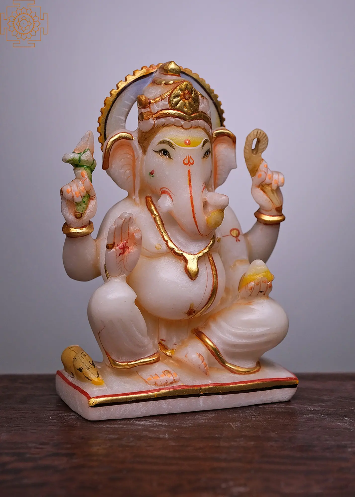 This finely sculpted Ganesha statue showcases the deity in his iconic form, adorned with divine attributes that hold significant meaning. The auspicious mark of the swastika is clearly visible on his palm, a symbol of good fortune and well-being that has been revered across cultures for millennia. His hands are in poses that bestow blessings and offer protection. One hand holds a delicate lotus, a symbol of purity and spiritual enlightenment, while another displays the 'abhaya mudra', a gesture of fearlessness and protection. The statue is further embellished with subtle yet elegant gold accents, enhancing its divine aura and adding a touch of regal splendor. The white marble itself carries cultural significance, often associated with purity, divinity, and the celestial realm in many traditions. The smooth, luminous quality of the marble allows the divine form of Ganesha to emanate a soft, ethereal glow, making it a truly captivating centerpiece for any altar, study, or living space. This handmade piece is not merely a decorative item but a tangible representation of devotion, a reminder of the spiritual path, and a conduit for invoking positive energies and removing impediments from your life's journey. It serves as a constant source of inspiration, encouraging wisdom, prosperity, and the courage to face any challenge with grace and intelligence.