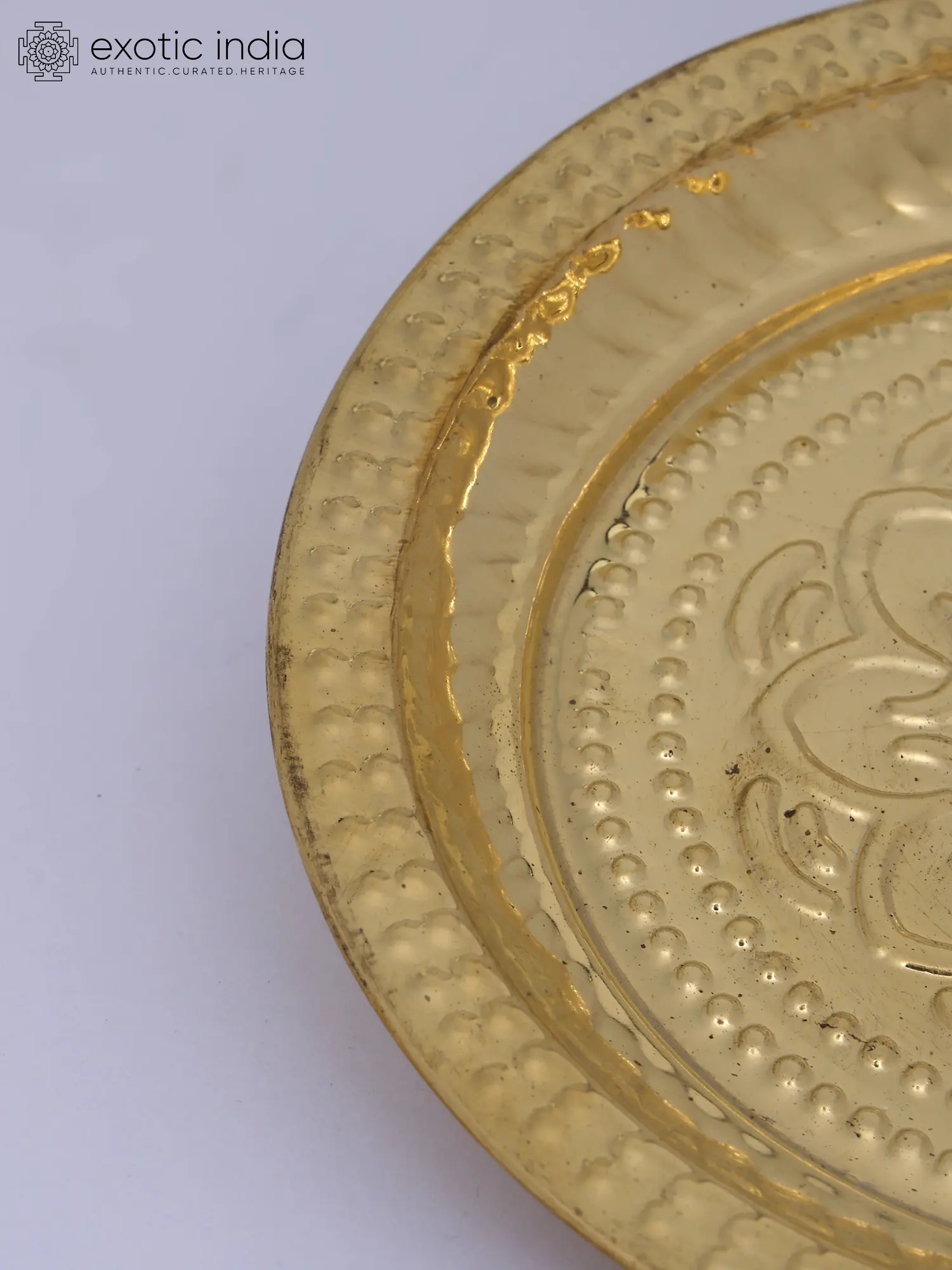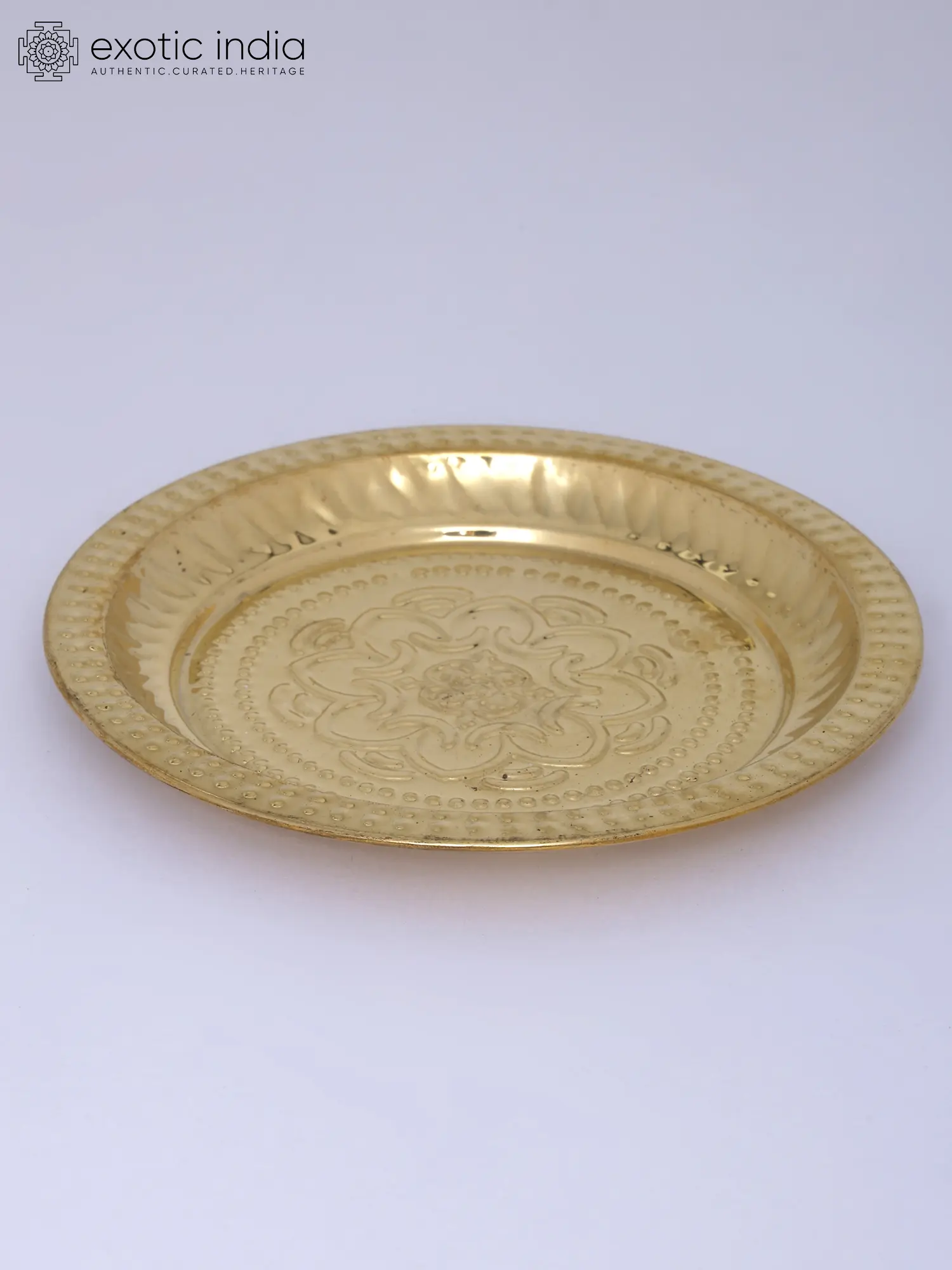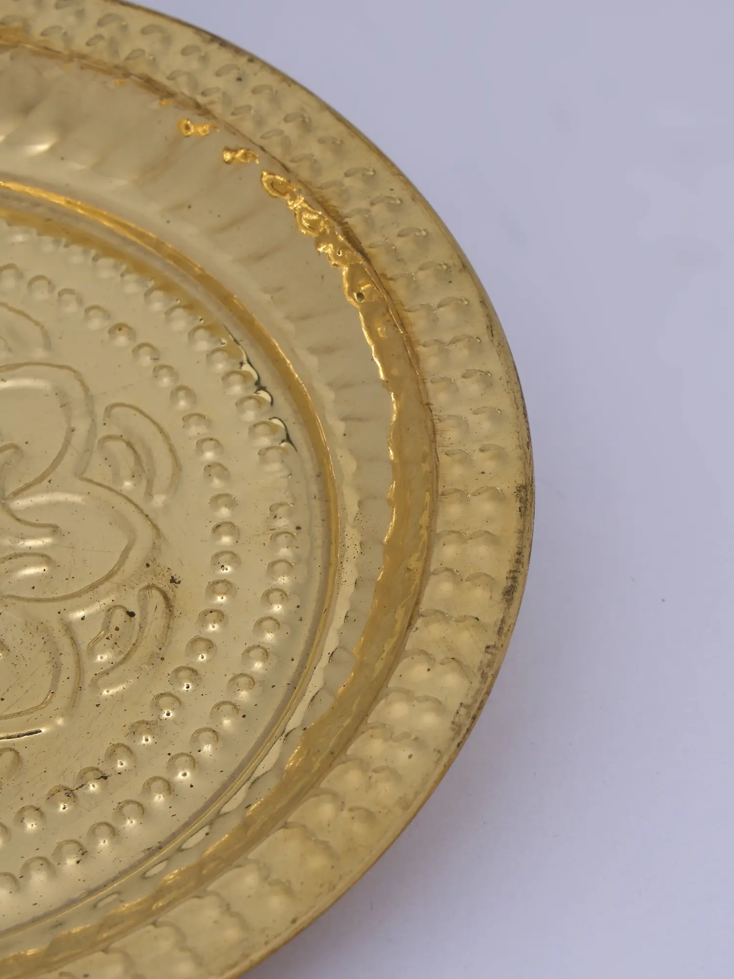 Brass plates with floral motifs have long been a part of ritual offerings. These plates are specially constructed and enriched with traditional designs of flora and fauna to make the offering scene look beautiful. This brass plate in focus carries the matt brass finish; it has a bloomed lotus motif at the center, surrounded by a circle of paisley motifs. This plate is a humble yet elegant piece of ritual objects that perfectly serves its purpose.