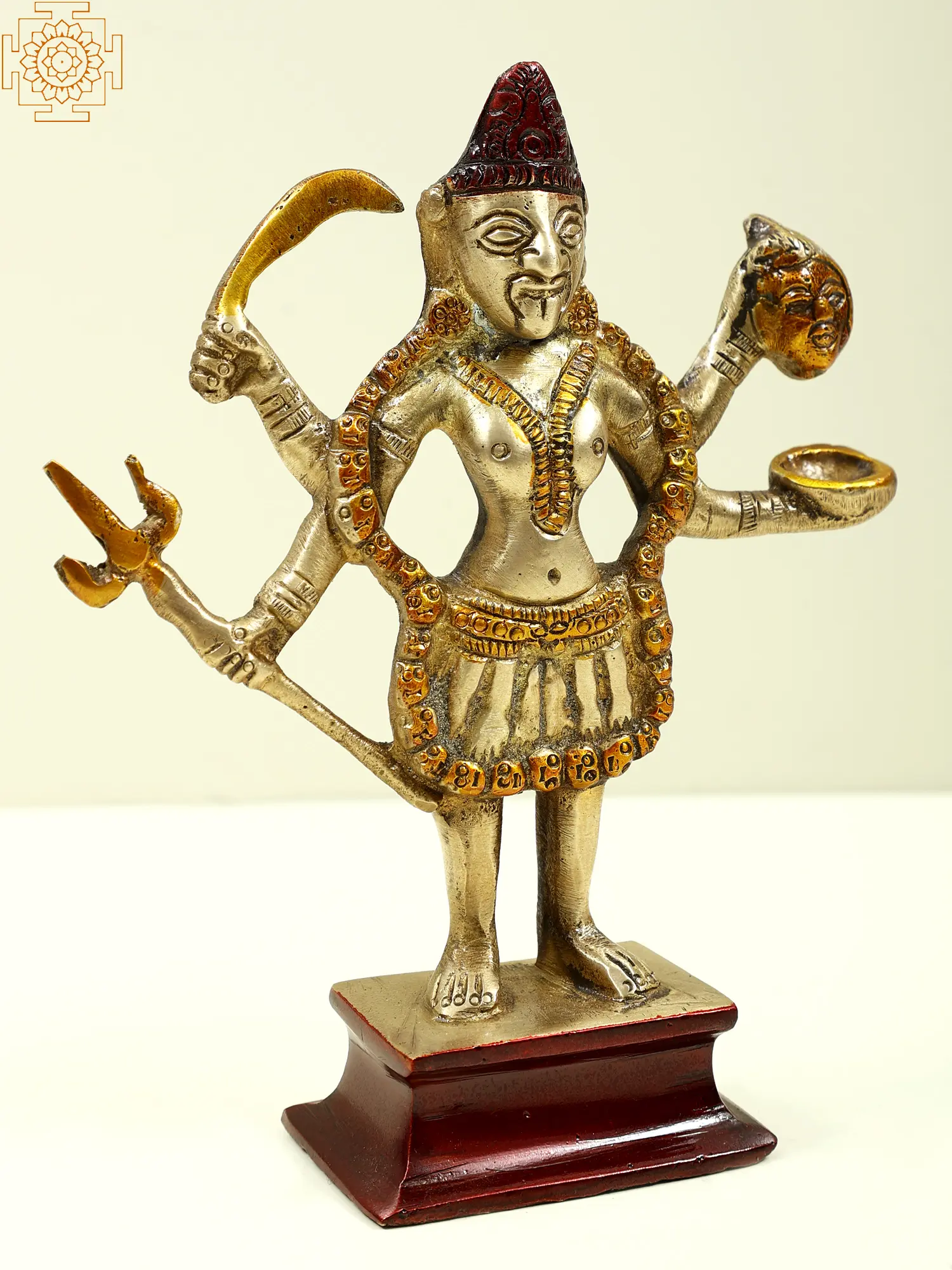 The Chaturbhuja Kali brass sculpture creates an atmosphere of empowerment and protection. Whether put on a holy altar, meditation room, or as a focal point in your house, it serves as a constant reminder of the divine feminine transformative power and your own inner strength. With her untamed hair flowing freely and her tongue protruding, the Chaturbhuja Kali depicts the Devi in her classic form. She is pictured wearing a garland of demon heads, symbolizing her victory over Moha (humane attachment) and Maya (misbelief). Her four arms are adorned with weaponry specially designed for her to combat the devils who lead the human race astray from the path of enlightenment.