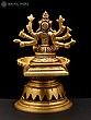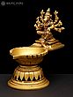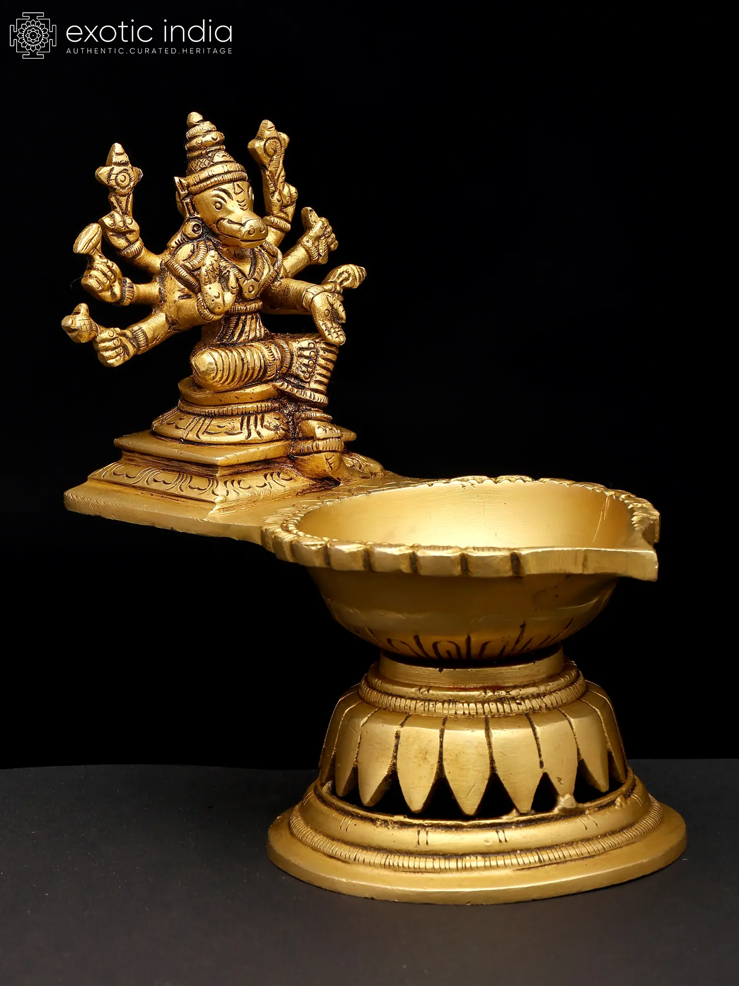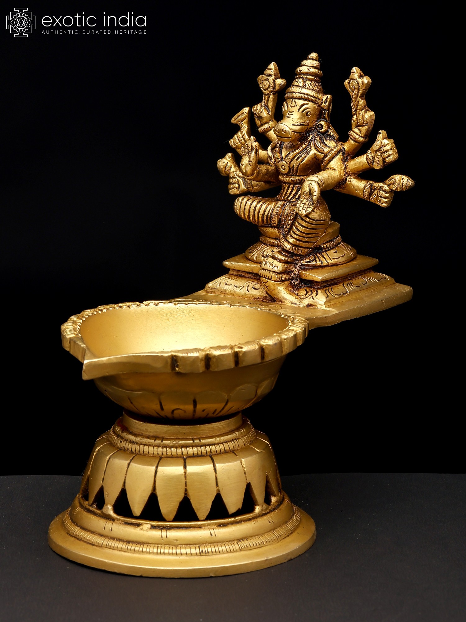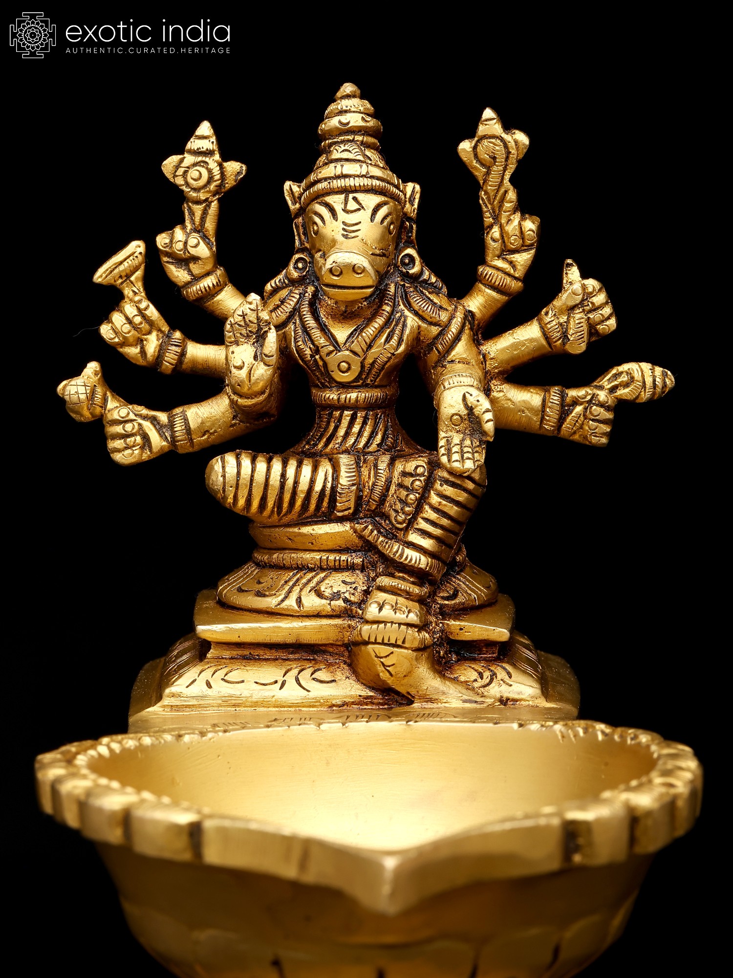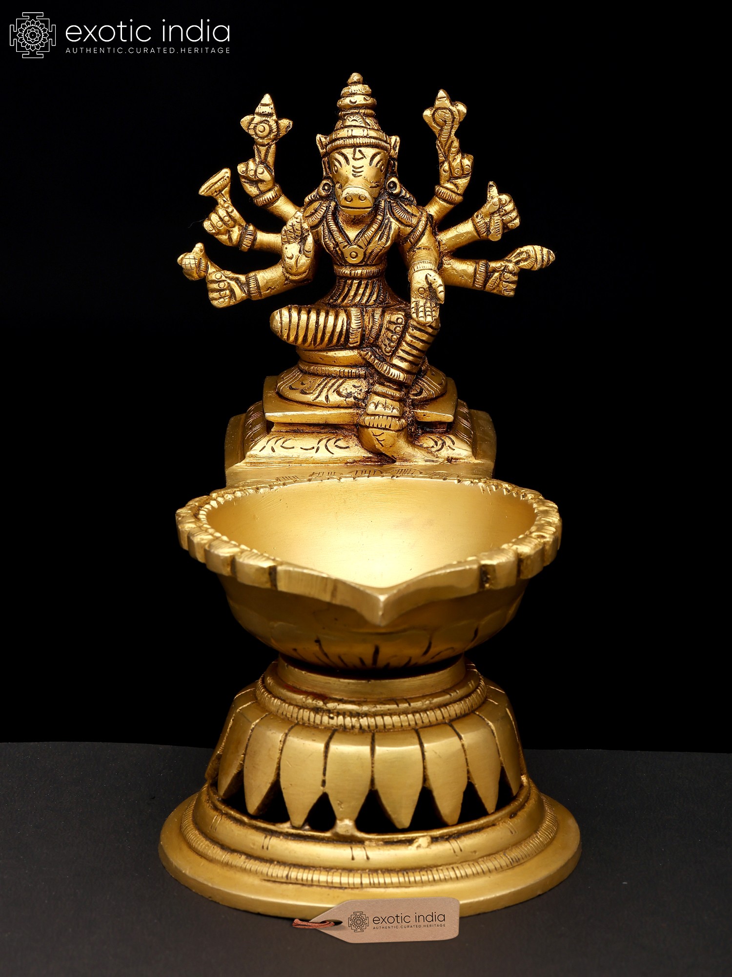 Goddess Varahi is a principal aspect of the Sapta Matrikas, the seven divine mothers, and is often depicted with the head of a sow, symbolizing strength, ferocity, and the ability to till and nurture the earth. In Hindu mythology, she is said to have emerged from the tusks of the Varaha avatar of Lord Vishnu, a testament to her protective and transformative powers. Her multi-armed form signifies her ability to engage with and vanquish multiple negative forces simultaneously. Each hand in this lamp's sculpture is adorned with symbolic implements, representing her various powers and attributes, ready to ward off evil and grant boons. The seated posture conveys her seated authority, ever vigilant over her followers.