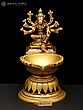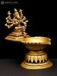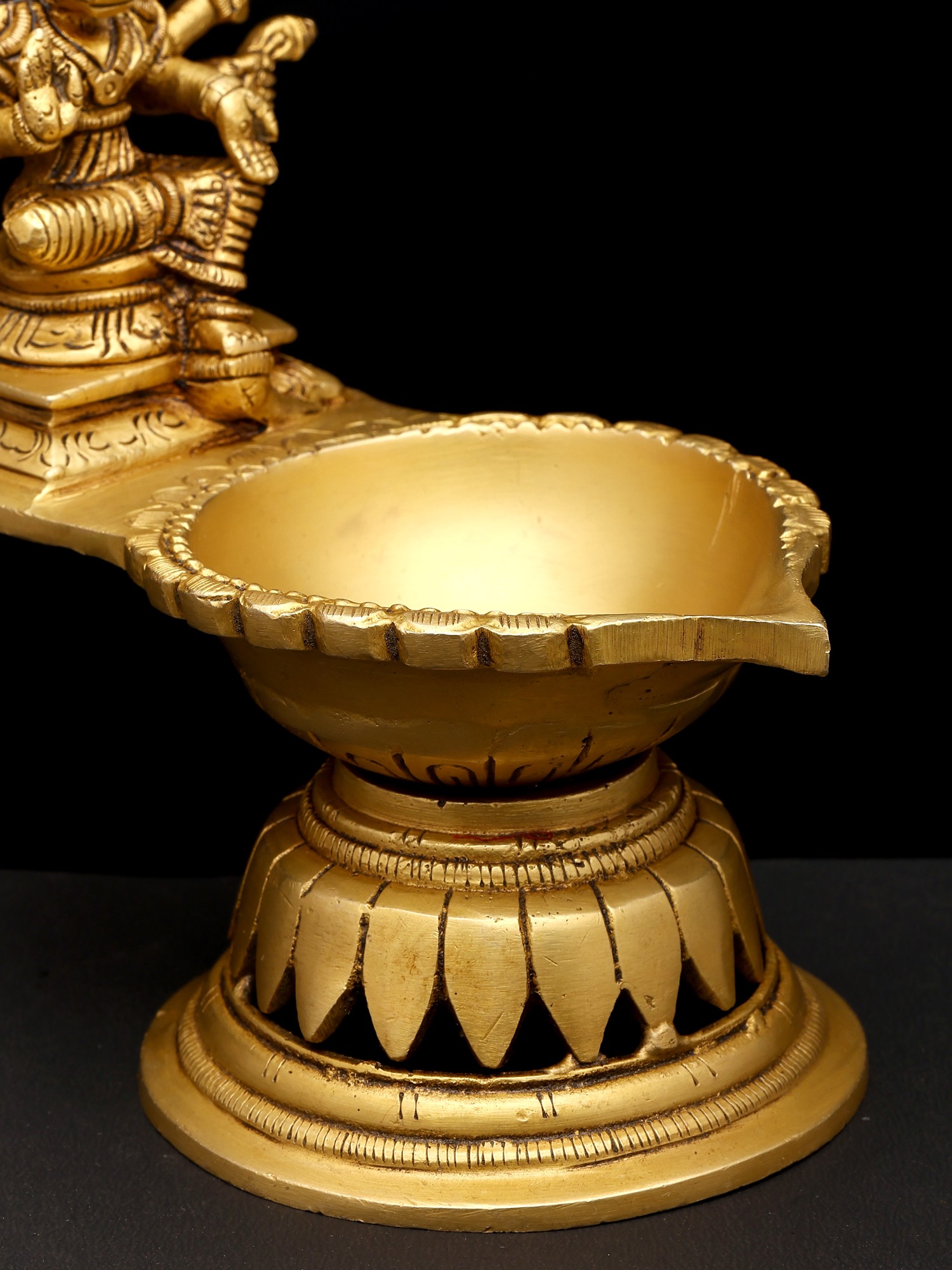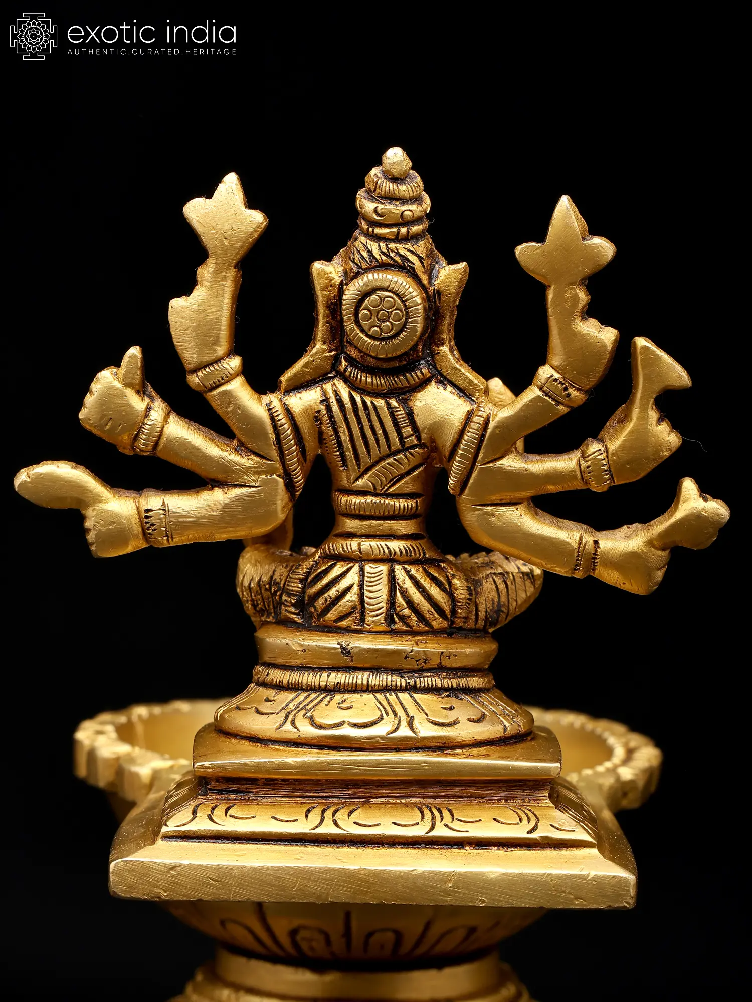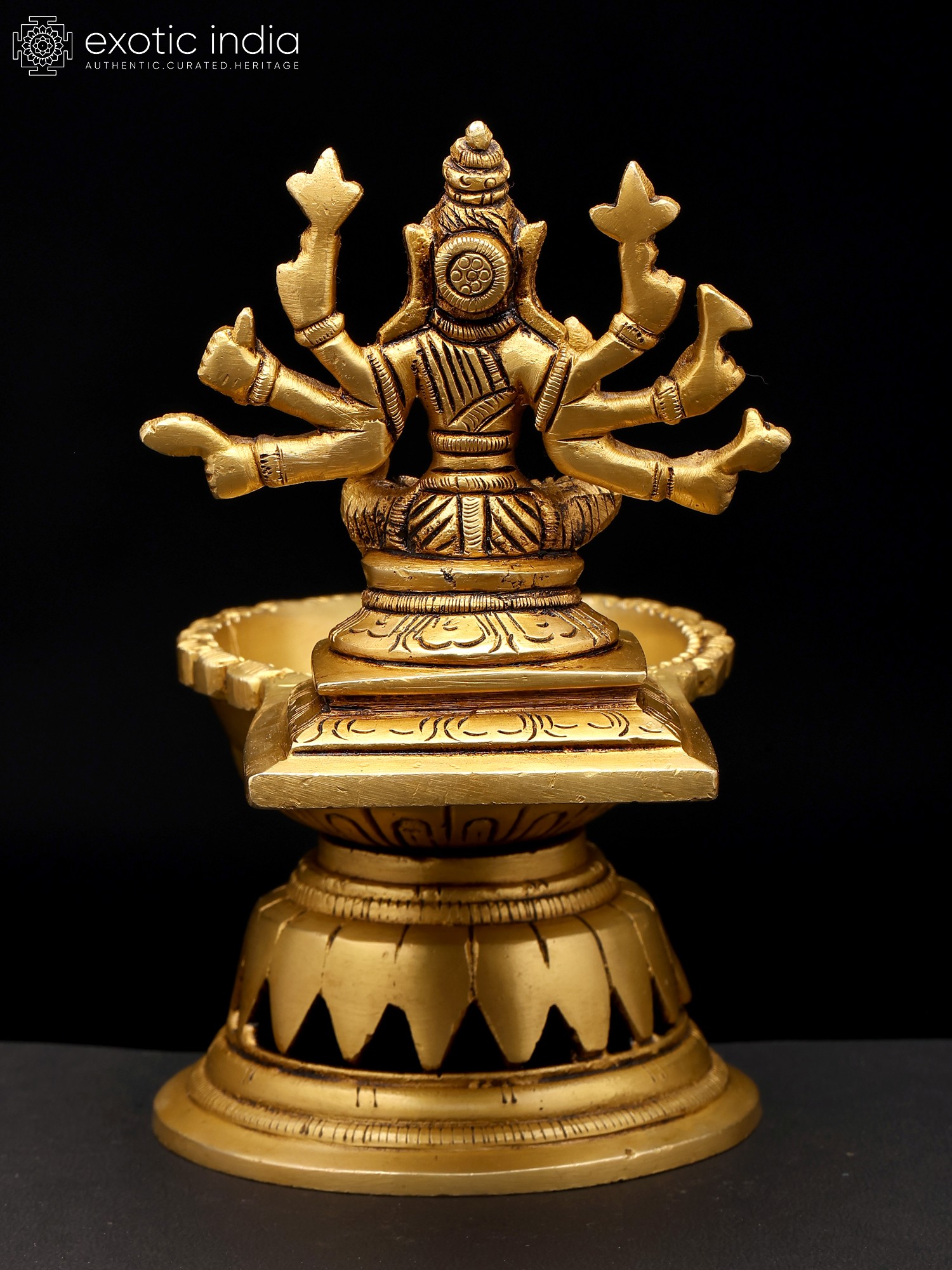 This lamp is more than just a decorative item; it is a functional piece of devotional art. Traditionally, oil lamps, known as "diyas," are lit during festivals and daily prayers to symbolize the dispelling of darkness and ignorance, ushering in knowledge, purity, and enlightenment. The act of lighting a lamp is believed to invite divine presence and blessings. The use of brass, a metal considered auspicious in Hinduism, further enhances the spiritual significance of this lamp. Each detail, from the delicate carvings on the base to the powerful depiction of the goddess, speaks to the skilled hands of Indian artisans who have preserved these ancient techniques for generations.