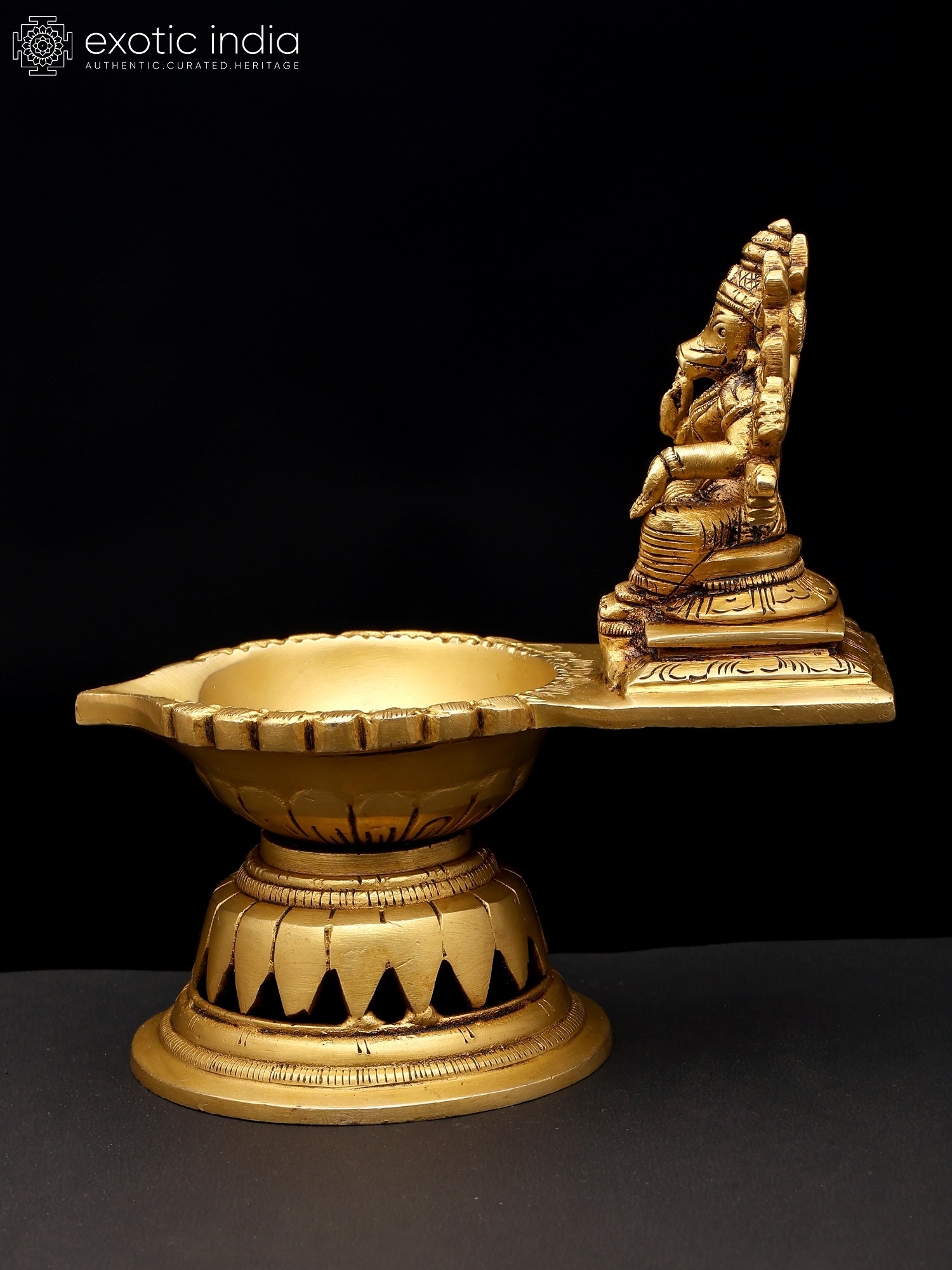 Illuminating your sacred space and invoking the blessings of a powerful goddess, this exquisite brass lamp is a testament to ancient Indian craftsmanship and spiritual devotion. Standing at approximately six inches tall, it features an intricately sculpted depiction of Goddess Varahi, a formidable and benevolent deity revered for her prowess in overcoming obstacles and safeguarding her devotees. The rich, warm hue of the brass, meticulously polished, reflects the divine radiance of the goddess herself, promising to imbue your home with peace and prosperity.