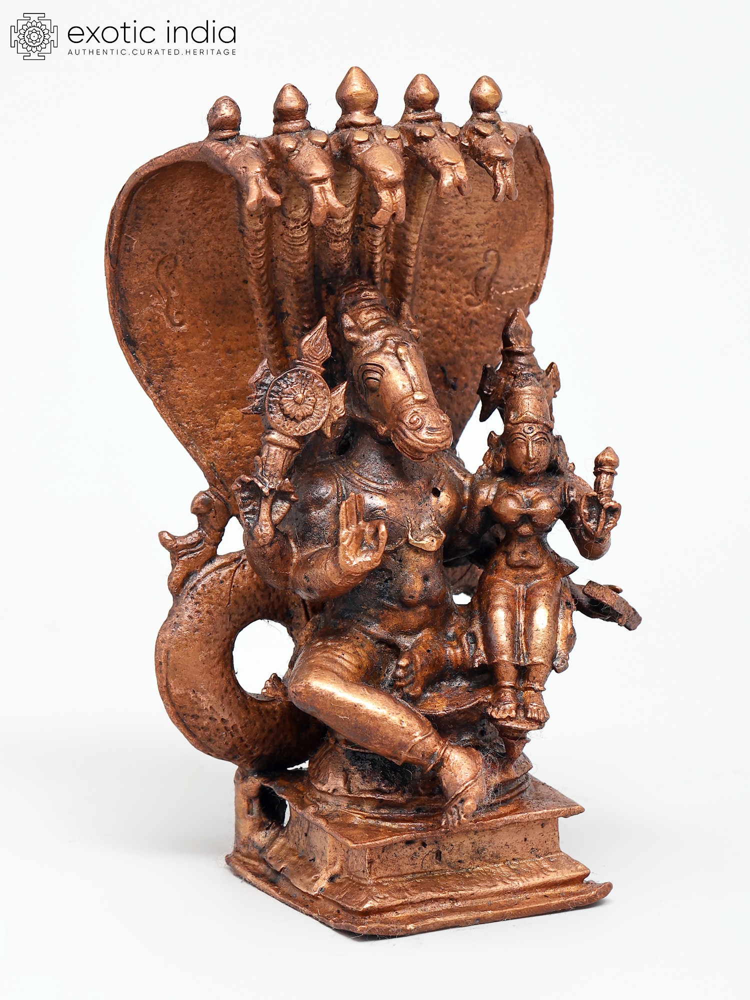 6" Small Lord Narasimha with Devi Lakshmi Protected by Sheshnag | Copper Statue